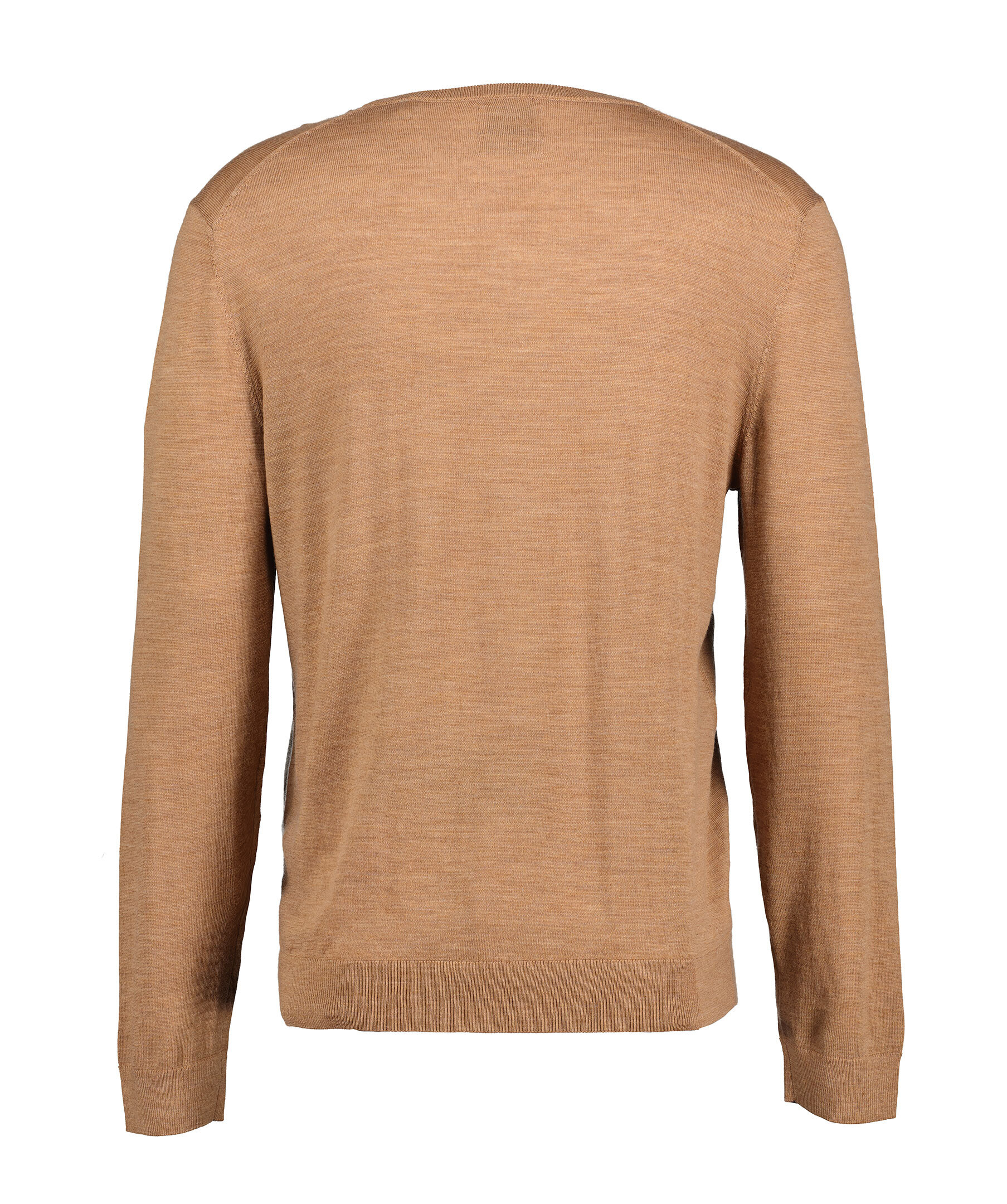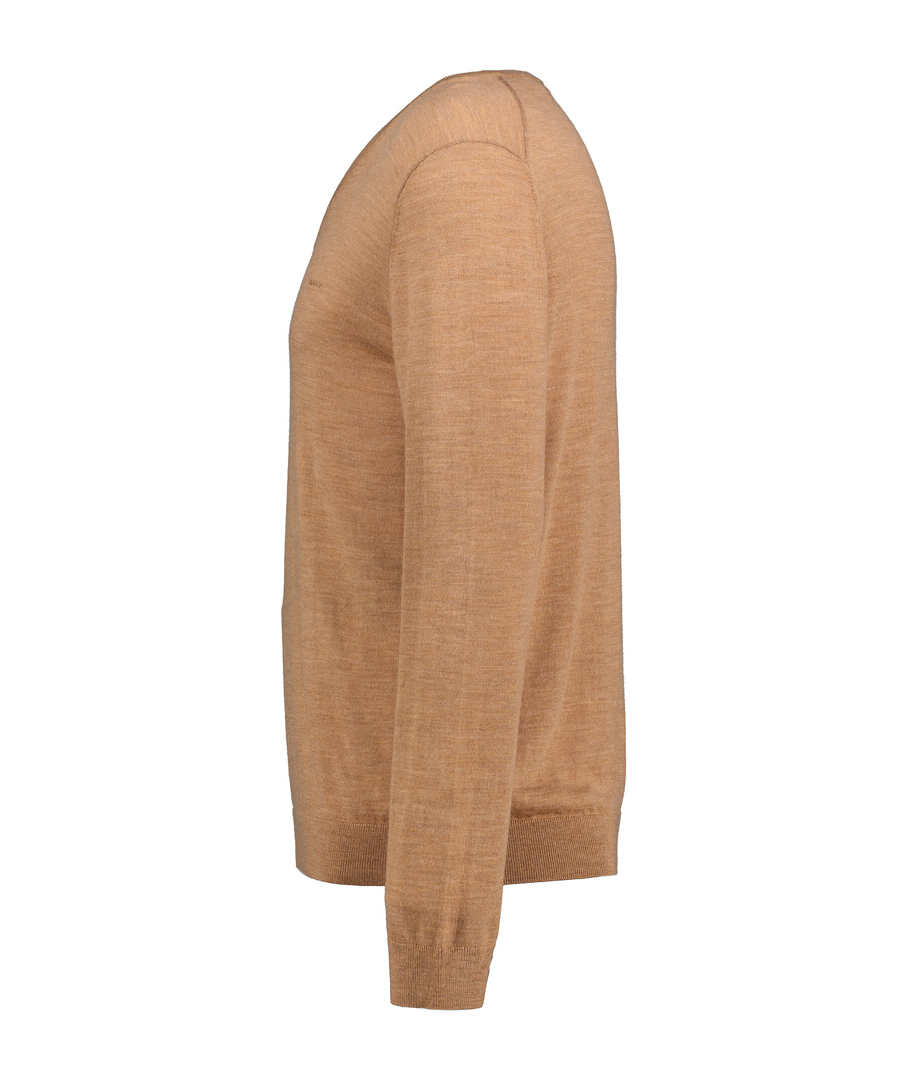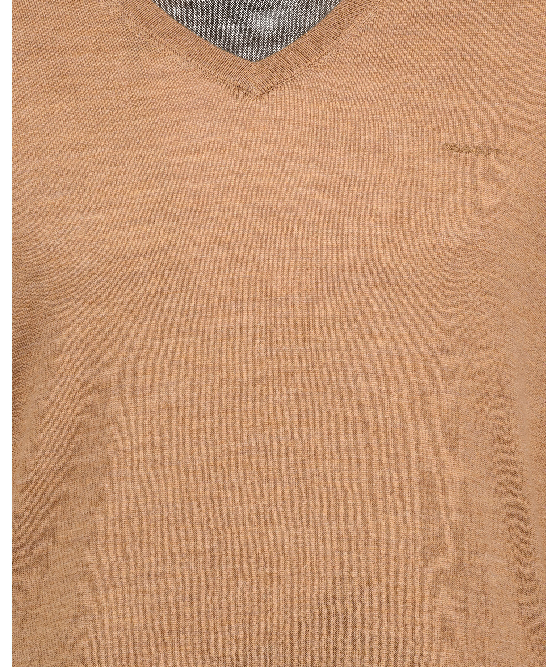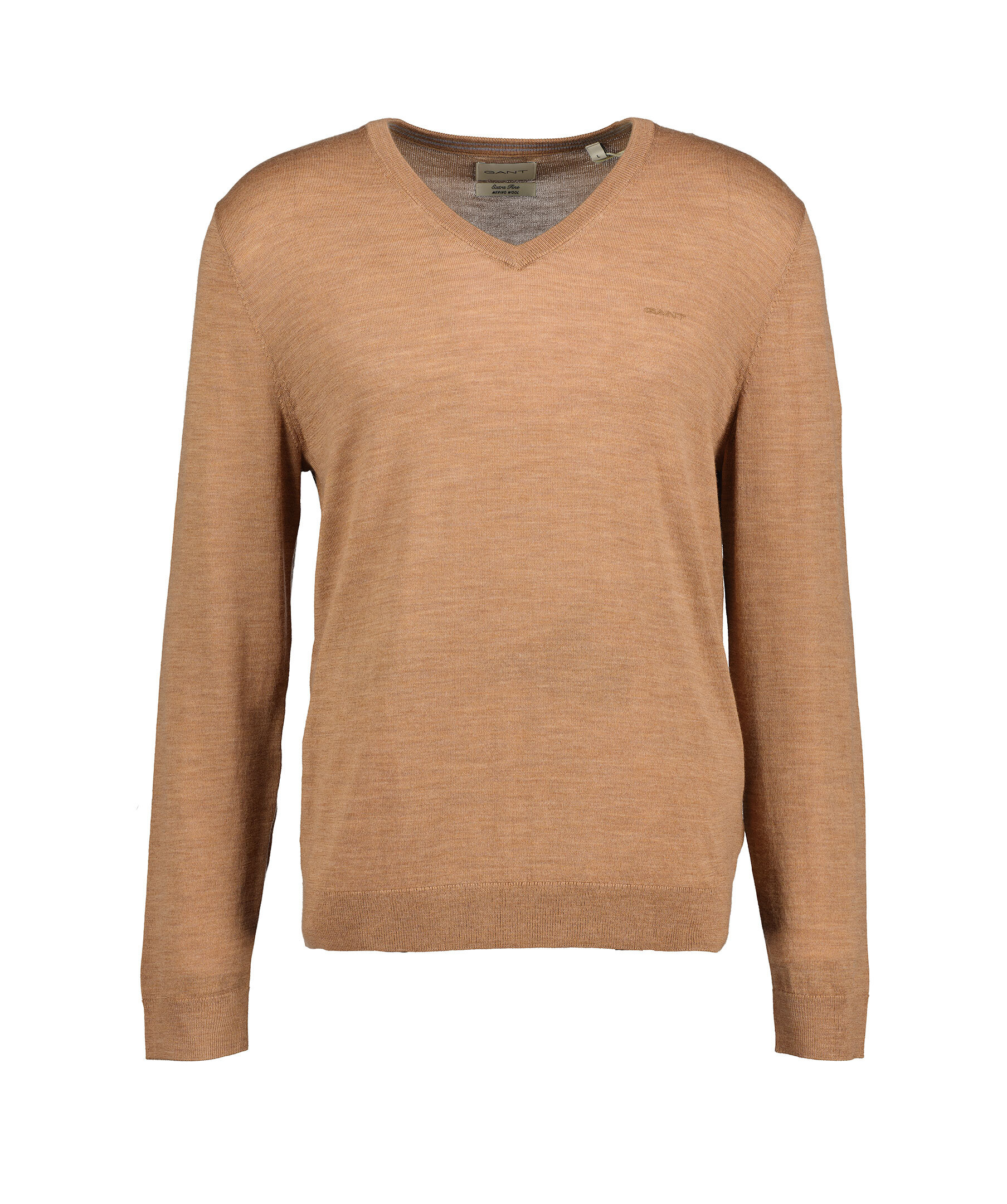 Beige, stickad tröja från Gant. Tröjan har en v-ringad, ribbstickad halsringning, ribbstickade muddar vid ärm- och plaggslut samt en liten broderad logotyp på bröstet. Tillverkad i 100% merinoull.
