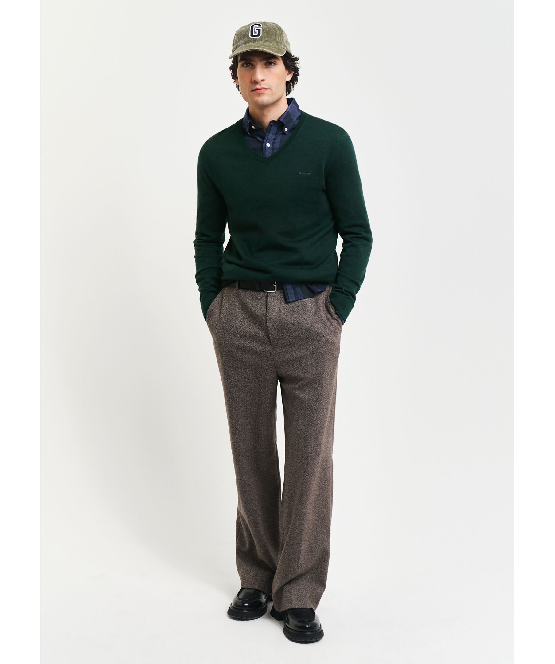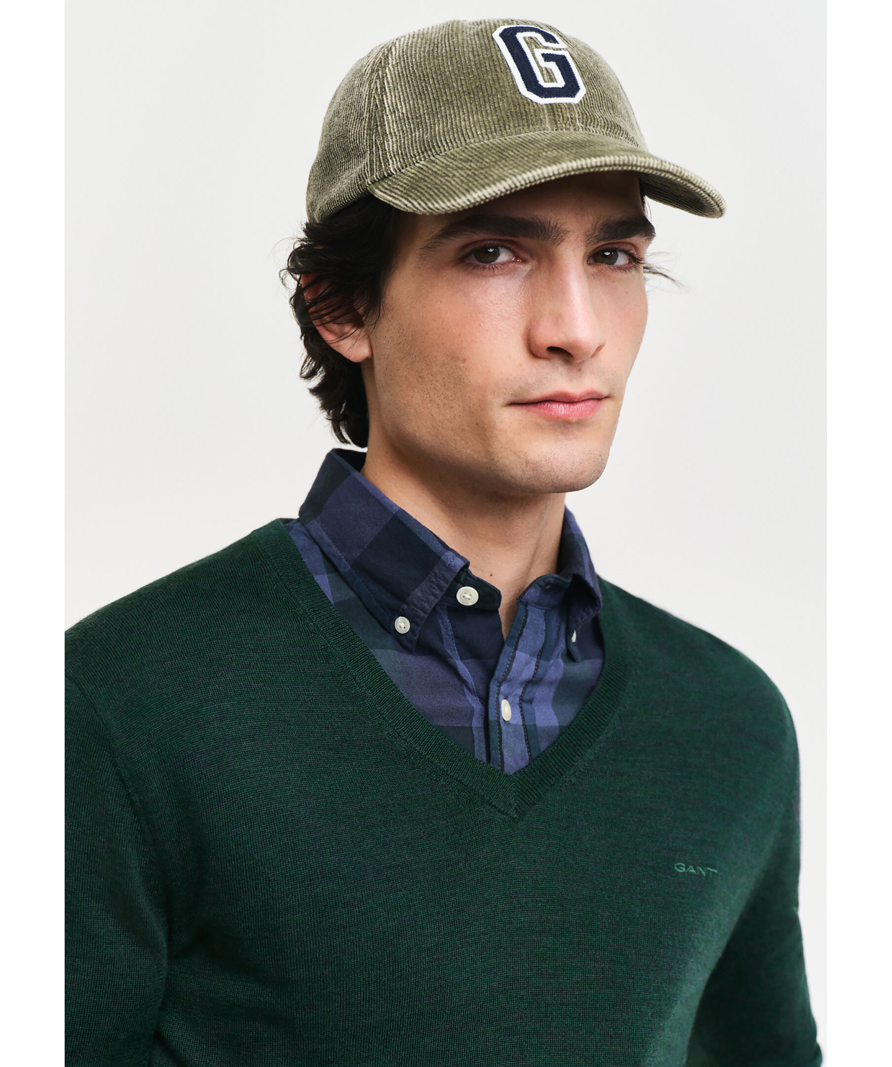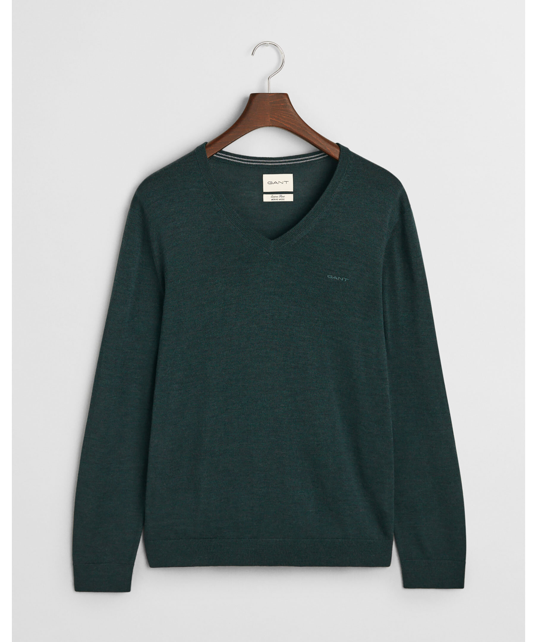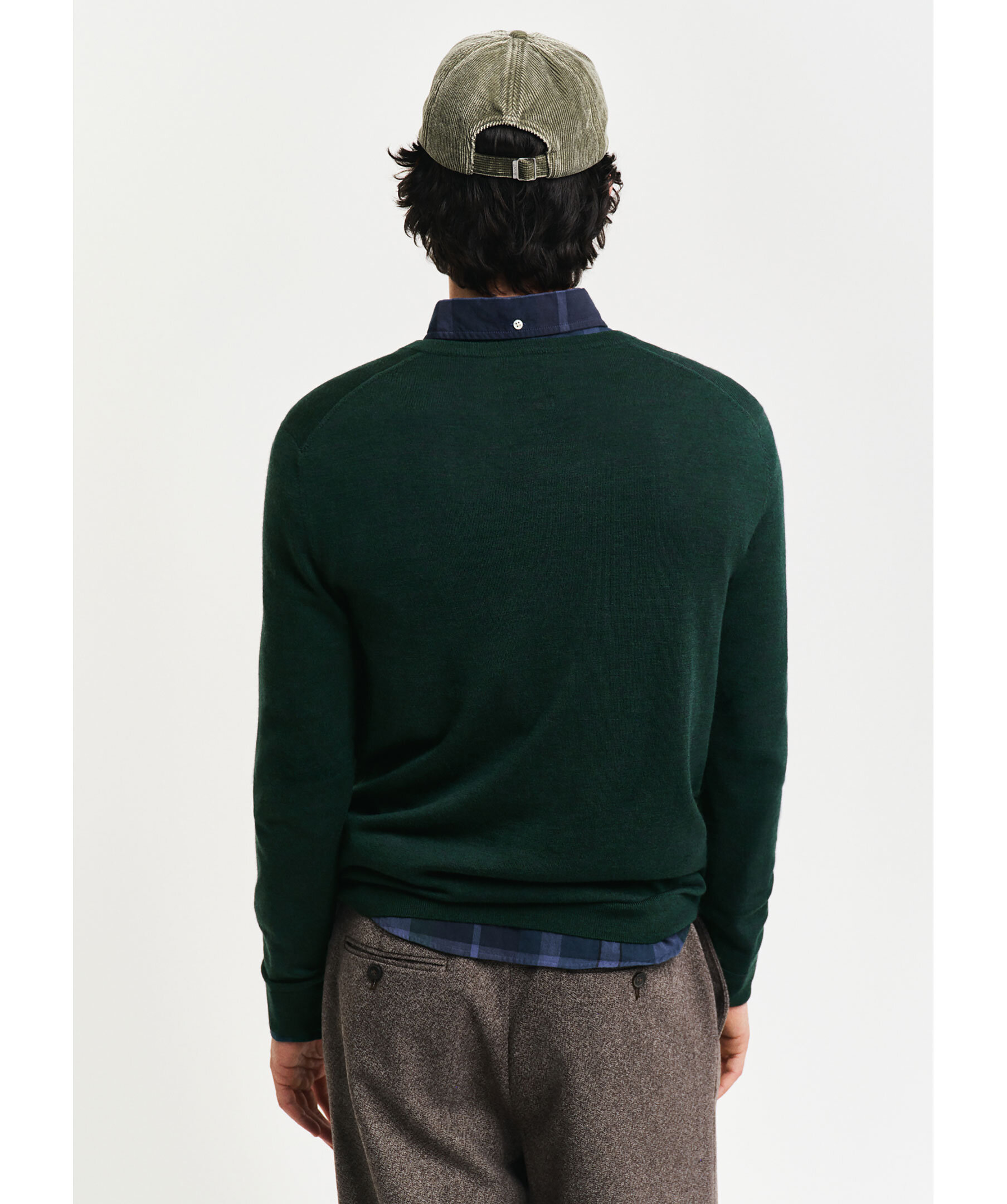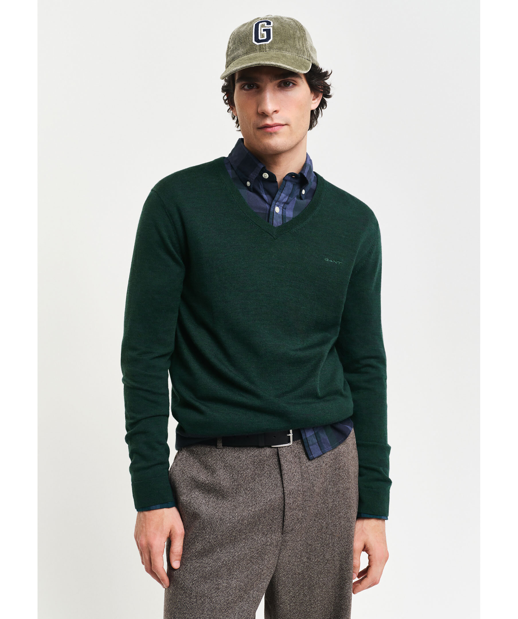 Mörkgrön, stickad tröja från Gant. Tröjan har en v-ringad, ribbstickad halsringning, ribbstickade muddar vid ärm- och plaggslut samt en liten broderad logotyp på bröstet. Tillverkad i 100% merinoull.