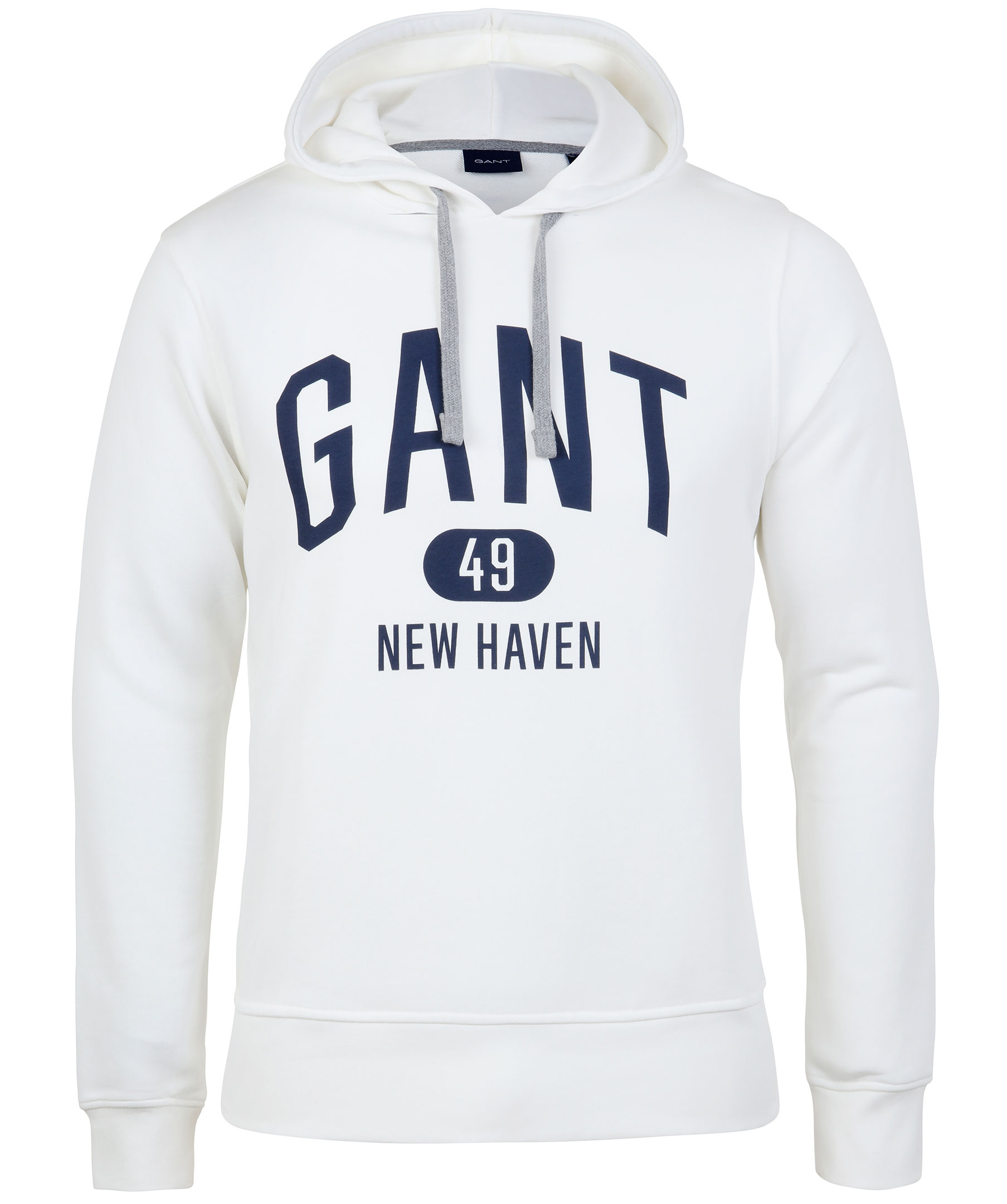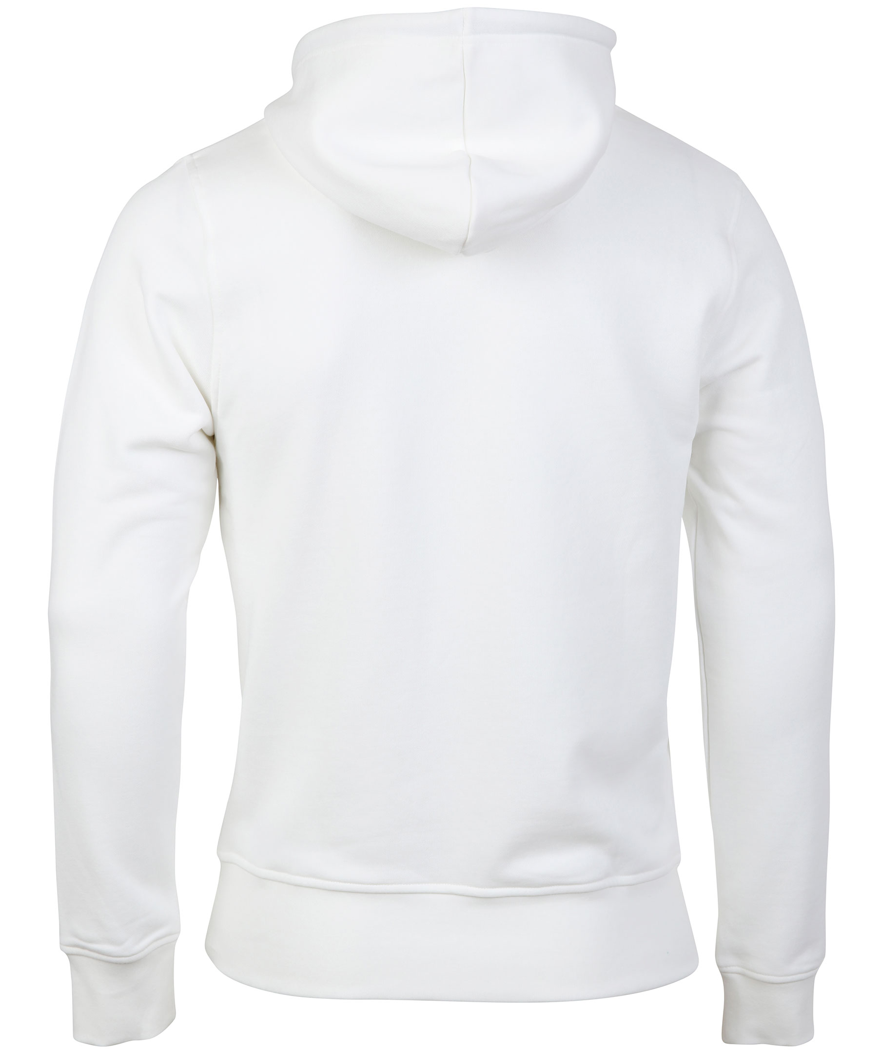 Vit hoodie från Gant. Tillverkad i bomullsmix. Stort blått tryck på bröstet, grå snören och ribbade muddar.