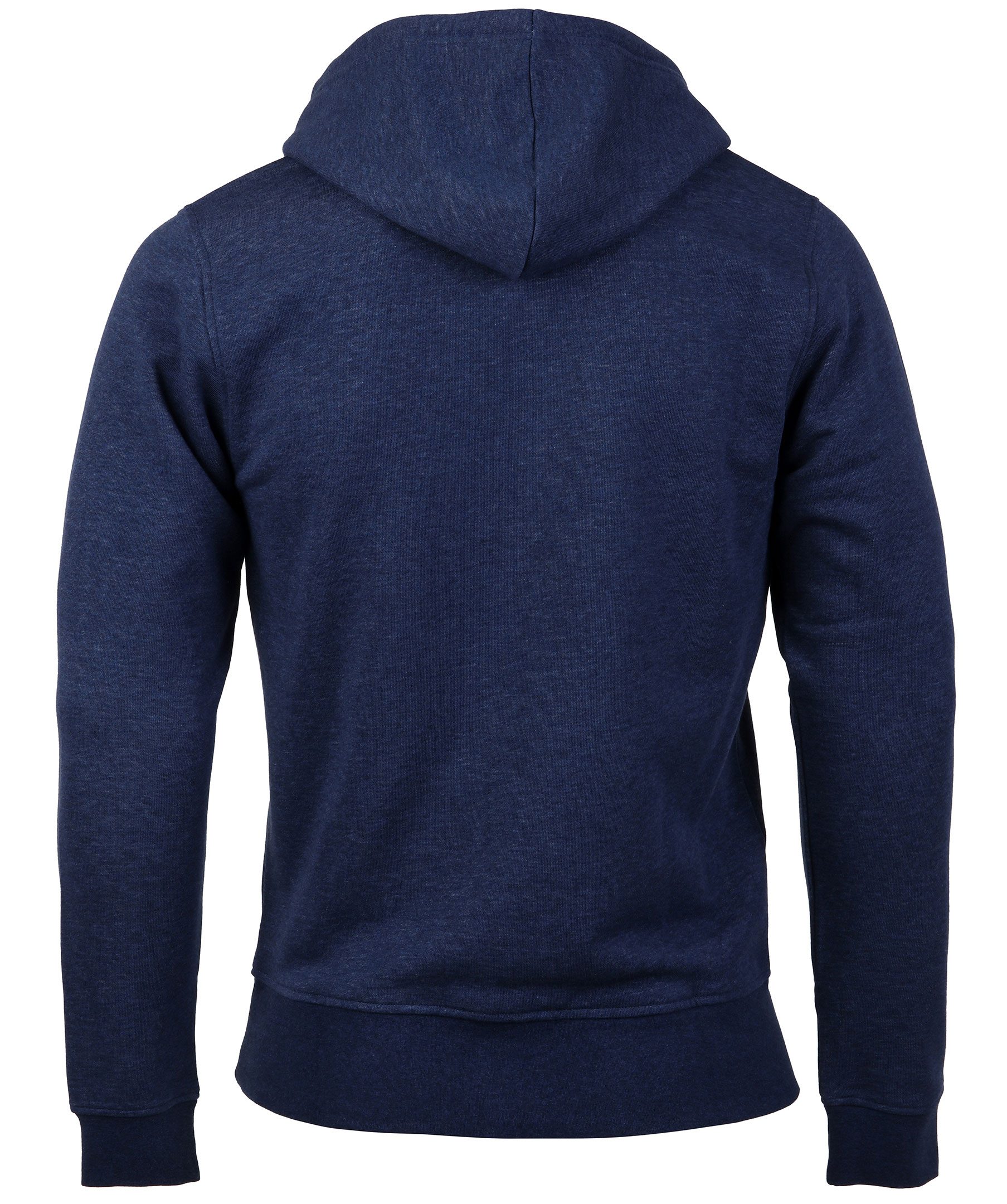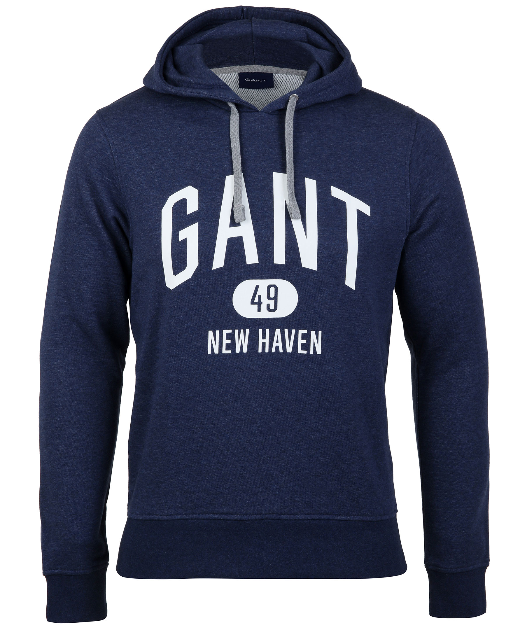 Marinblå hoodie från Gant. Tillverkad i bomullsmix. Stort vitt tryck på bröstet, grå snören och ribbade muddar.