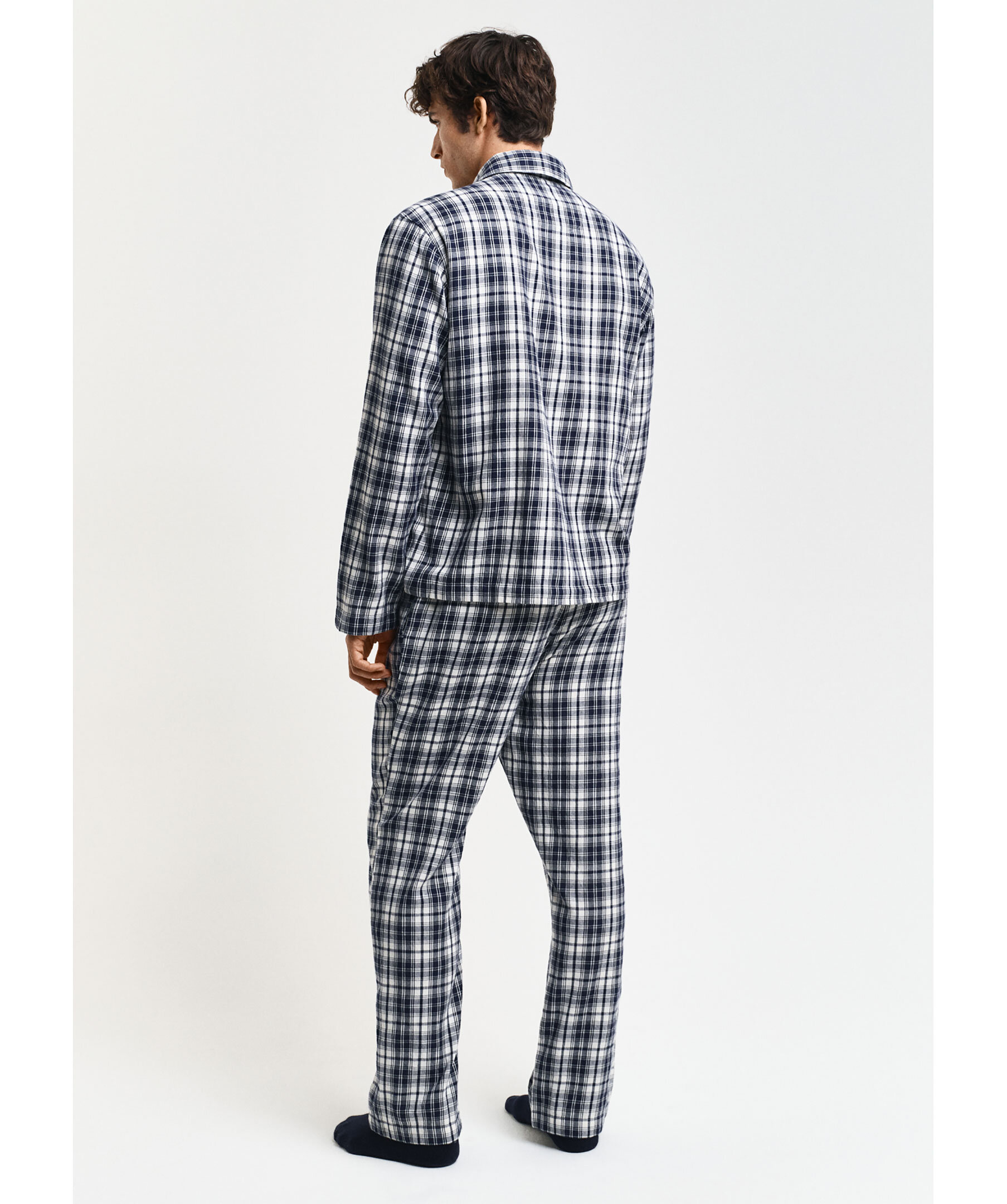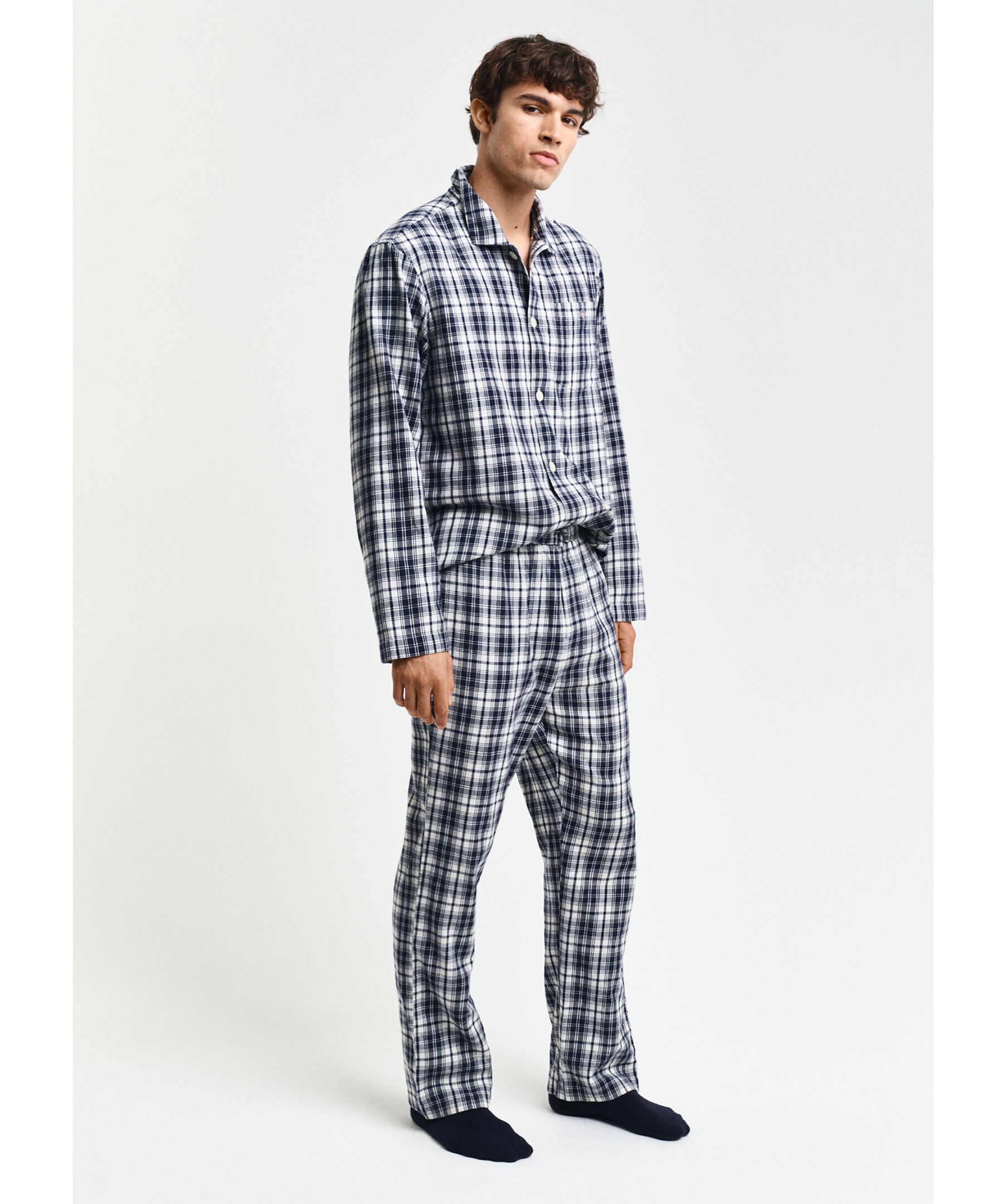 Blå och vitrutig pyjamas set från Gant. Flanellpyjamas men skjorta och byxor i regular fit. Skjortan knäpps framtill med knappar och har en broderad liten Gant logotyp på bröstfickan. Byxorna har sidofickor och elastisk midja med snörning. Tillverkad av 100% bomull.