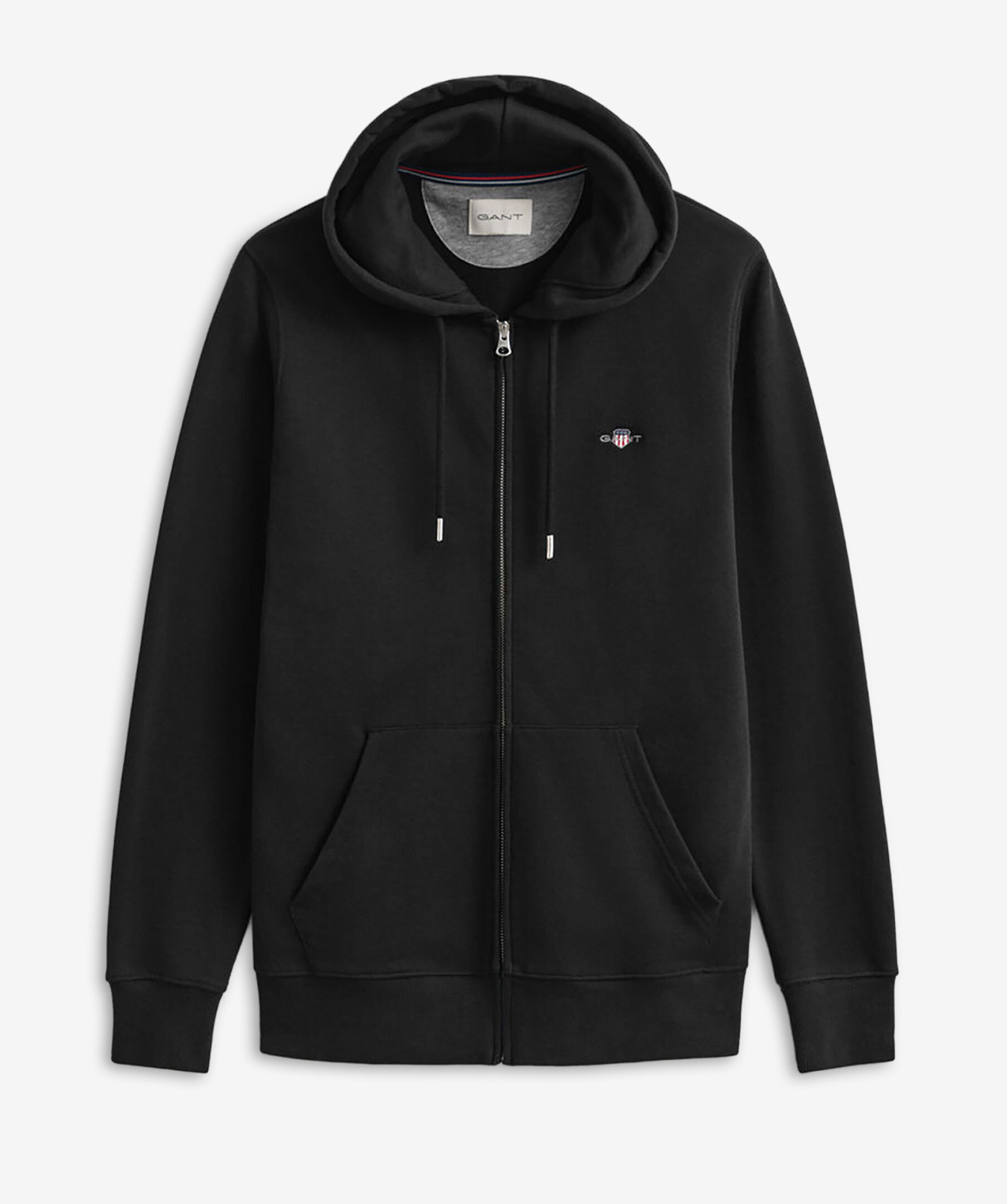 Svart hoodie med huva och liten sköldlogotyp broderad på bröstet från Gant. Hel dragkedja och magficka fram. Tillverkad i en bomullsblandning.