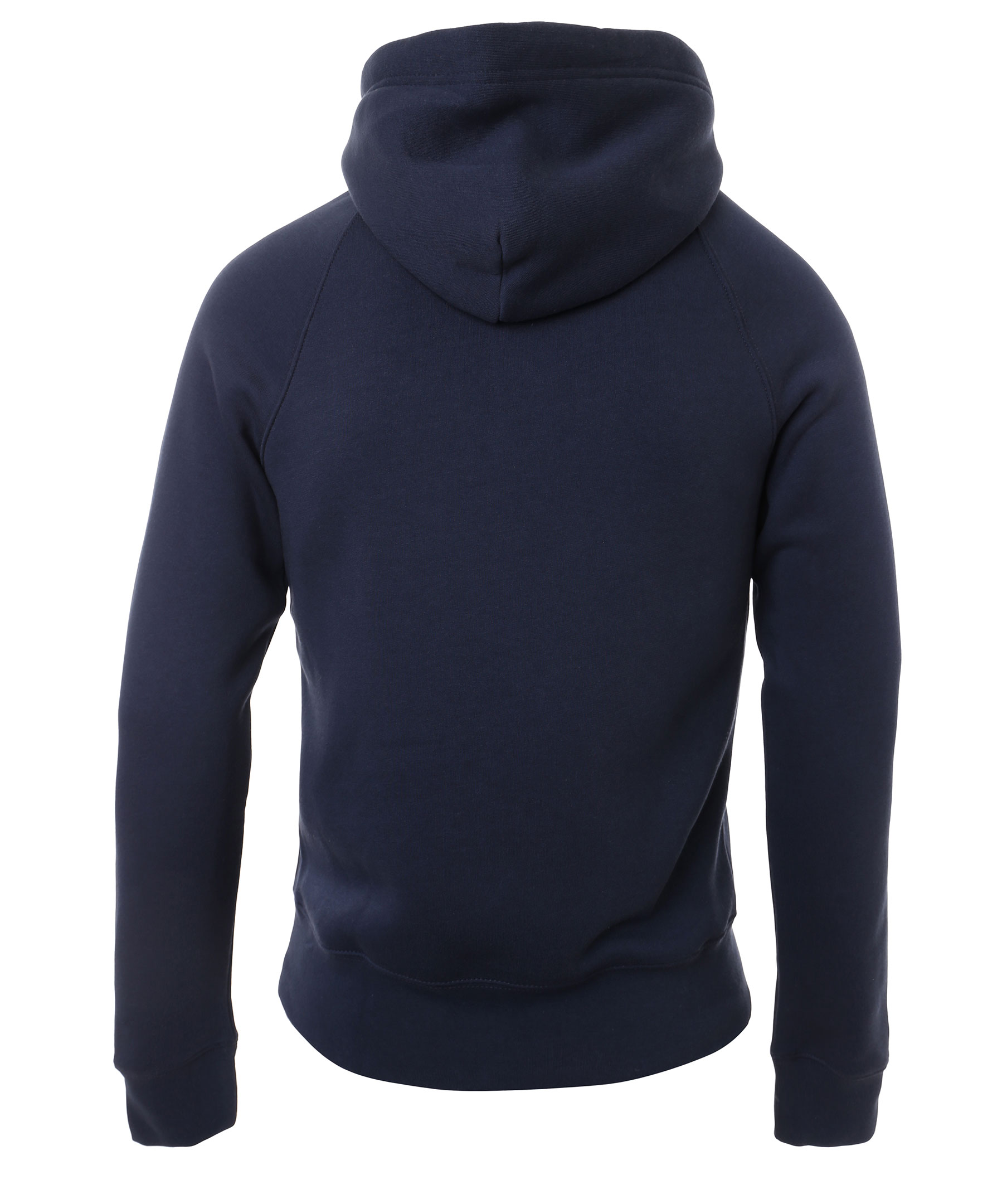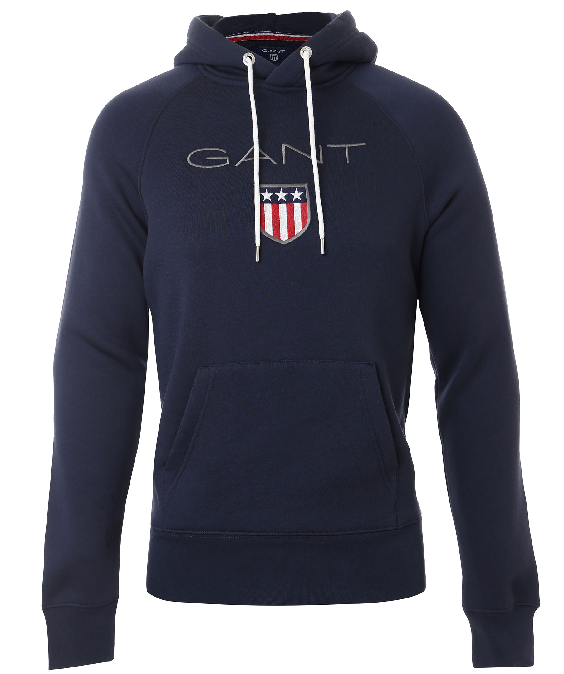 Marinblå reglerbar luvtröja från Gant med mjuk insida, magficka, broderi på bröstet samt ribbstickade muddar.