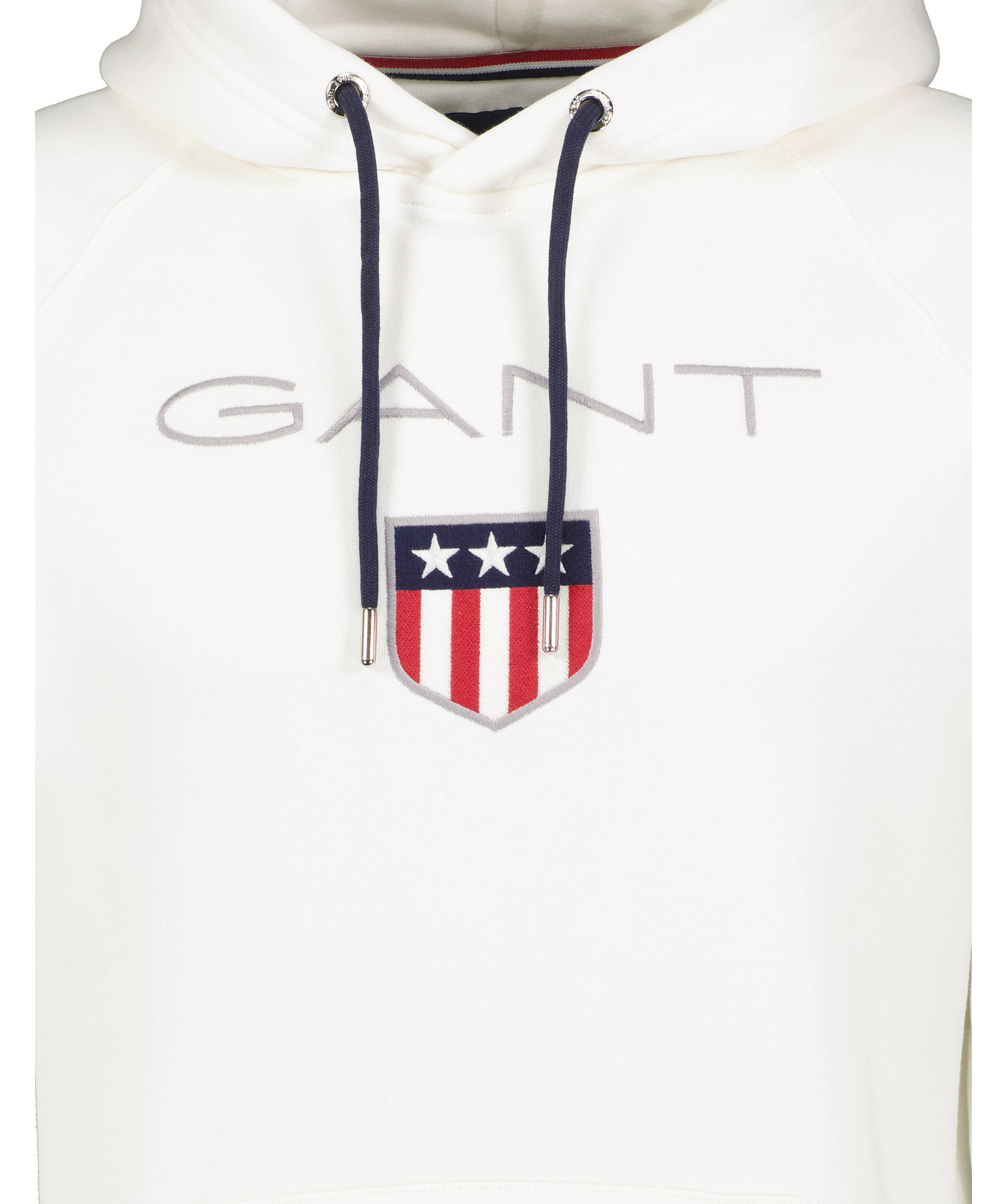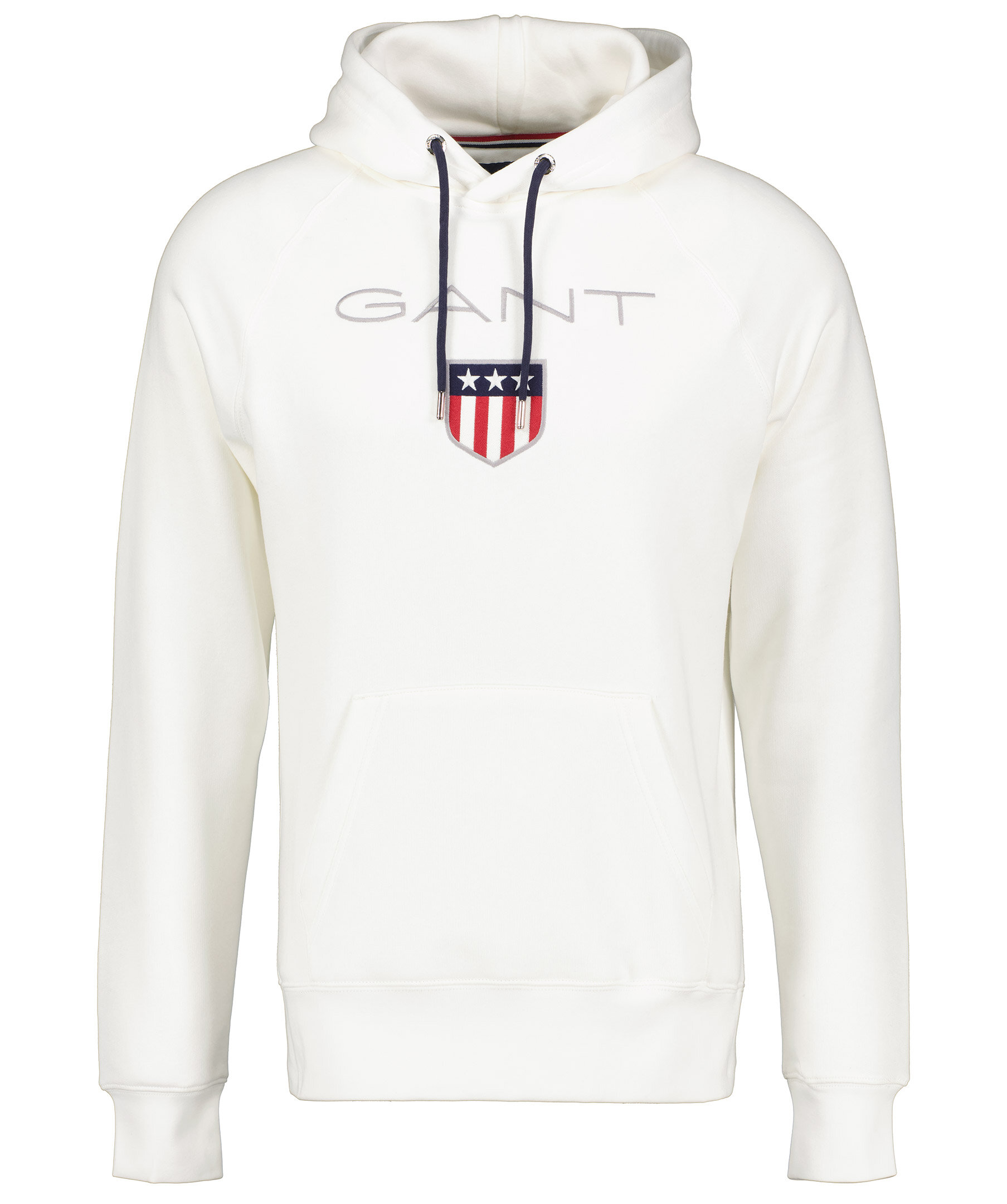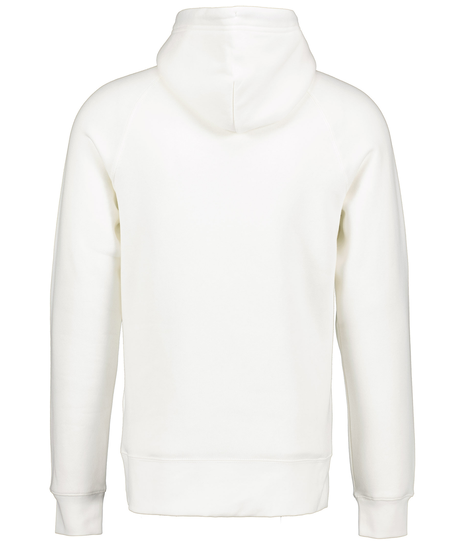Vit hoodie från Gant. Huva med dragsko, ribbstickade muddar vid ärmslut och nedtill. Normal passform. Stor broderad logga på bröstet. Känguruficka på magen.