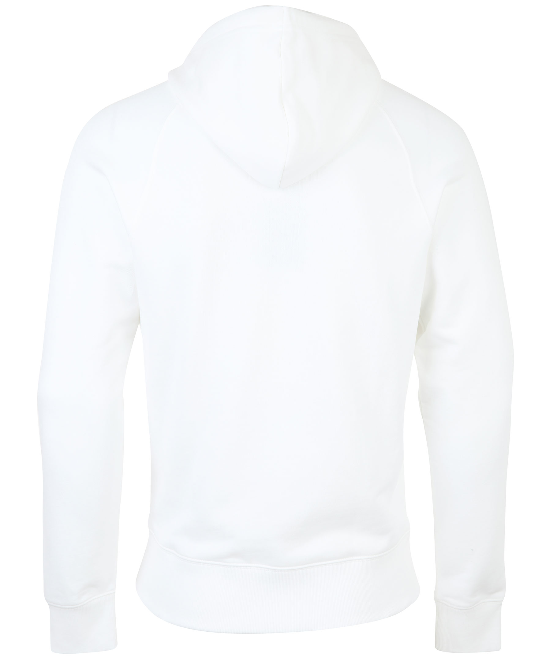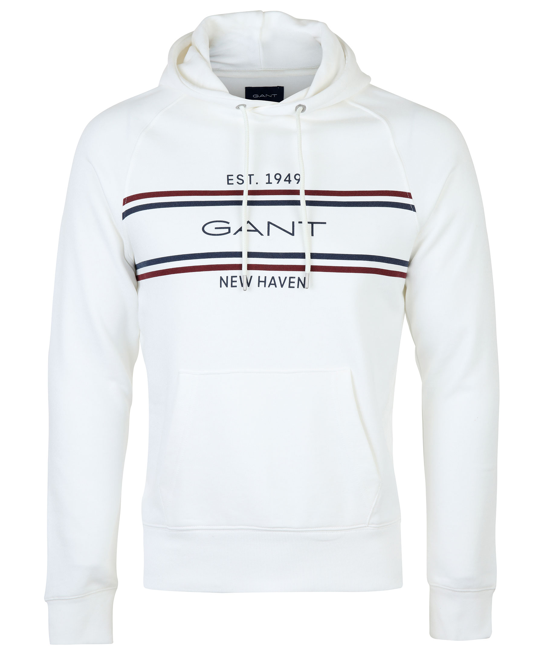 Vit hoodie från Gant med stort tryck med logotyp och ränder på bröstet. Ficka på magen, snörning i luva samt ribbade muddar i ärmslut och plaggslut. tillverkad i bommul och polyester.