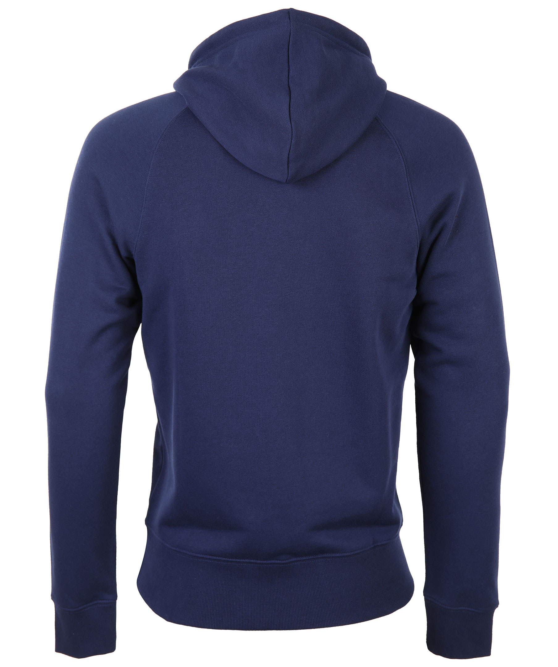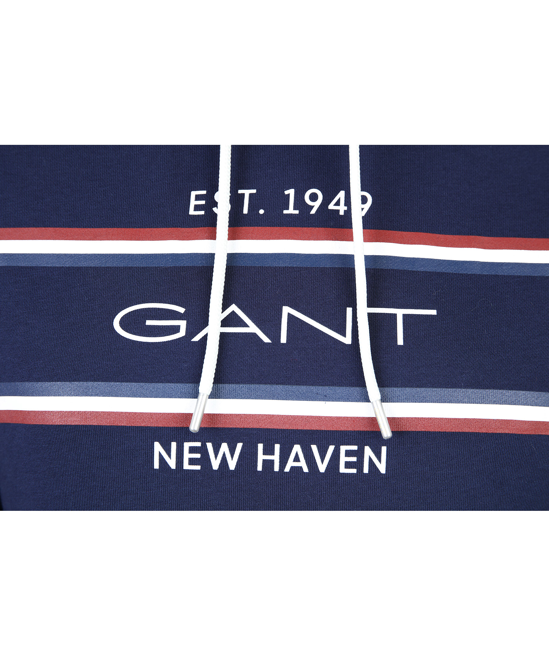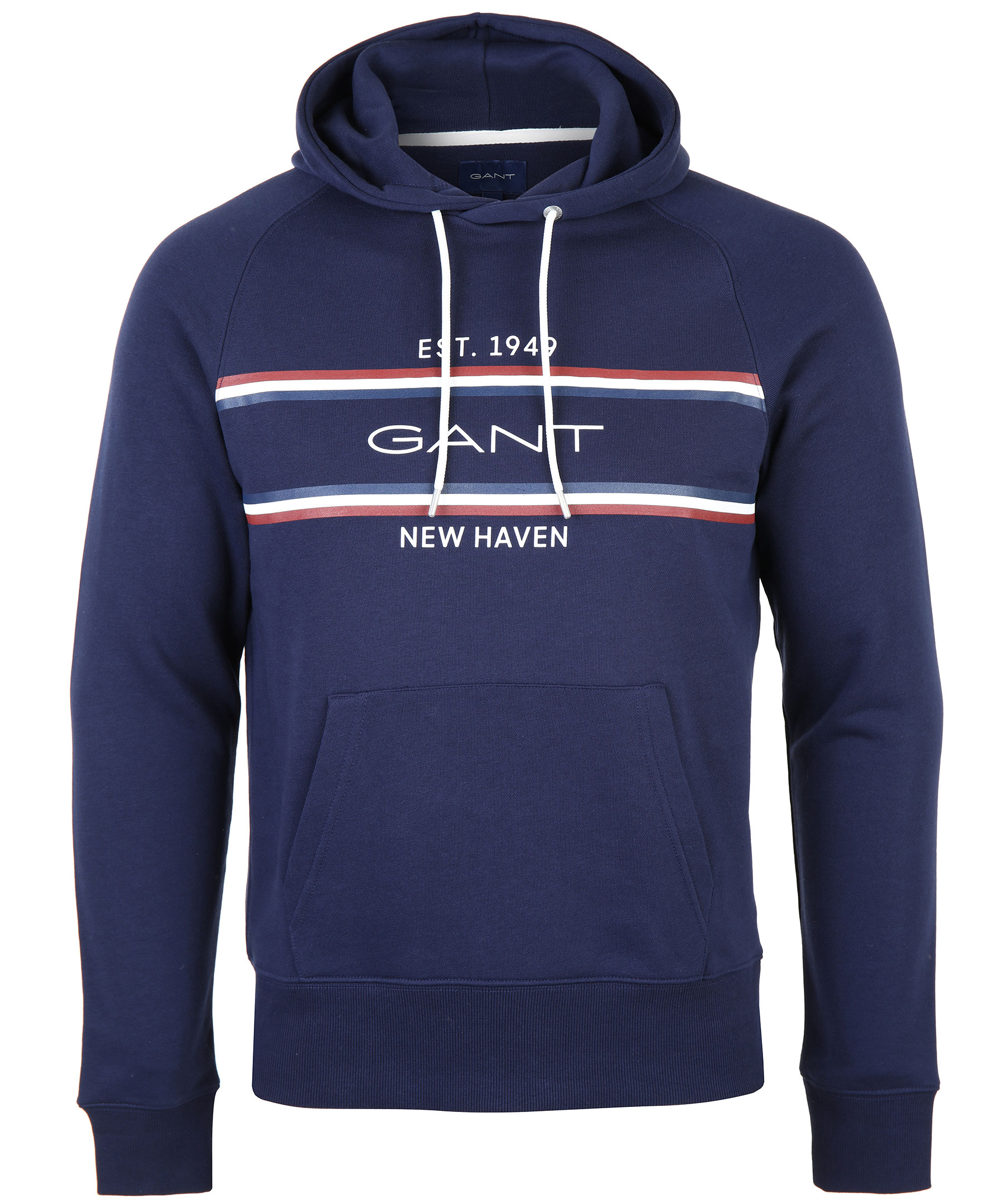 Marinblå hoodie från Gant med stort tryck med logotyp och ränder på bröstet. Ficka på magen, snörning i luva samt ribbade muddar i ärmslut och plaggslut. tillverkad i bommul och polyester.