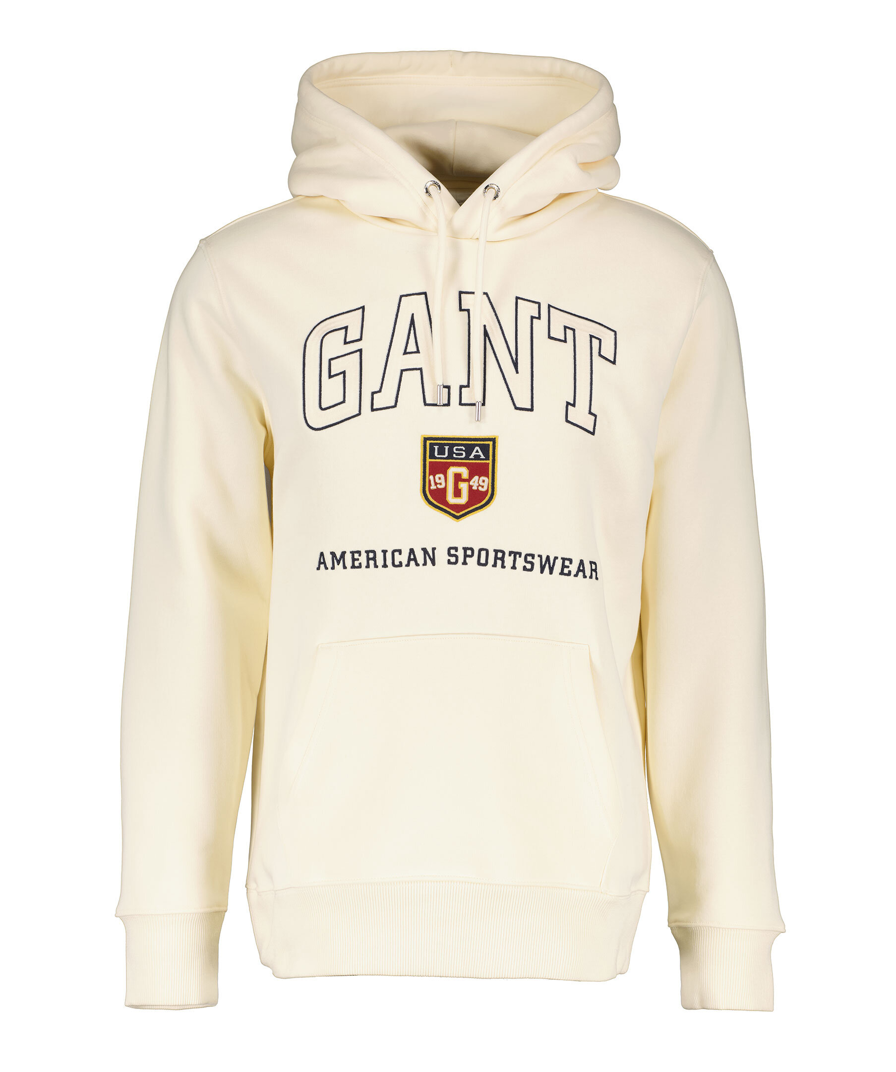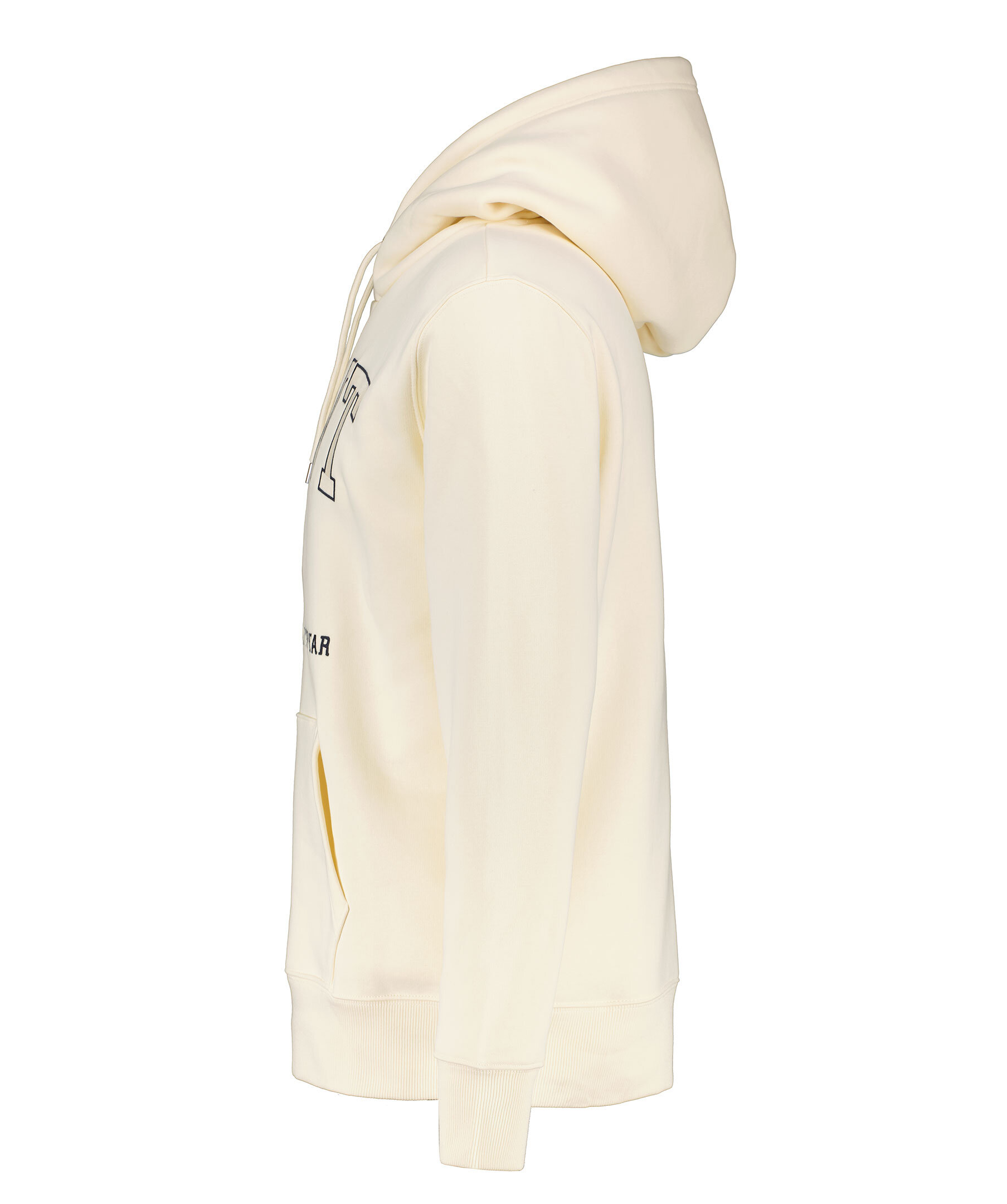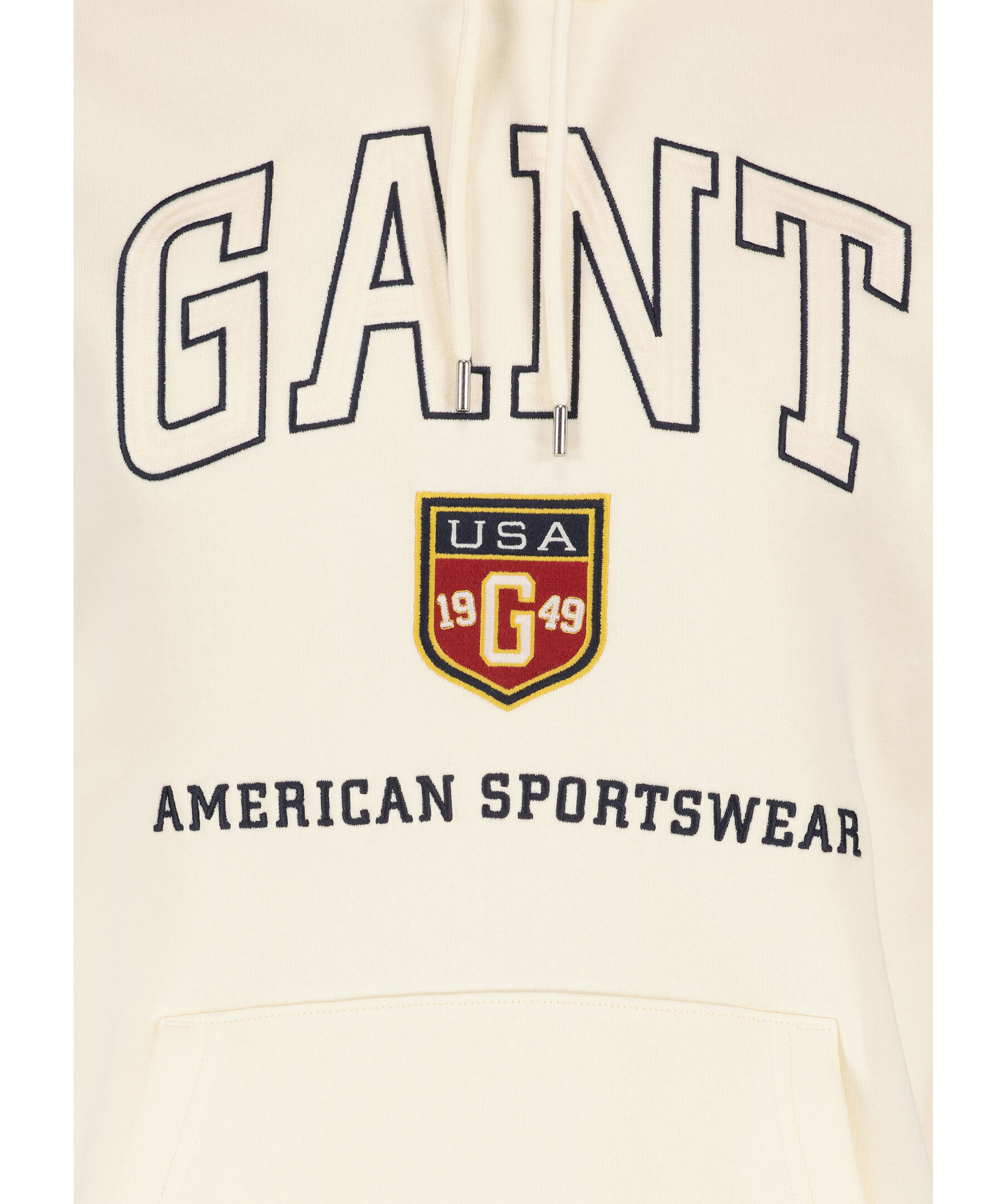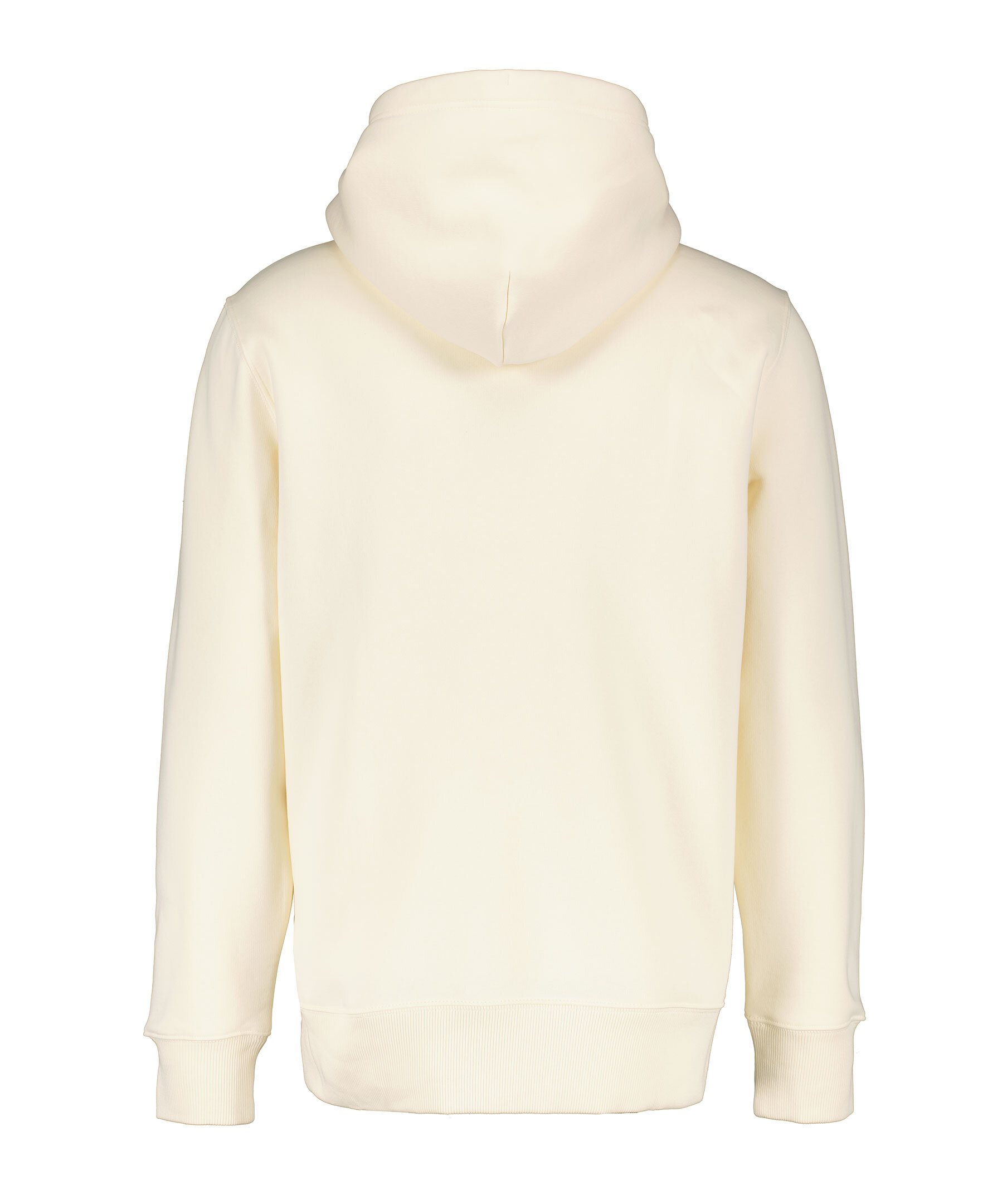 Krämvit hoodie från Gant. Stor broderad logotyp på framsidan, huva med dragsko samt känguruficka på magen. Tillverkad i en bomullsblandning.