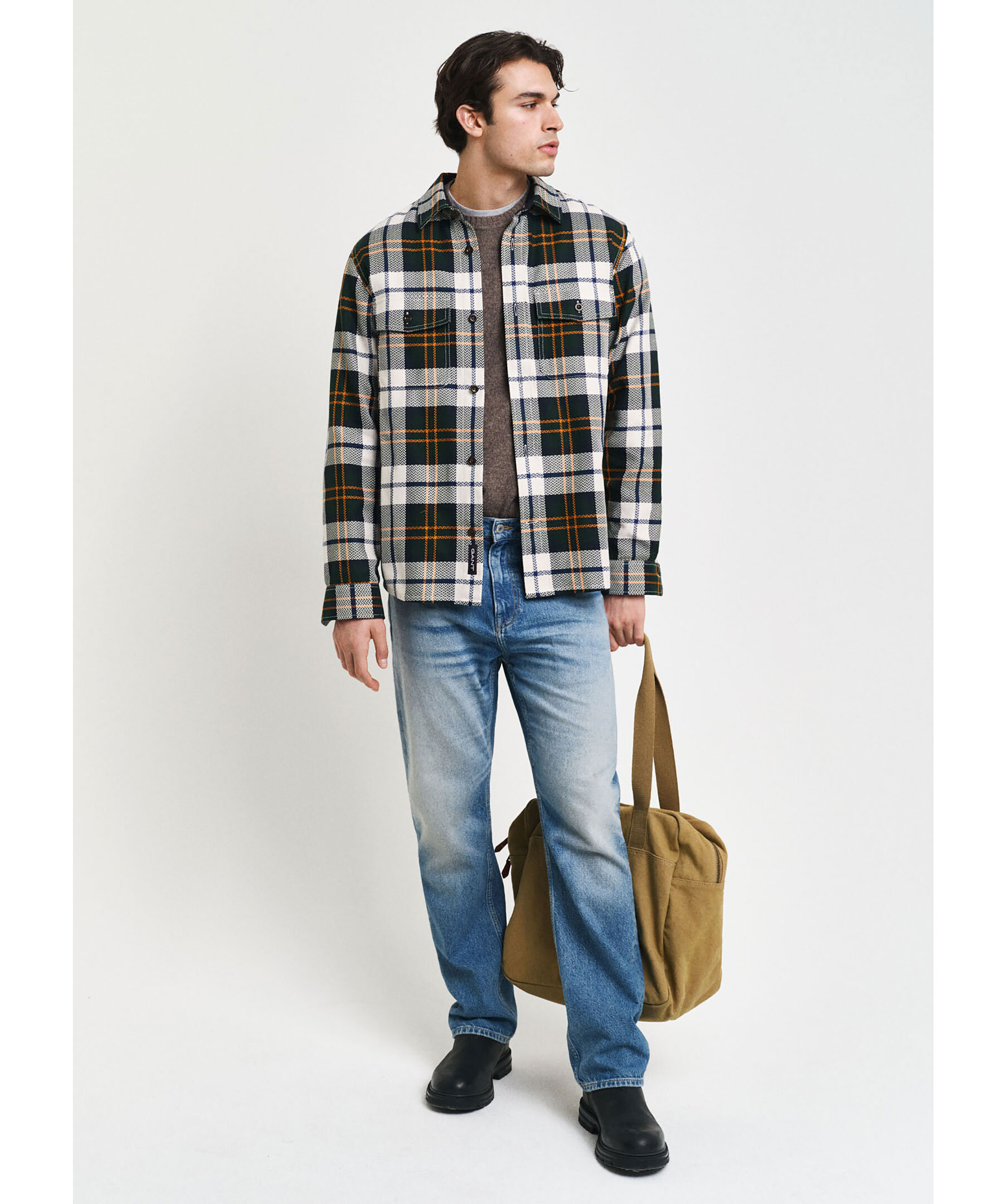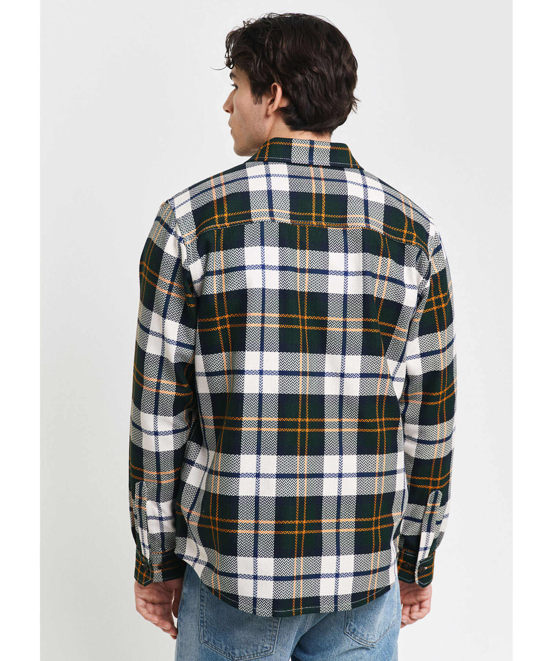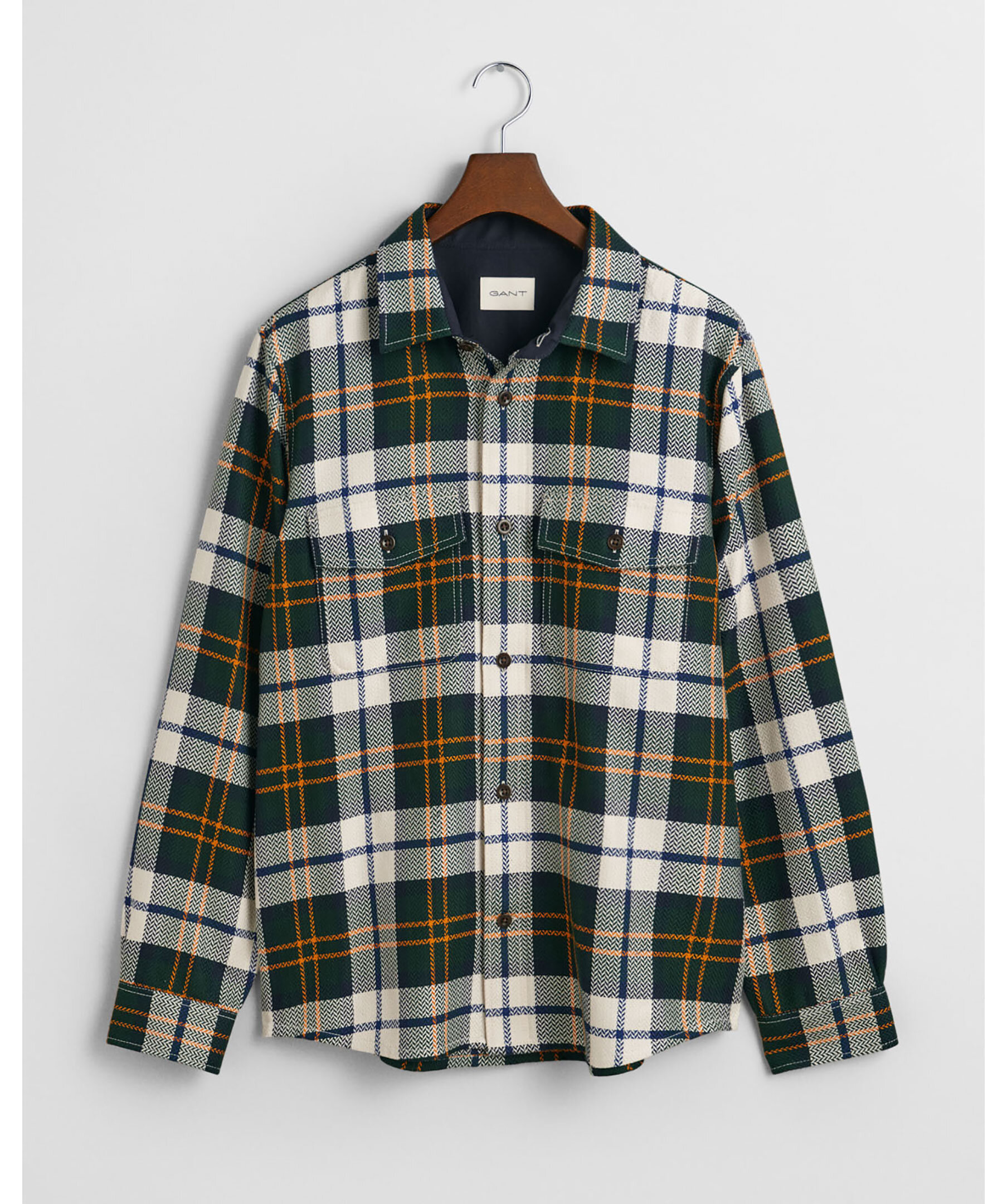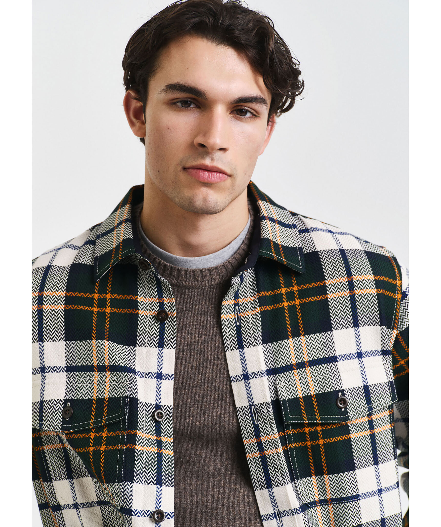 Grönrutig overshirt från Gant. Overshirten har ett heltäckande rutmönster med fiskbensstruktur, point-krage, två bröstfickor med lock, justerbara ärmslut, rundad fåll samt corozoknappar. Tillverkad i bomull.