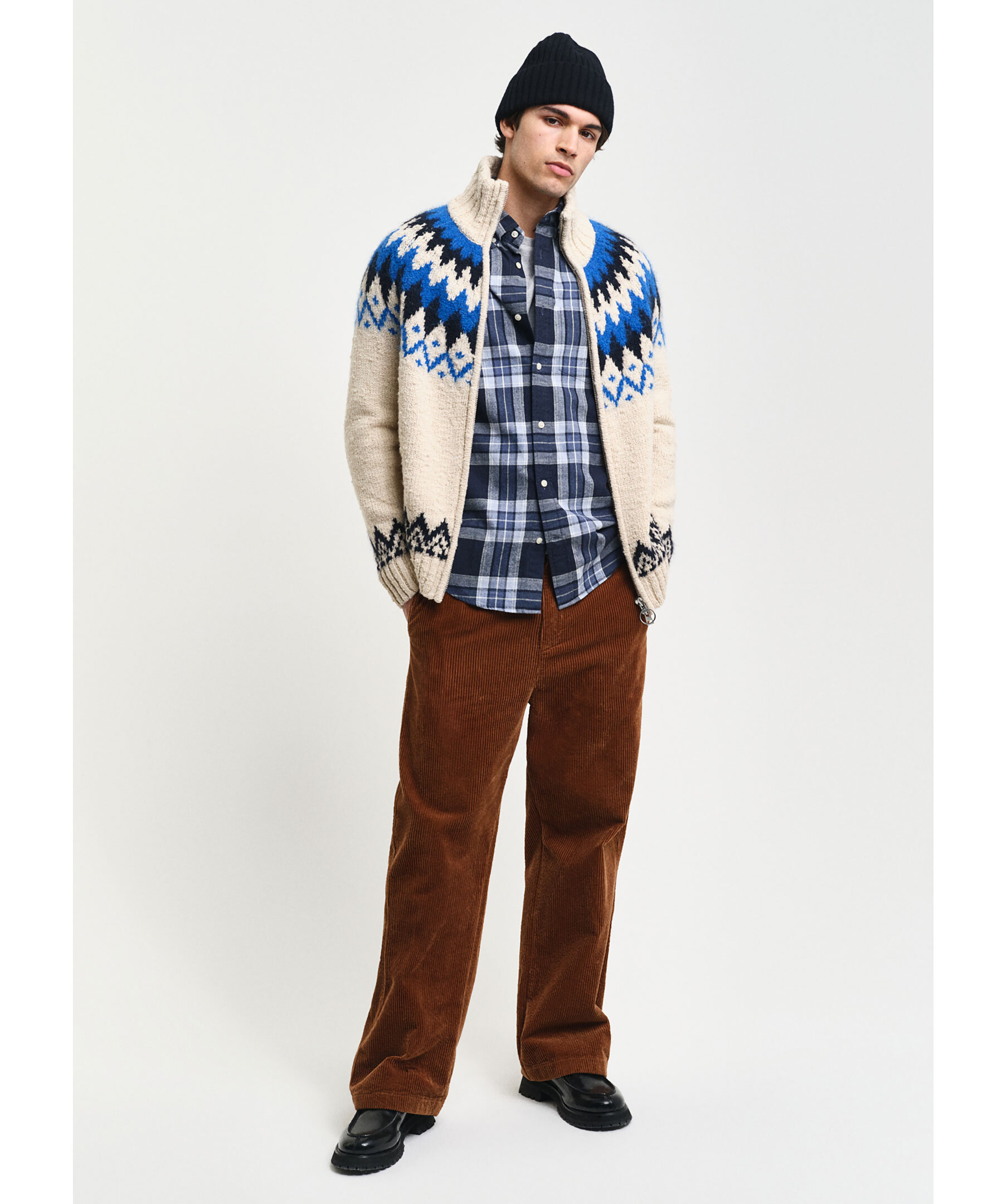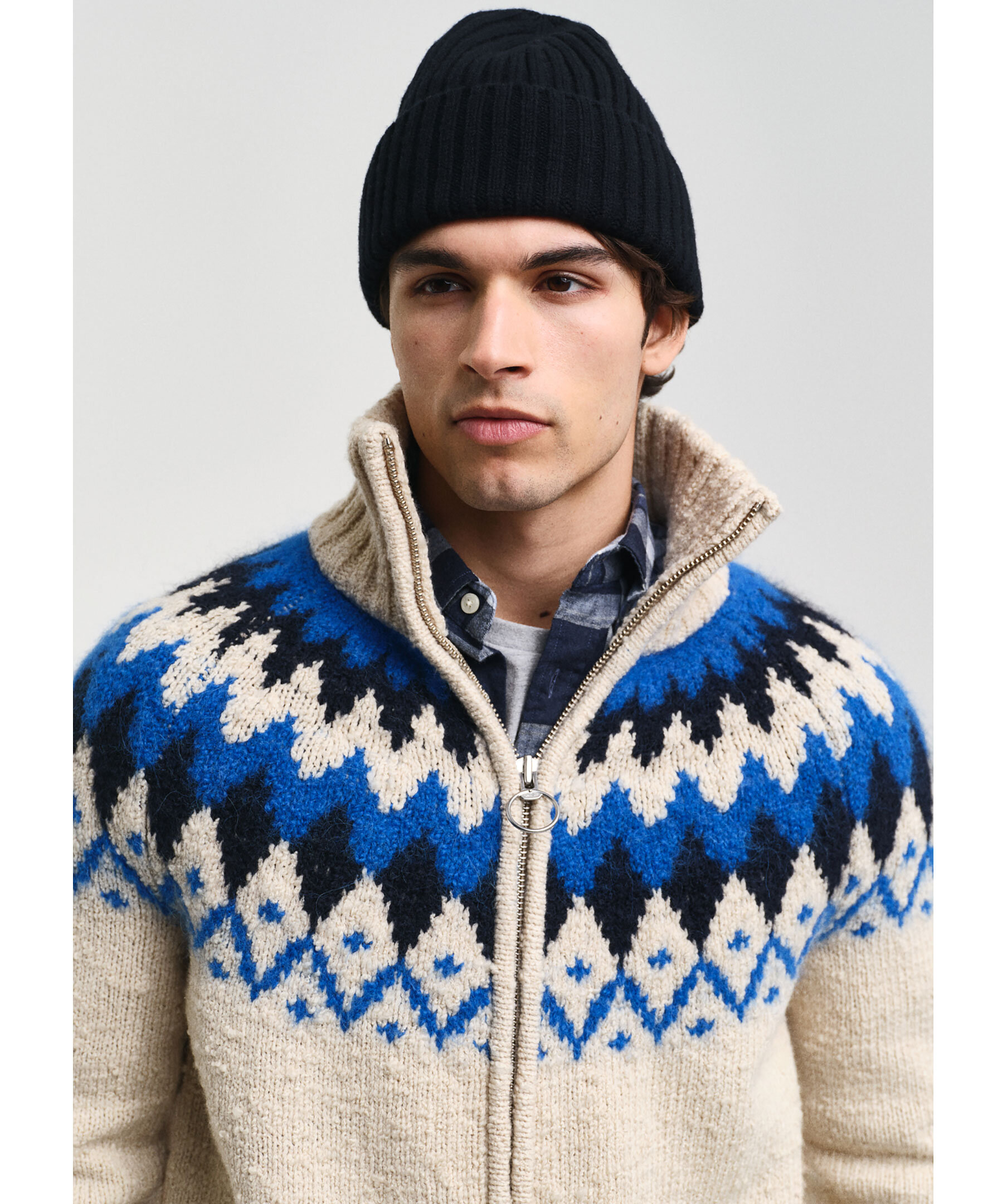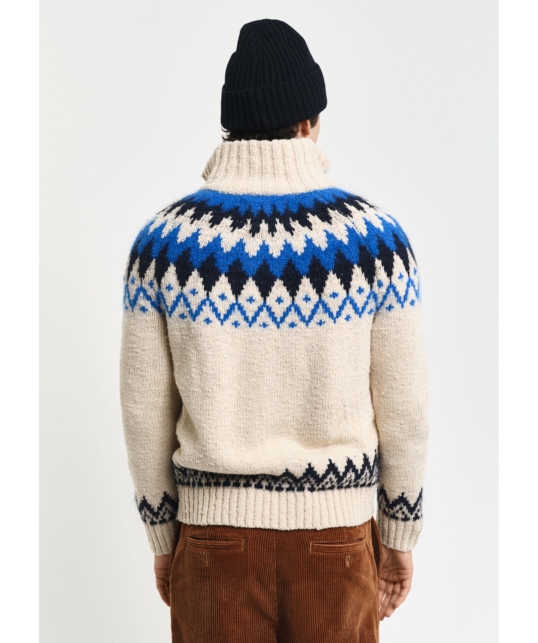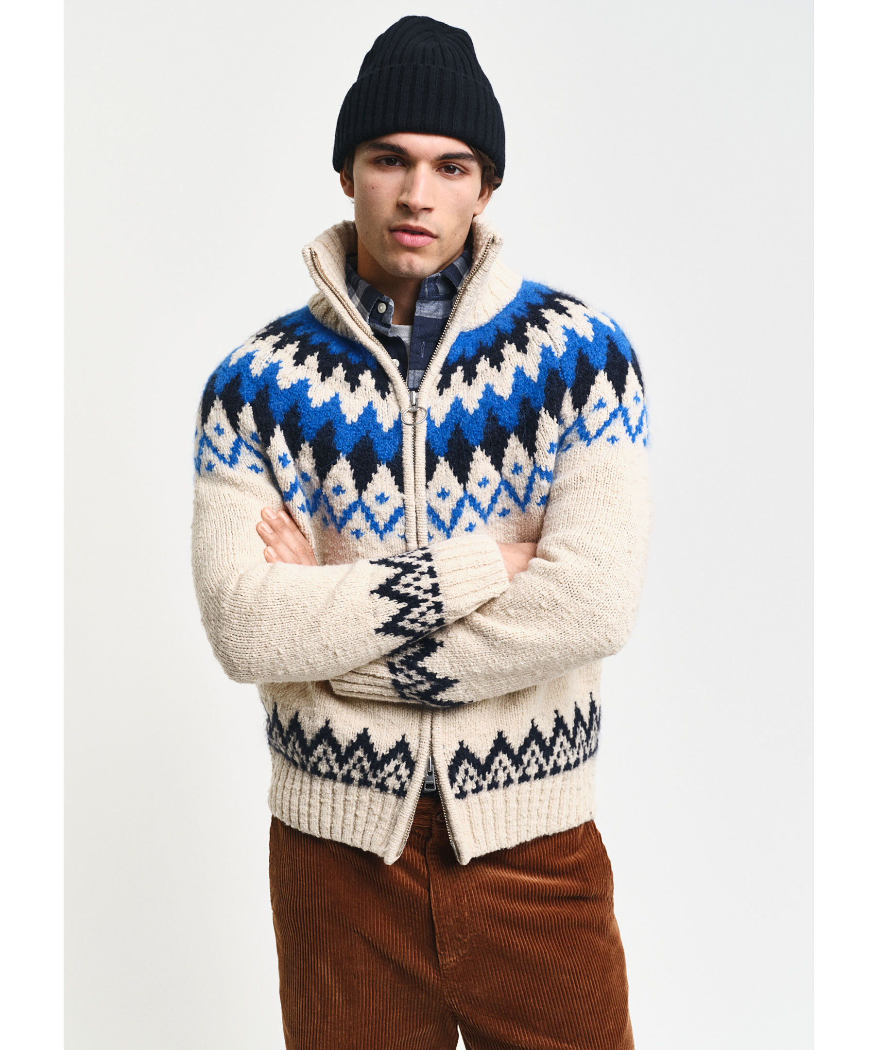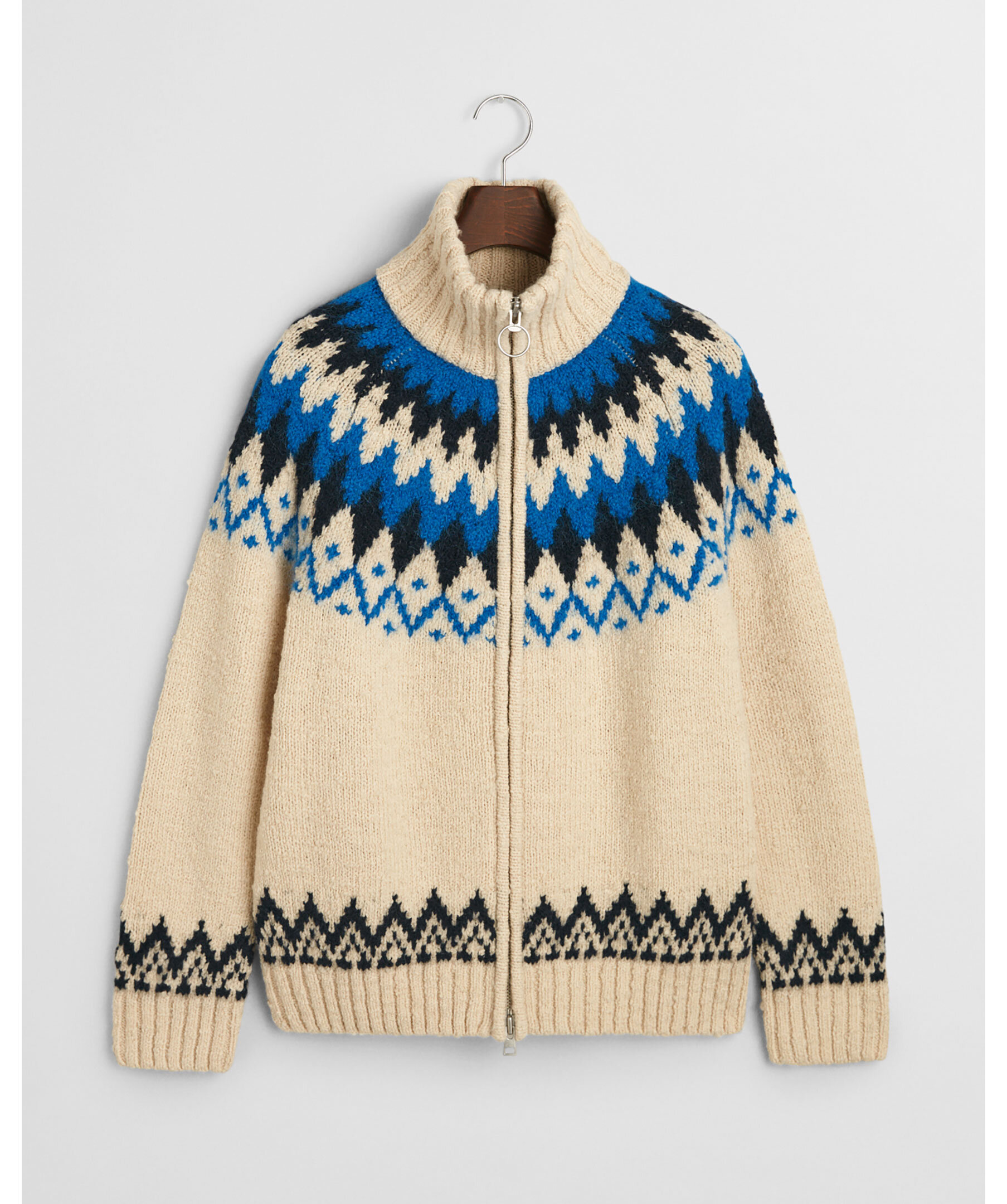 Krämvit och blå, stickad cardigan från Gant. Stängs med tvåvägsdragkedja framtill och är jacquardstickad med geometriskt retromönster samt har ribbstickad, hög krage, formstickade detaljer och ribbstickade muddar. Tillverkad i en ullblandning.