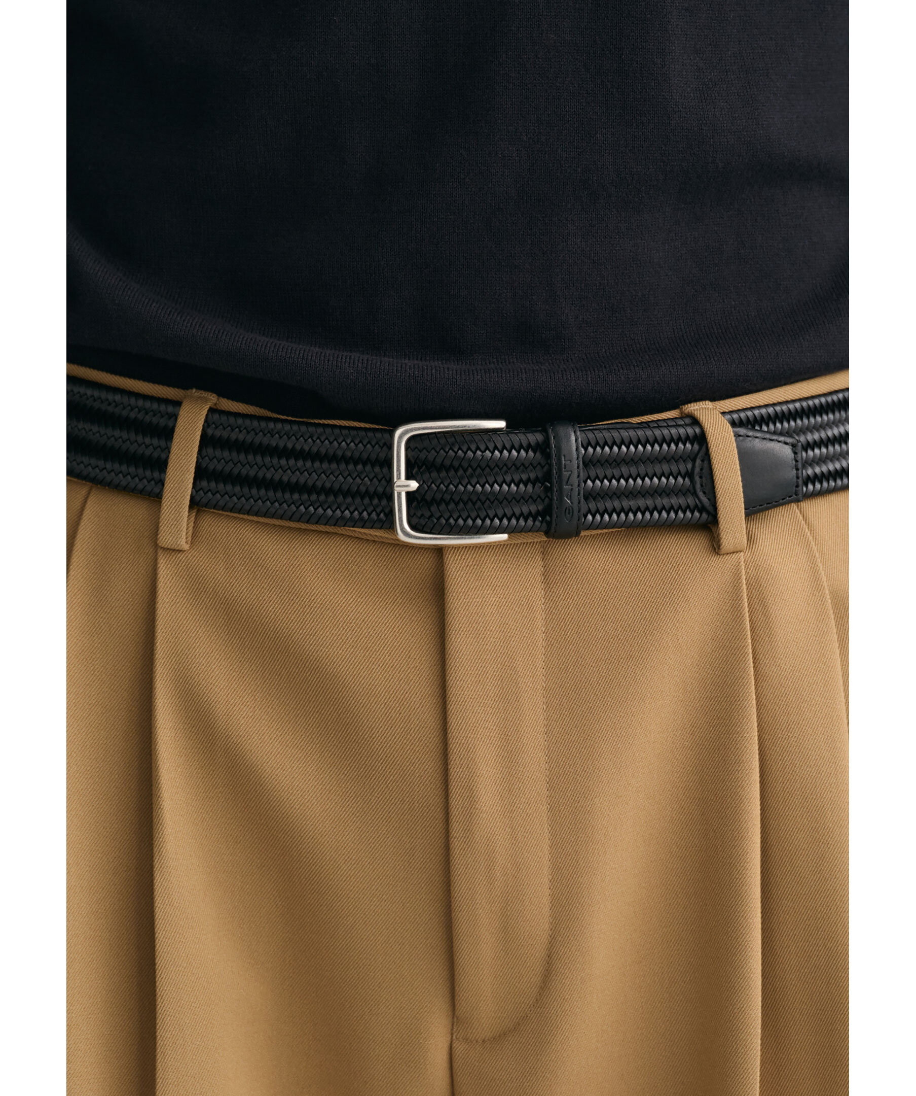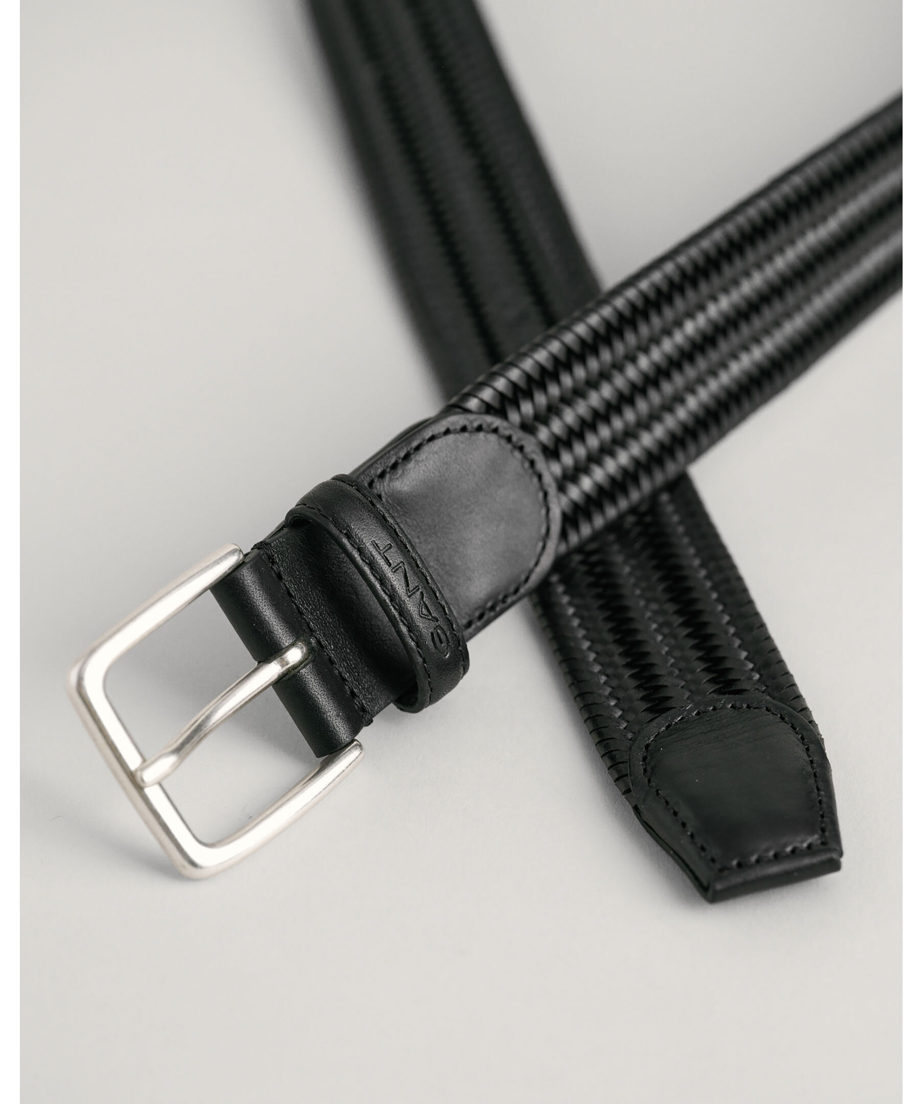 Svart, flätat bälte från Gant. Elegant design med silverfärgat spänne och präglad Gant-logotyp på hällan. Tillverkad i skinn.