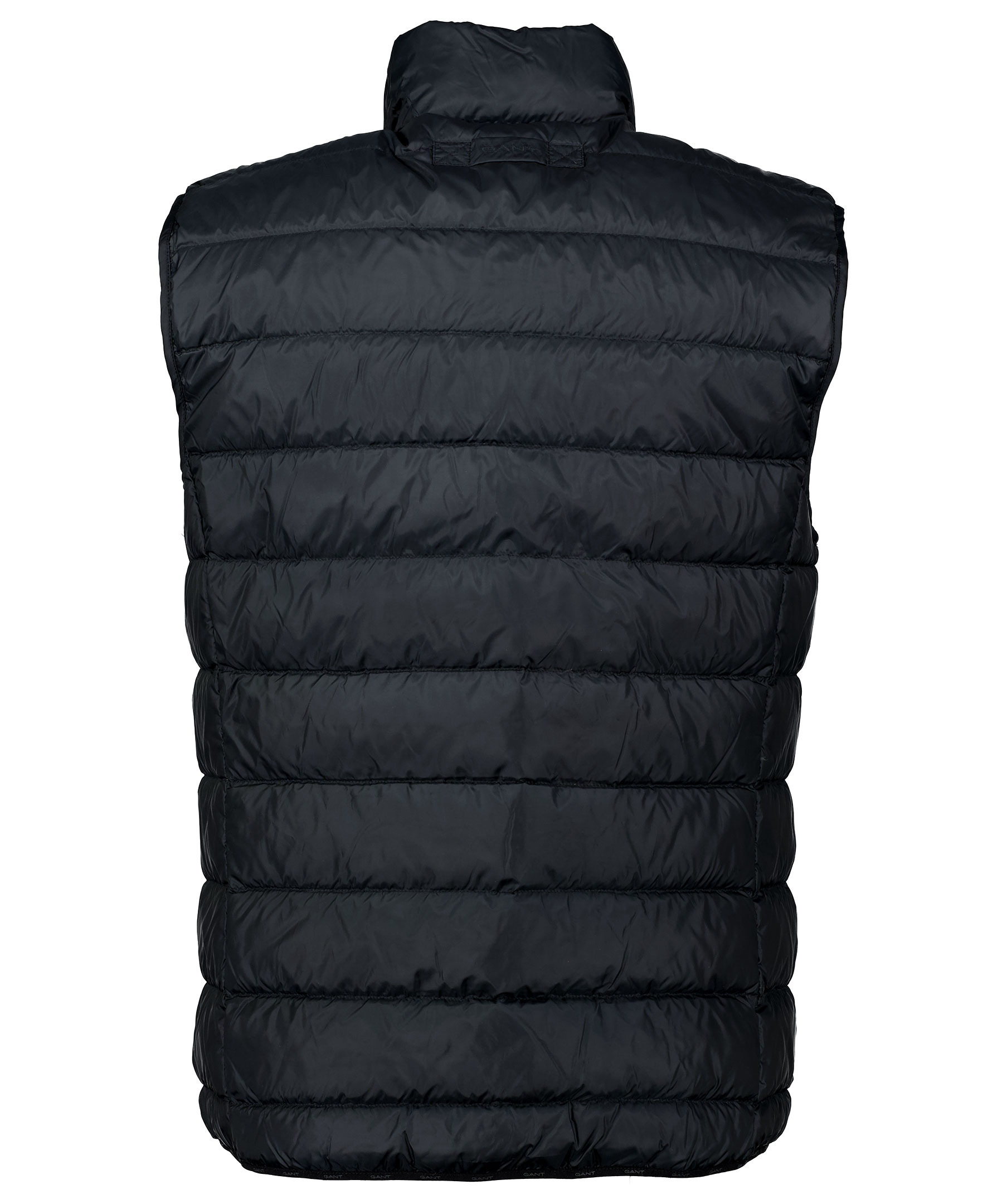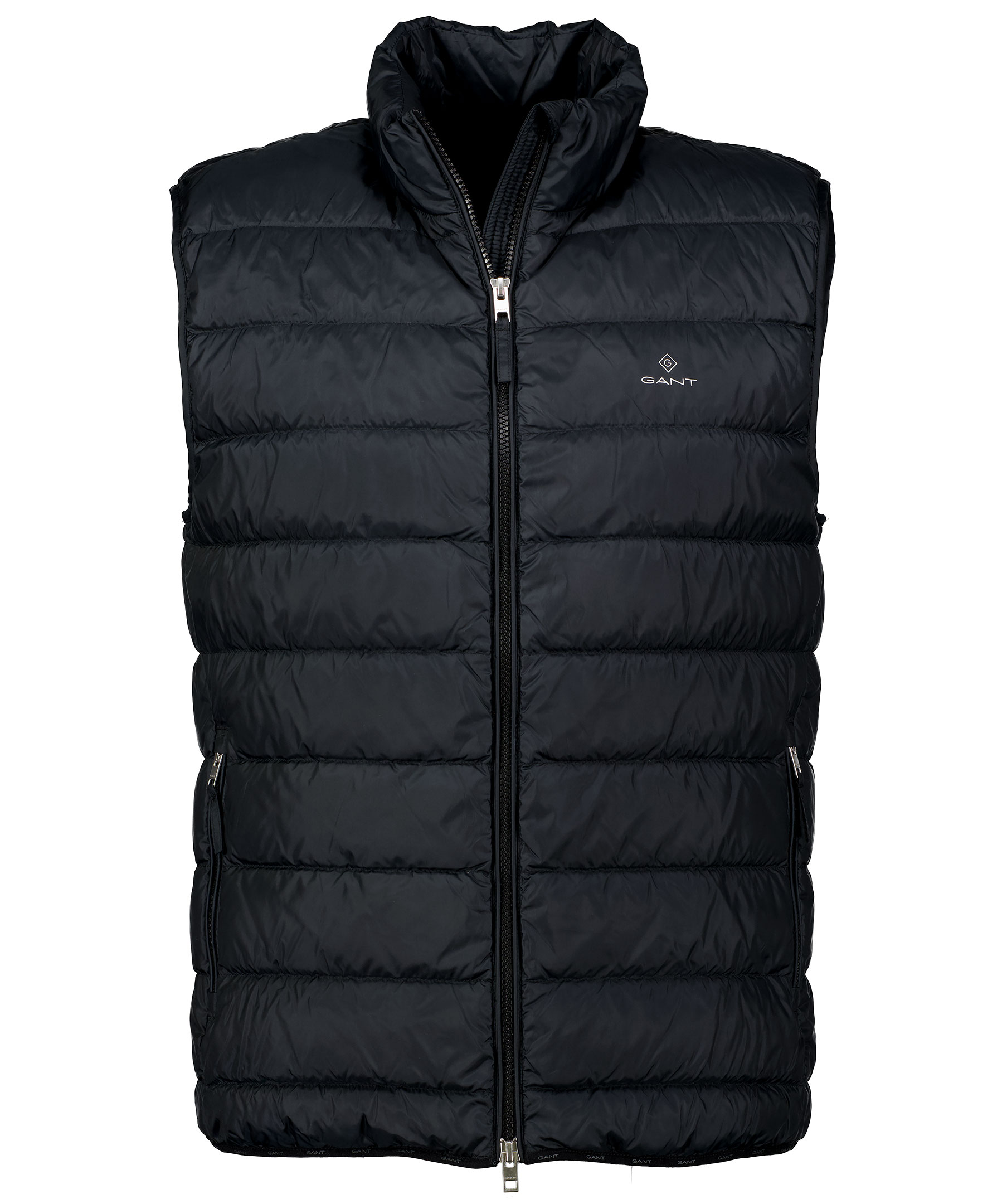 Svart lättviktsdunväst från Gant. Tillverkad i polyester med dunfyllning. Silverfärgad logotyp tryckt på bröstet, ståkrage, två fickor fram med dragkedja samt en innerficka med dragkedja.