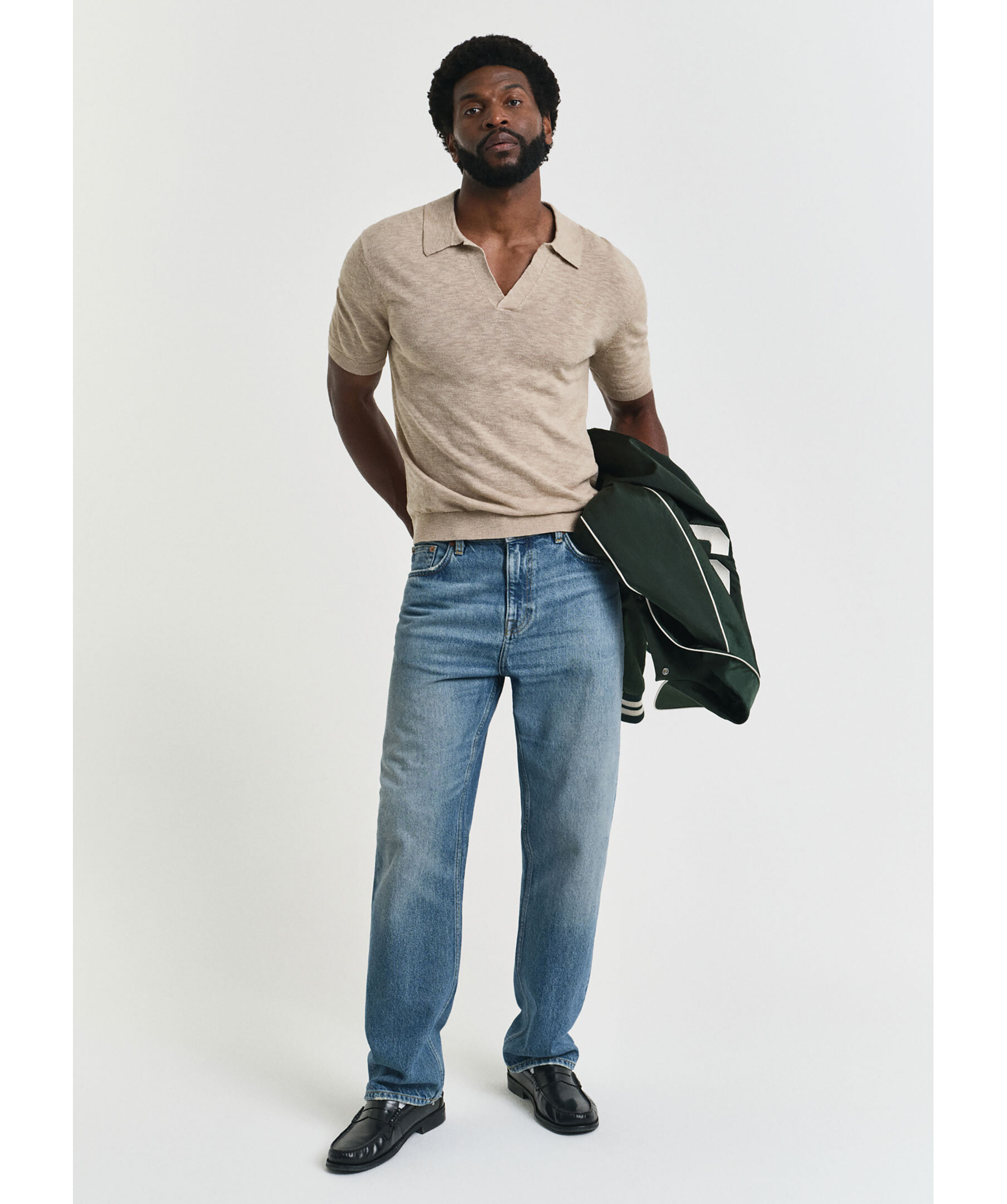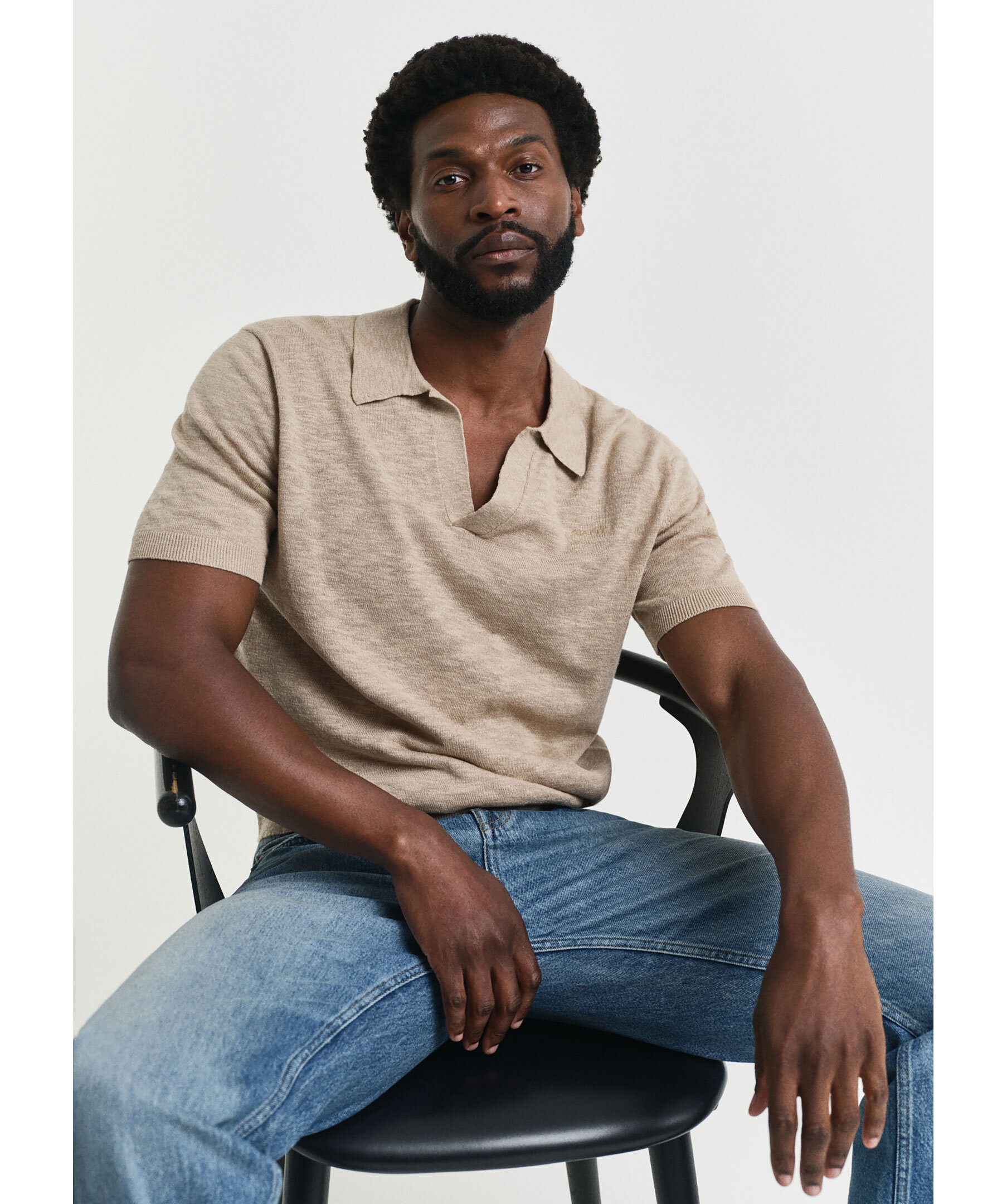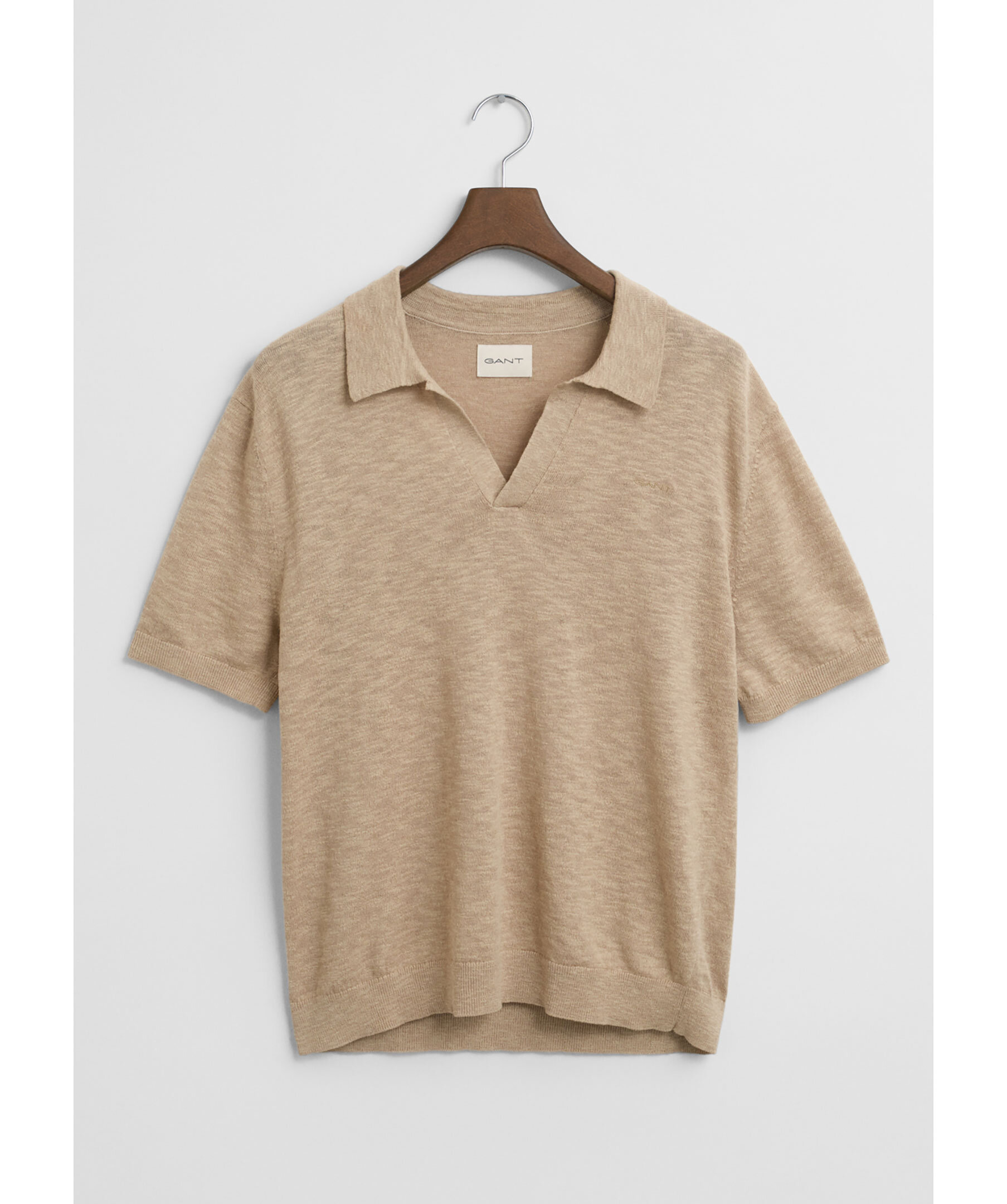 Beige, kortärmad pikétröja från Gant. Pikén är finstickad och har öppen krage samt ribbstickade muddar. Tillverkad i en linneblandning.