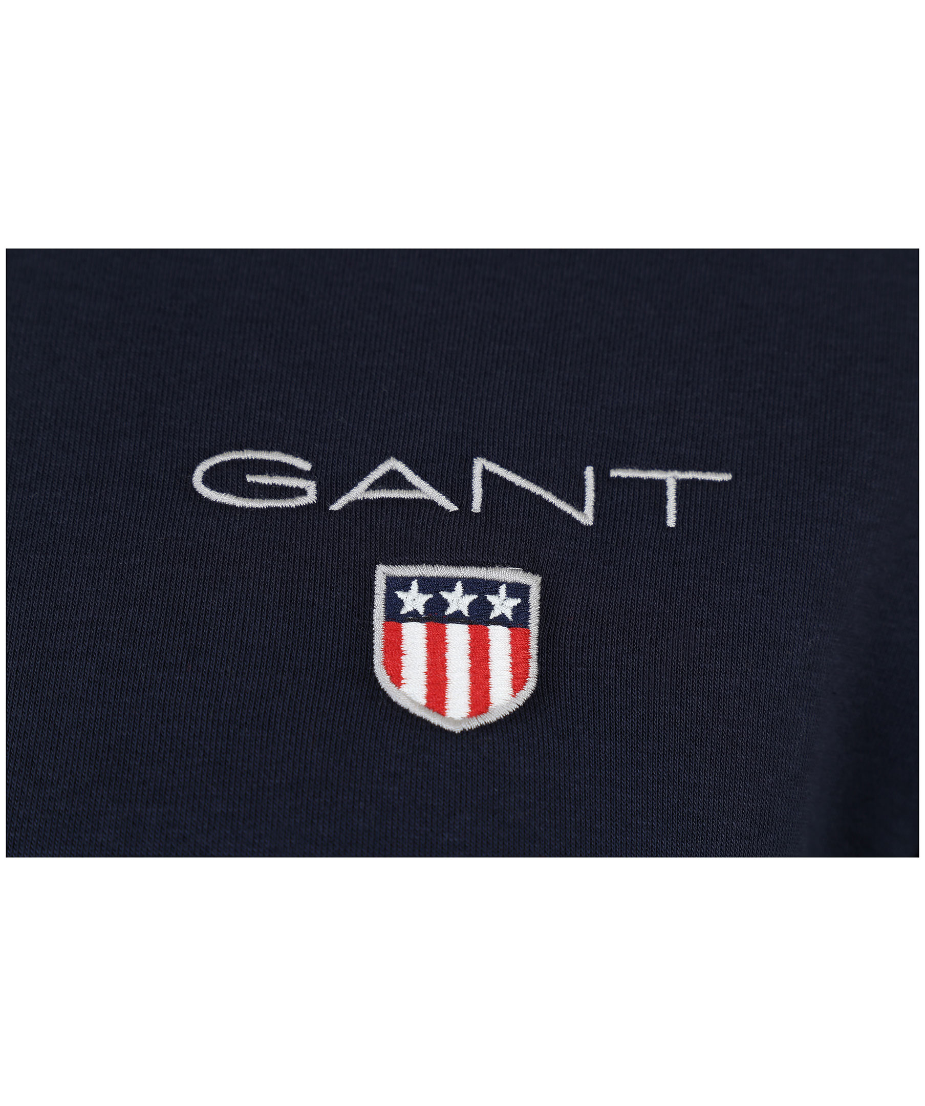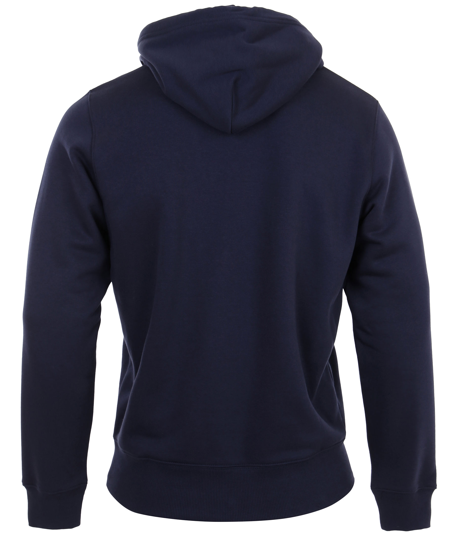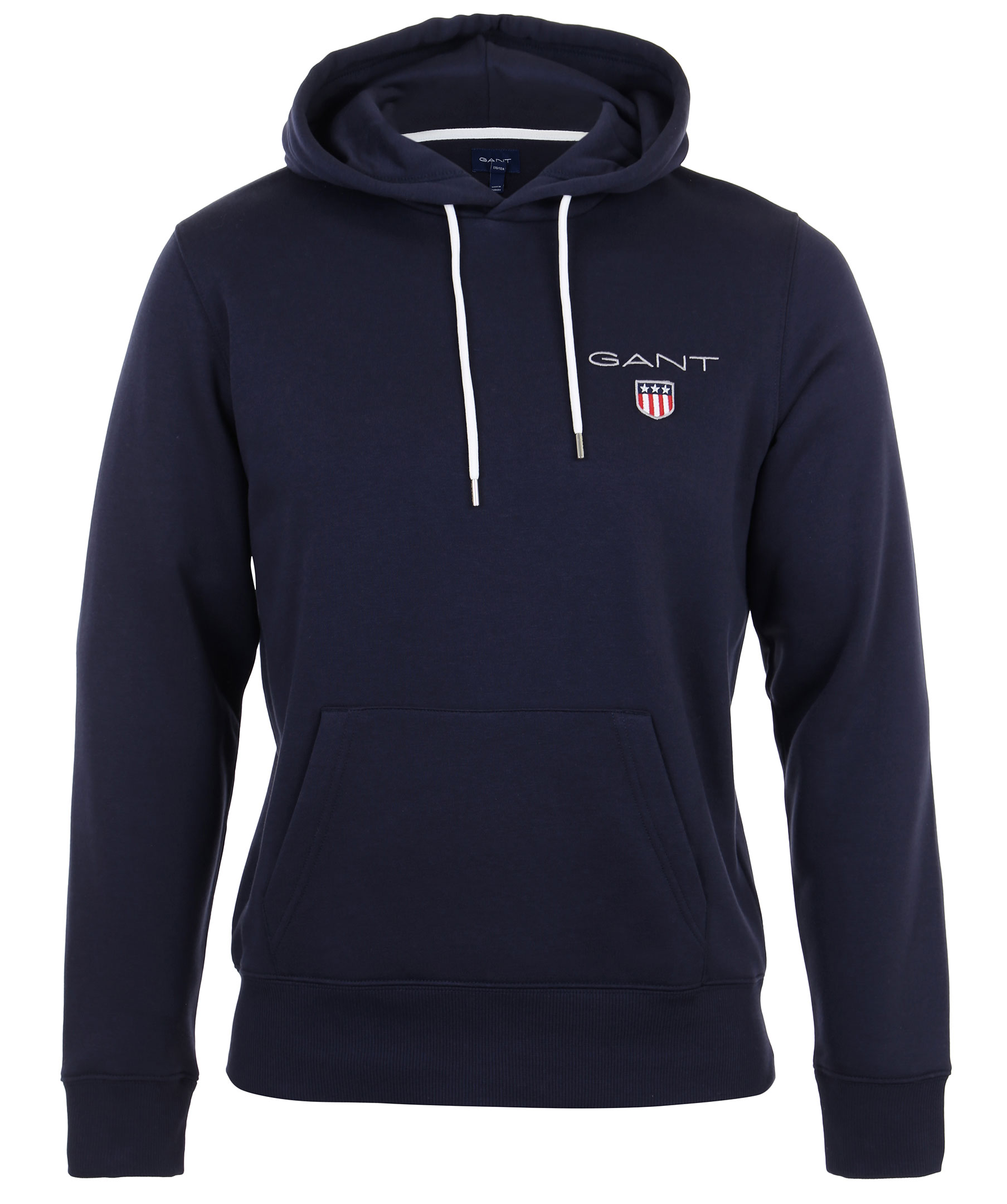 Marinblå hoodie från Gant i skön bomull. Tröjan har luva med dragsko samt stor ficka på magen. Ribbstickade muddar och broderad logotyp över bröstet.