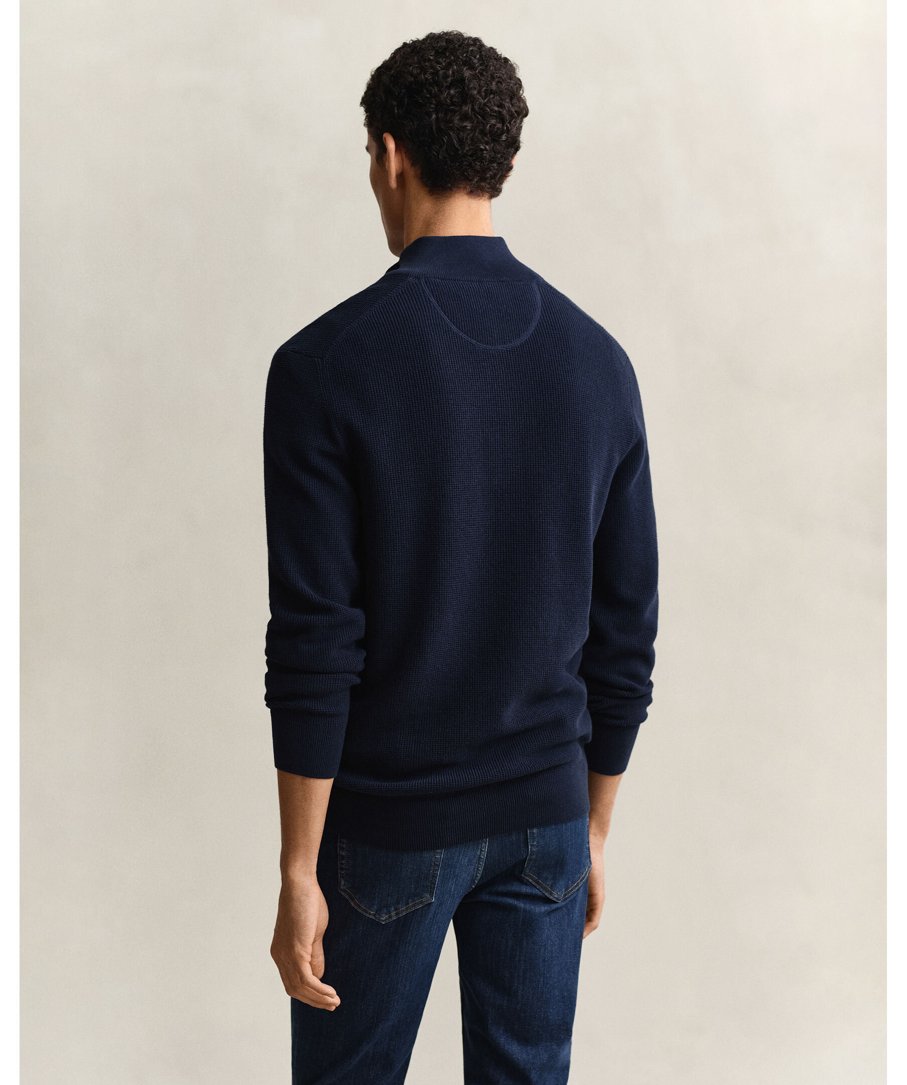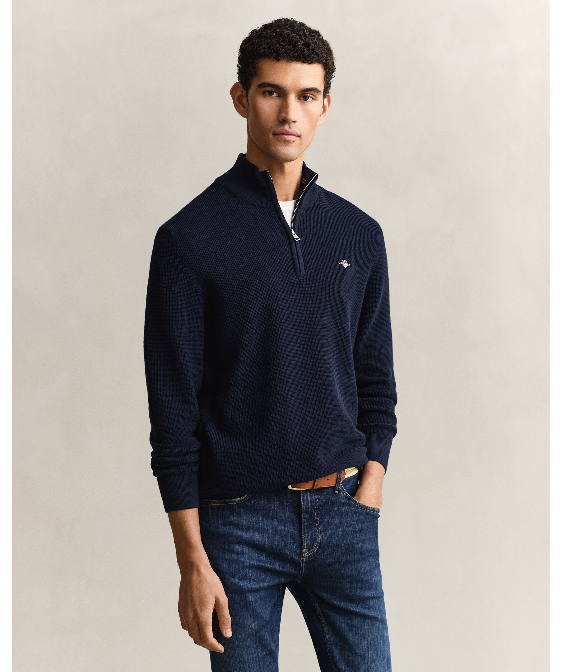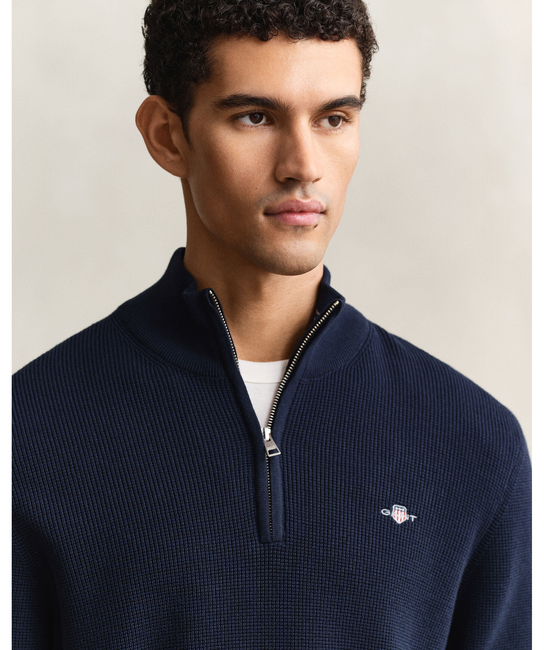 Stickad tröja från Gant. Tillverkad i en ekologisk bomullsblandning med ett diskret våffelstickad struktur och har en normal passform. Half-zip i kragen, ribbade muddar och nederkant samt sköldbroderi på bröstet.