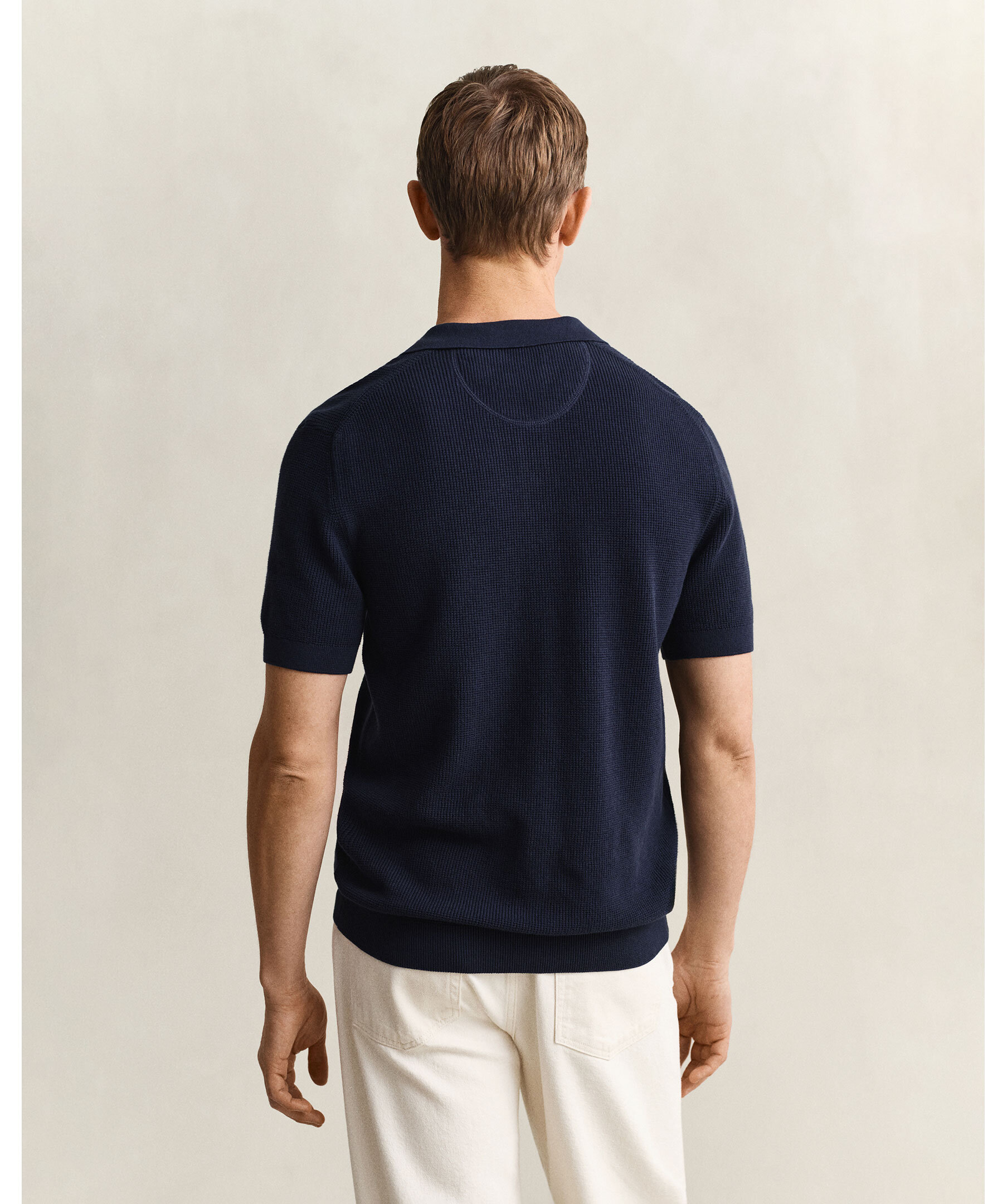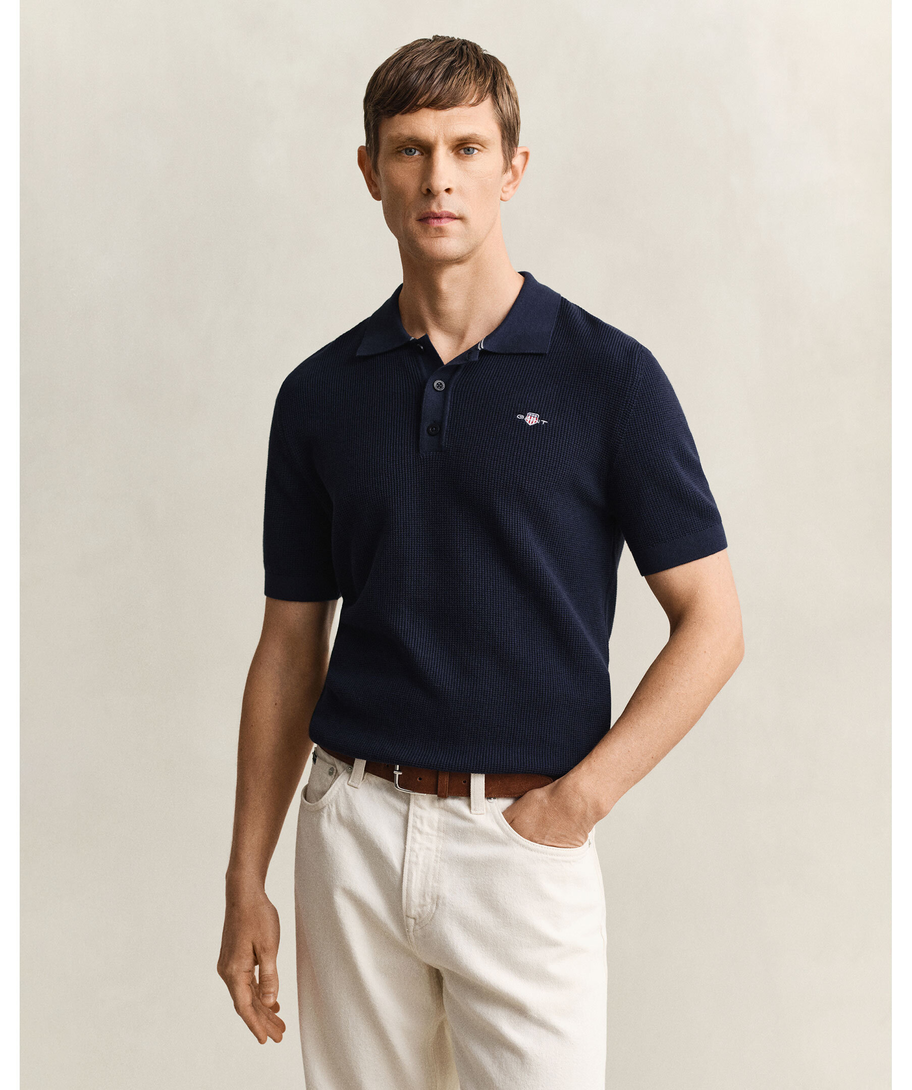 Kortärmade pikétröja från Gant. Tillverkad i en bomullsblandning med diskret våffelstickad struktur. Tröjan har en normal passform. Polokrage med knappslå, ribbade avslut och sköldbroderi på bröstet.