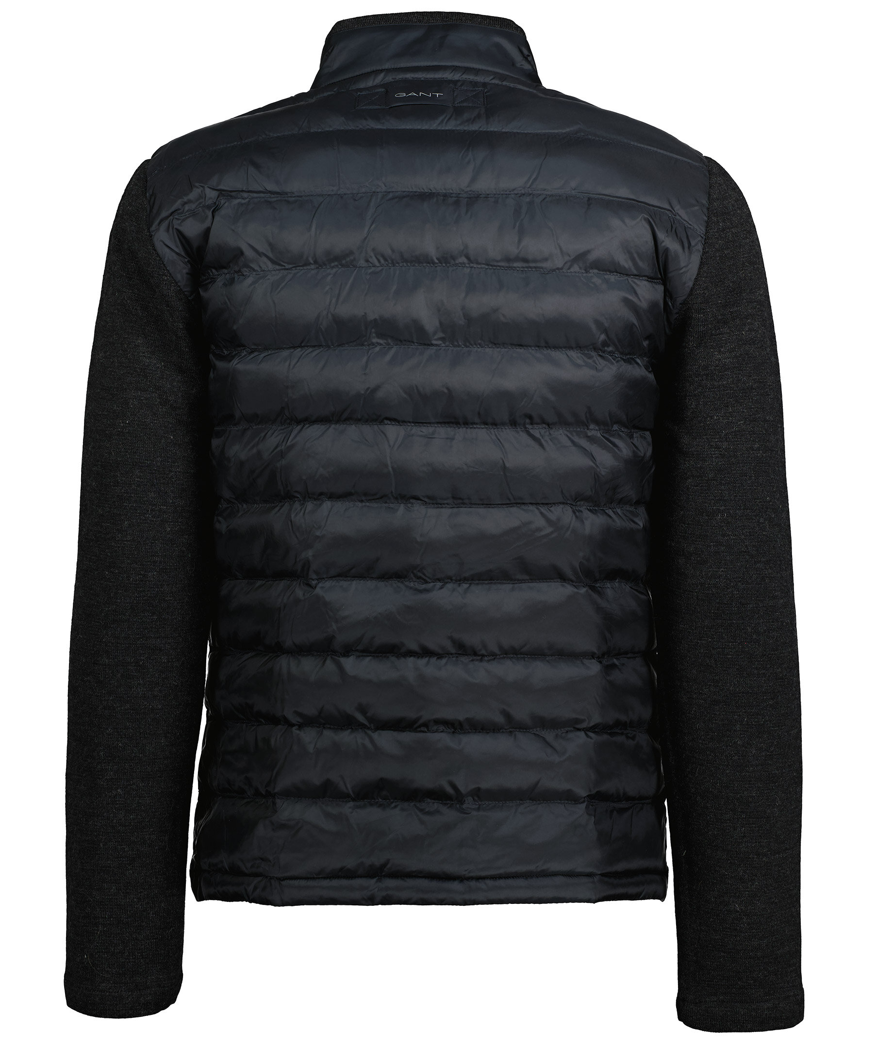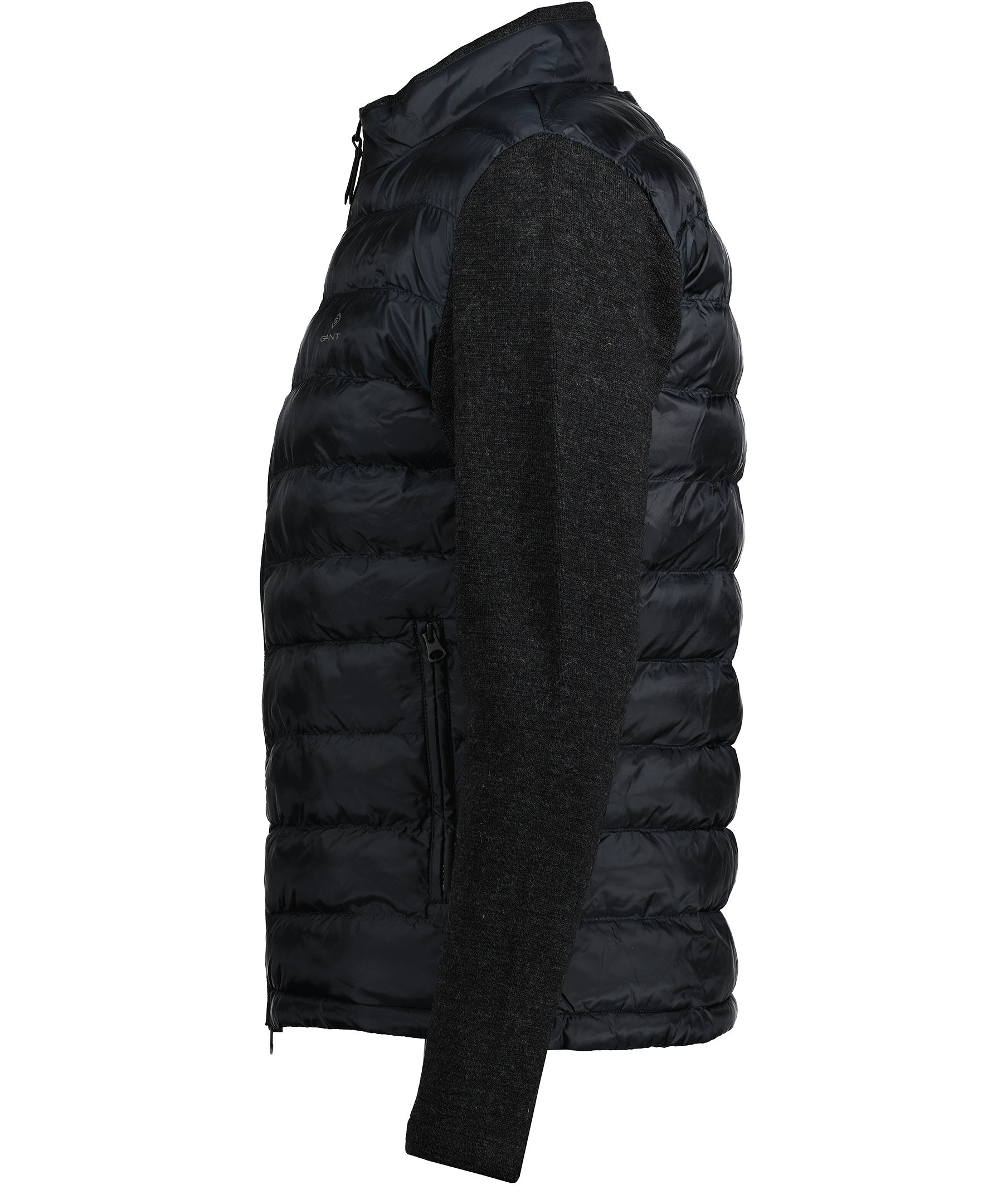 Svart quiltad vadderad hybridjacka med stickade ärmar från Gant. Stängs med tvåvägsdragkedja. Sidfickor med dragkedja, innerficka. Ribbstickad mudd i ärmslut och kragen. Tryckt logotyp på vänster bröst och ryggen på ögla.