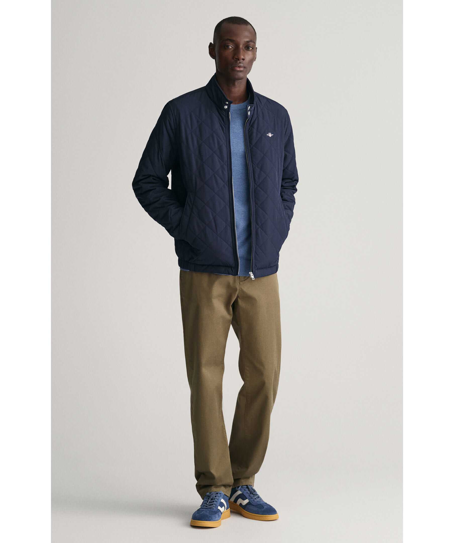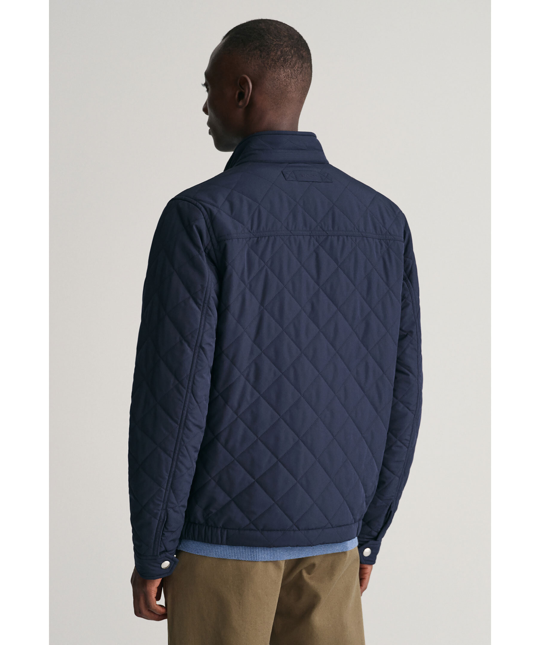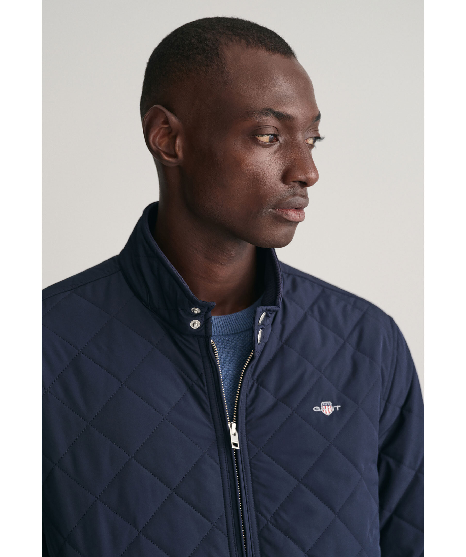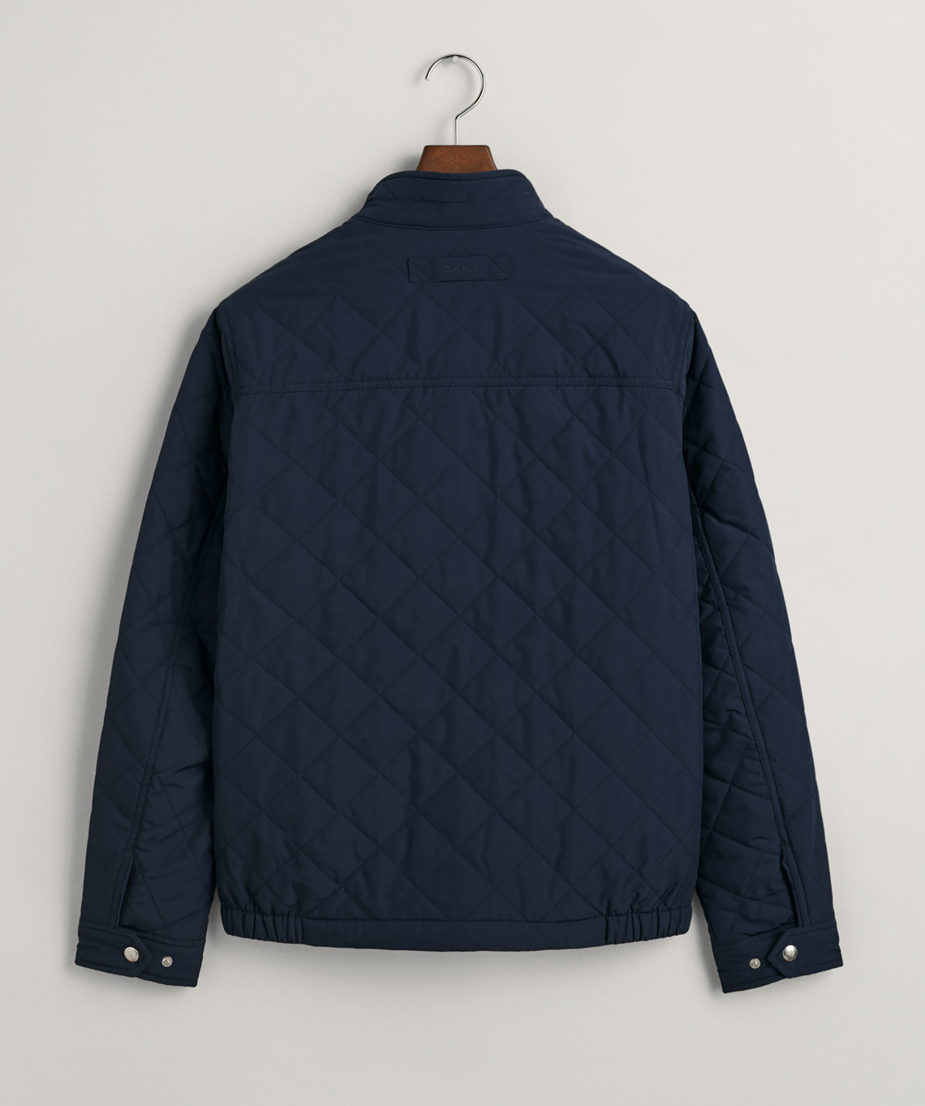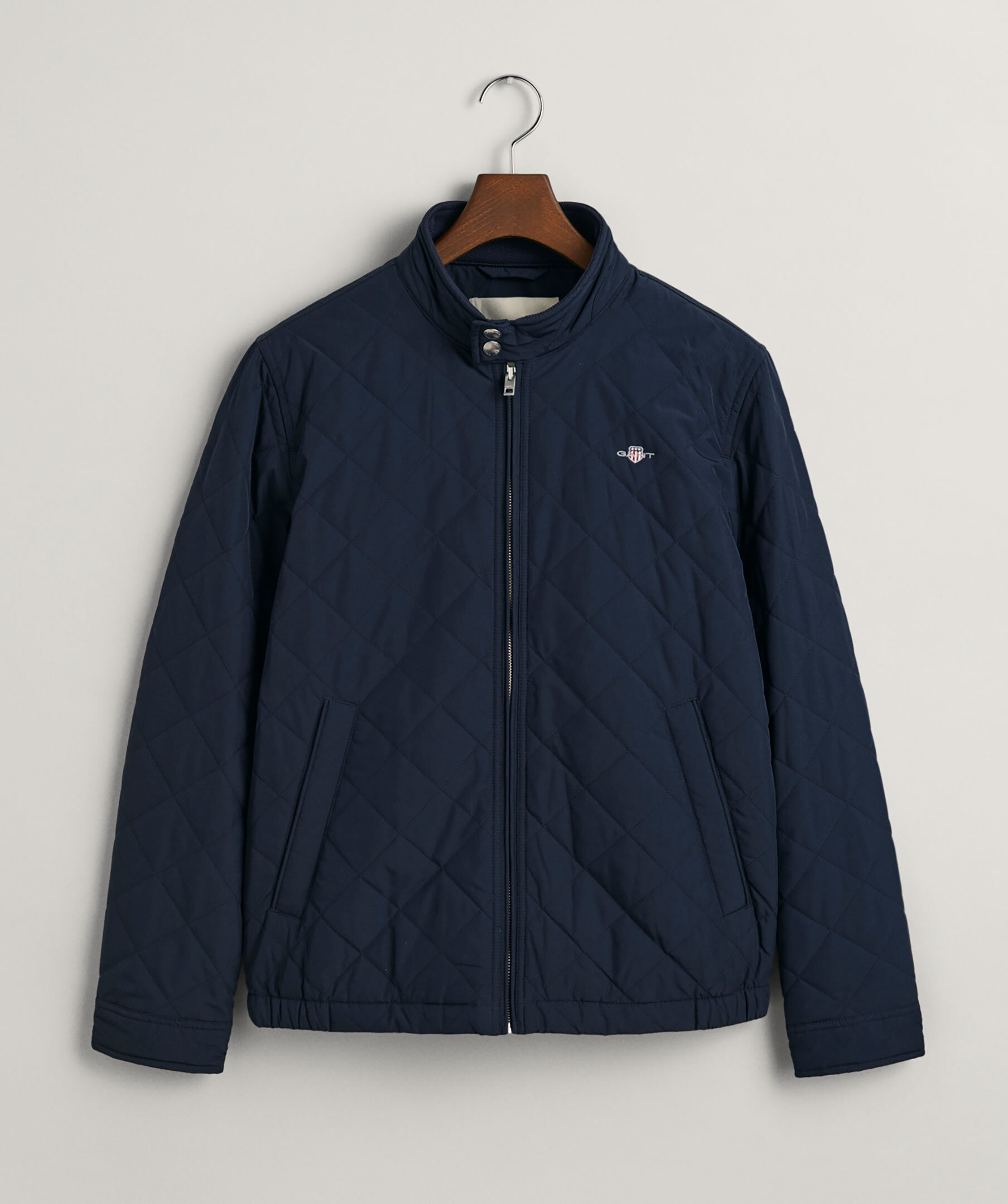 Mörkblå quiltad jacka från Gant. Stängs framtill med dragkedja. Broderad logotyp på vänster bröst. Två fickor framtill. Hög krage som stängs med tryckknappar. Ögla i nacken med broderad logotyp. Justerbara ärmslut med tryckknappar.
