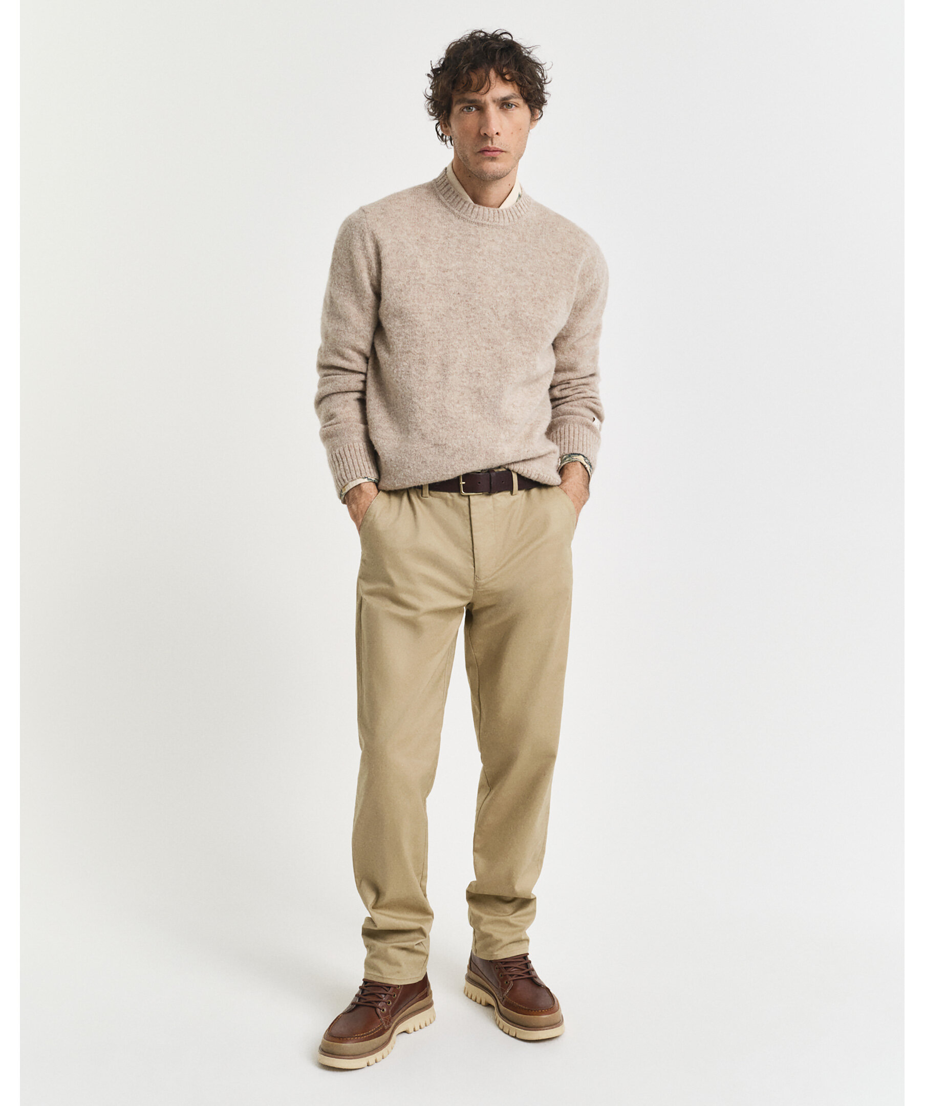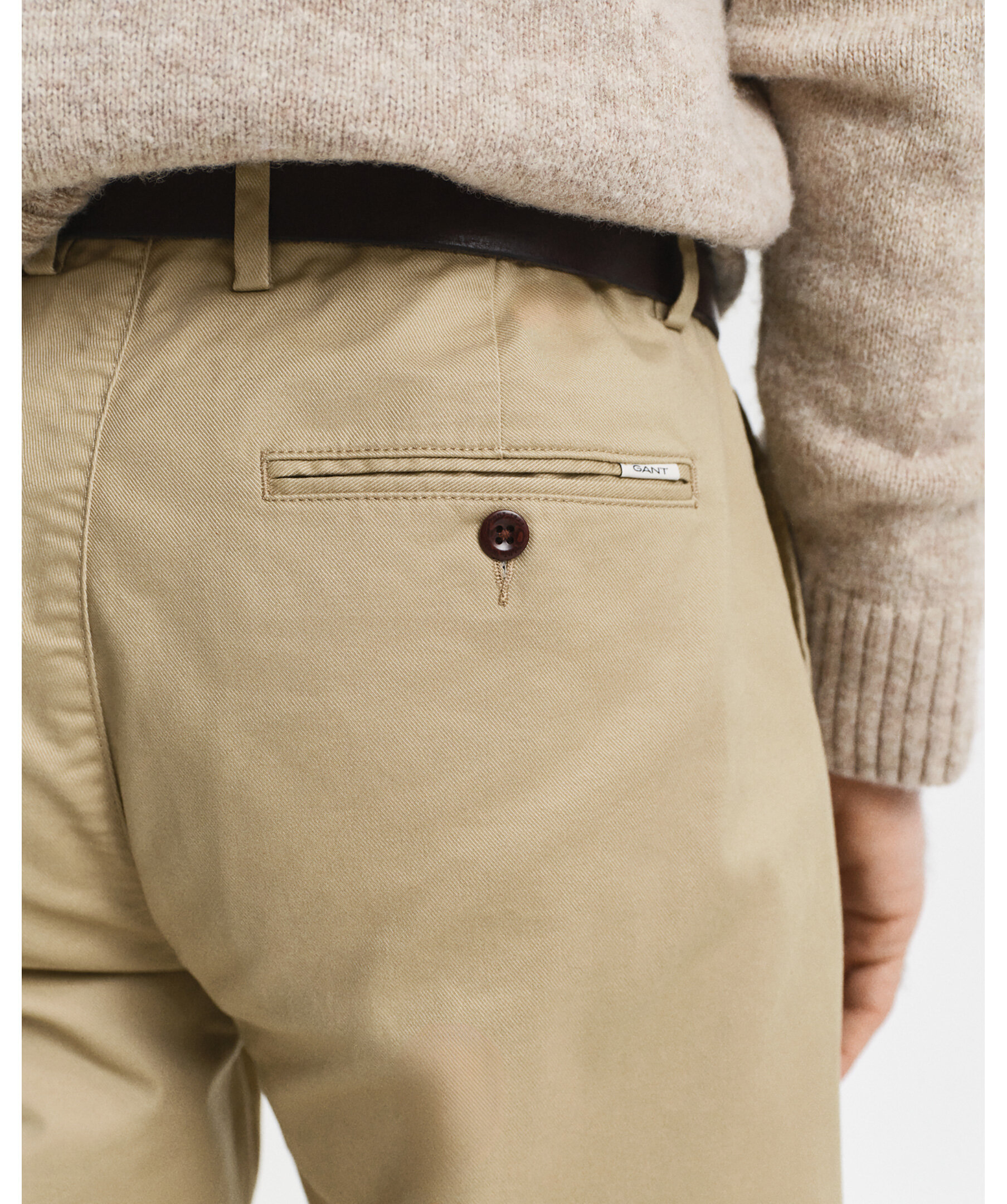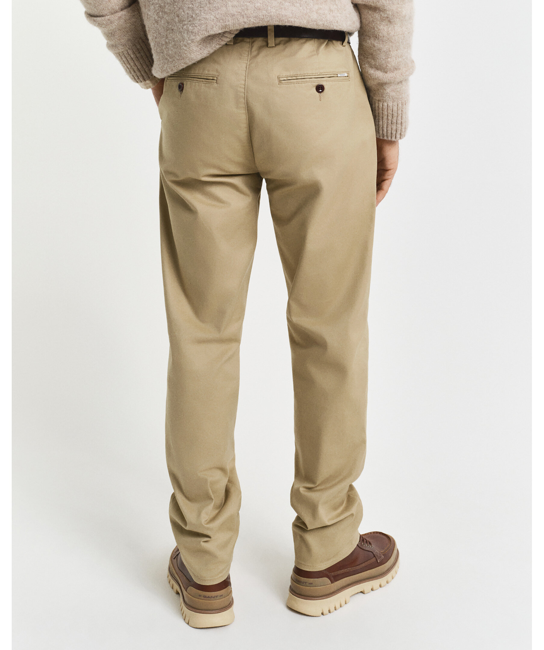 Khakifärgade chinos från Gant. Byxorna har en mellanhög midja, två sidfickor, två bakfickor med knapp, bälteshällor i midjan och GANT-logotyp på höger passpoalficka. Tillverkad i en bomullsblandning.