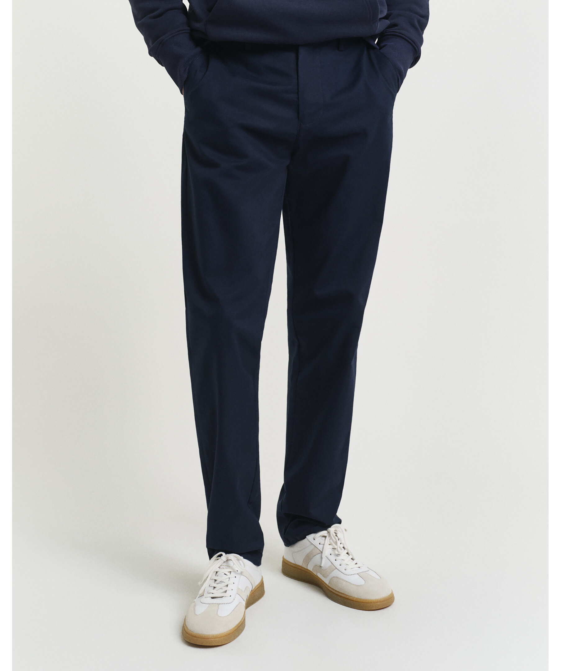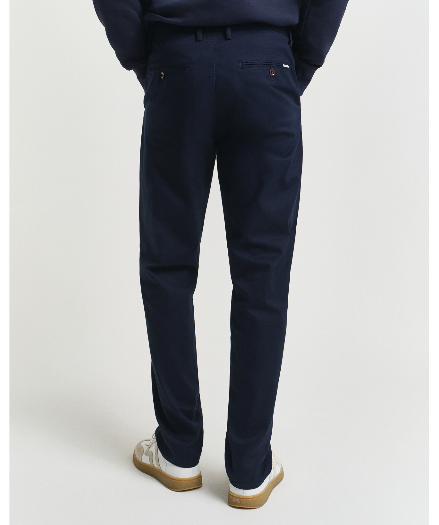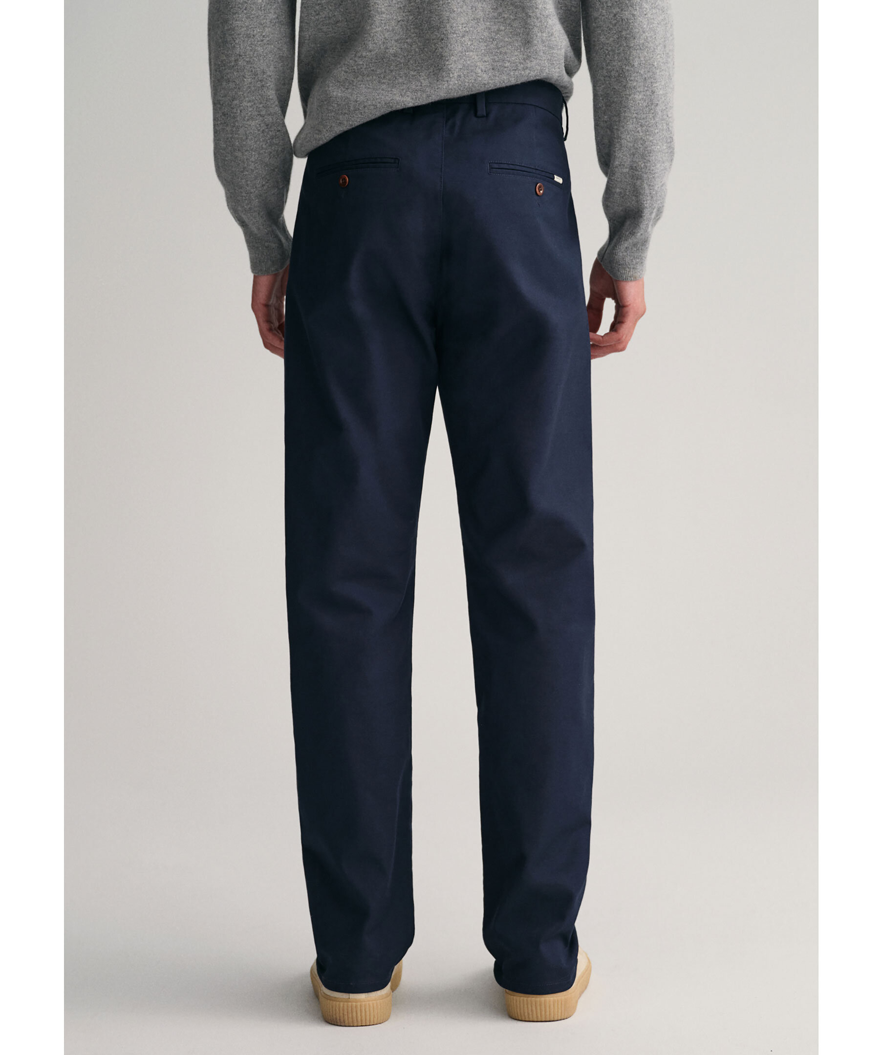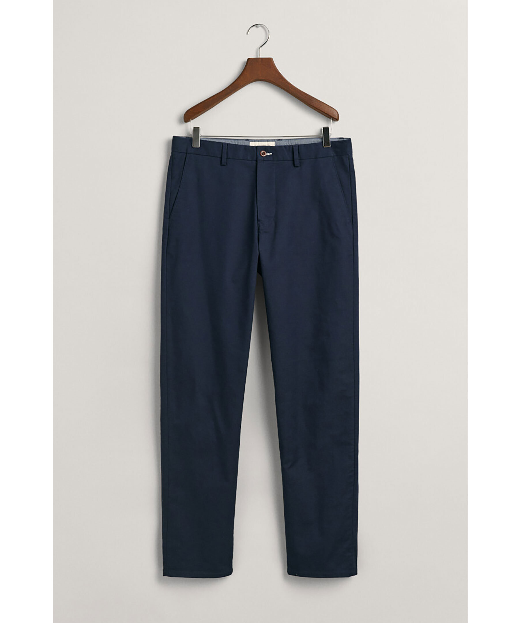 Marinblåa chinos från Gant. Byxorna har en mellanhög midja, två sidfickor, två bakfickor med knapp, bälteshällor i midjan och GANT-logotyp på höger passpoalficka. Tillverkad i en bomullsblandning.