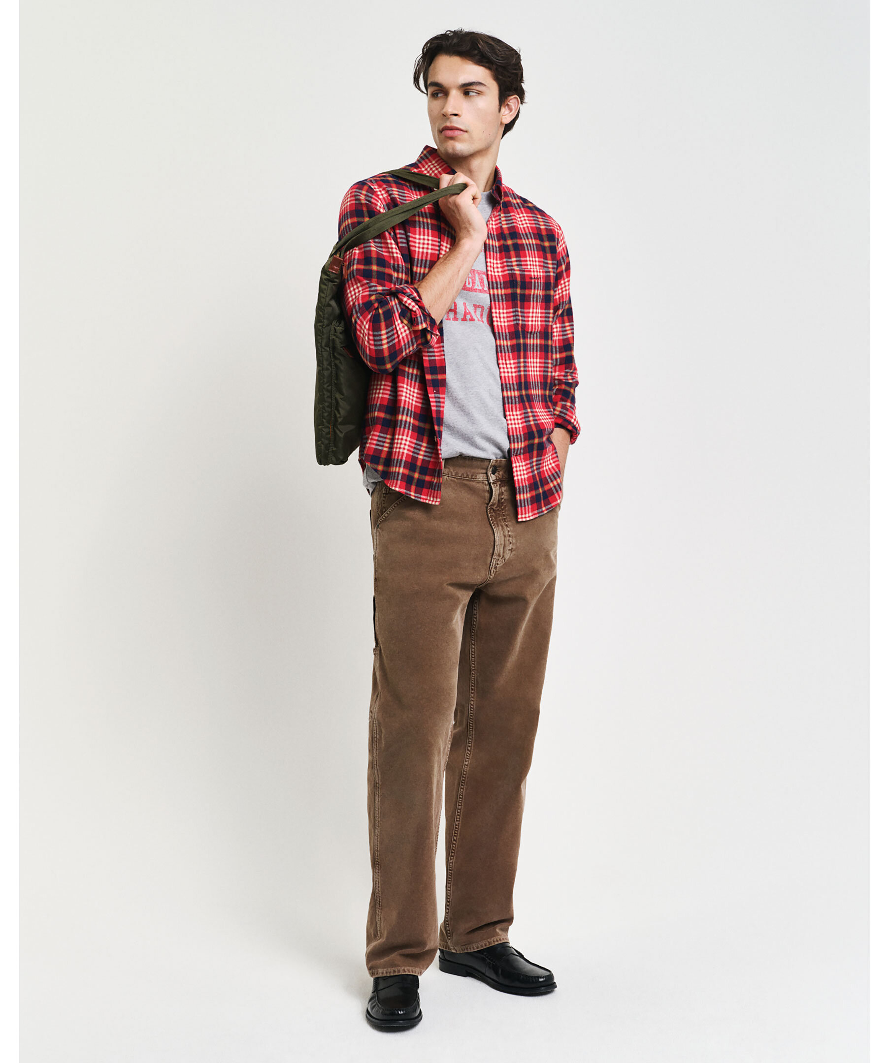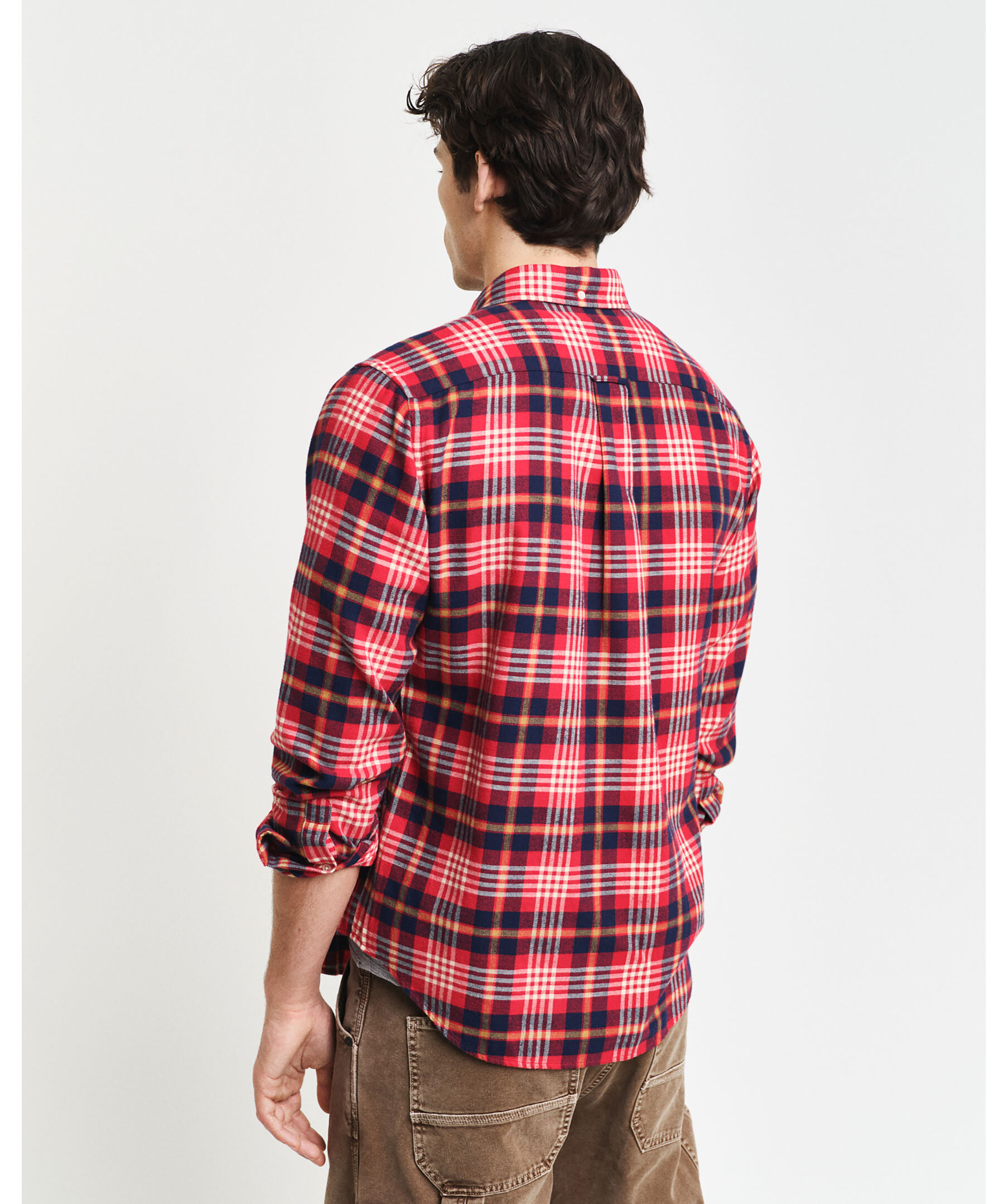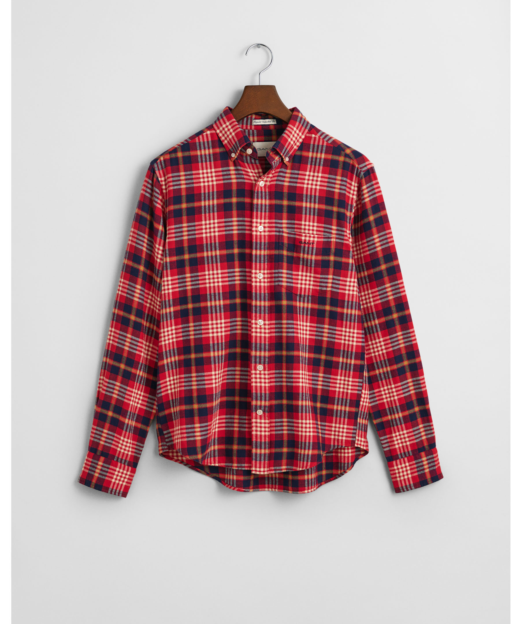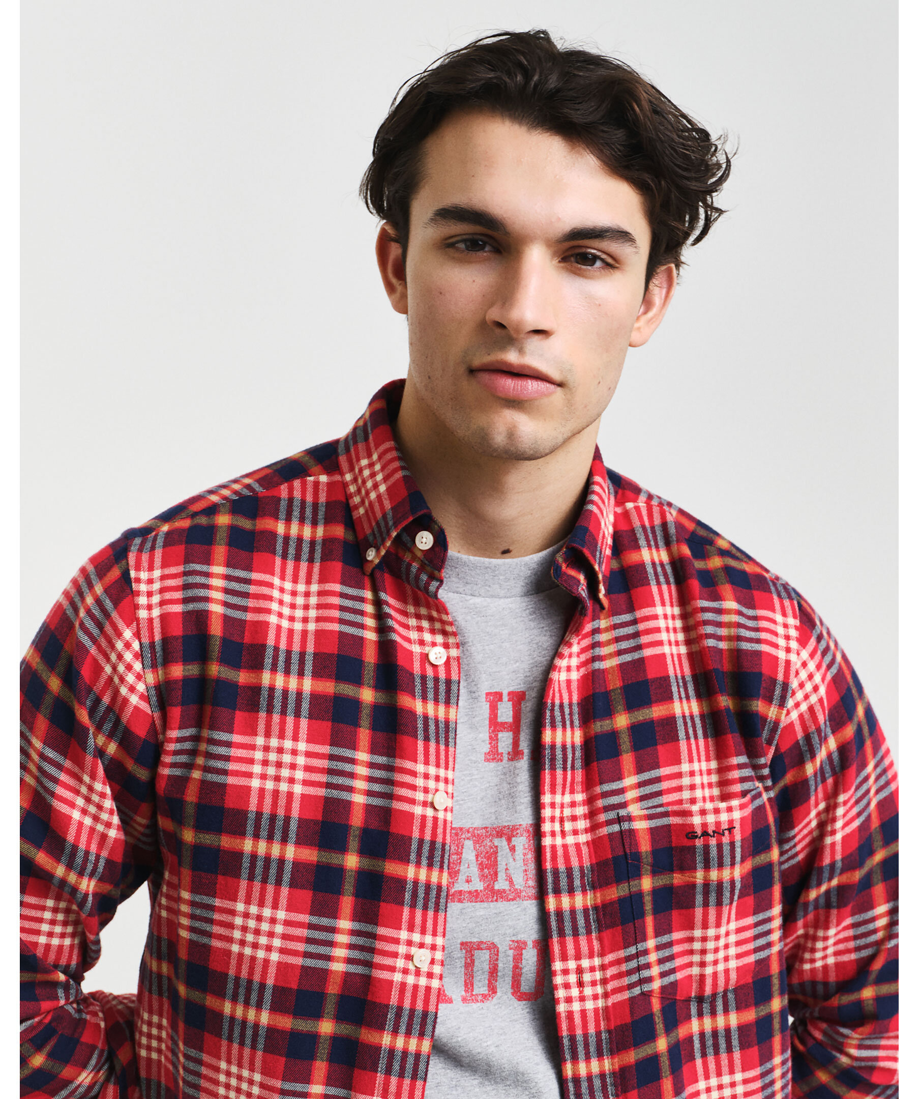 Helrutig flanellskjorta i bomull med normal passform som bärs löst över byxorna. Klassisk button down-krage, justerbara manschetter och rundad fåll. Skjortan har knappar av återvunnen polyester och även en broderad GANT-logotyp på bröstfickan och boxpleat med vår klassiska locker loop i ryggen.