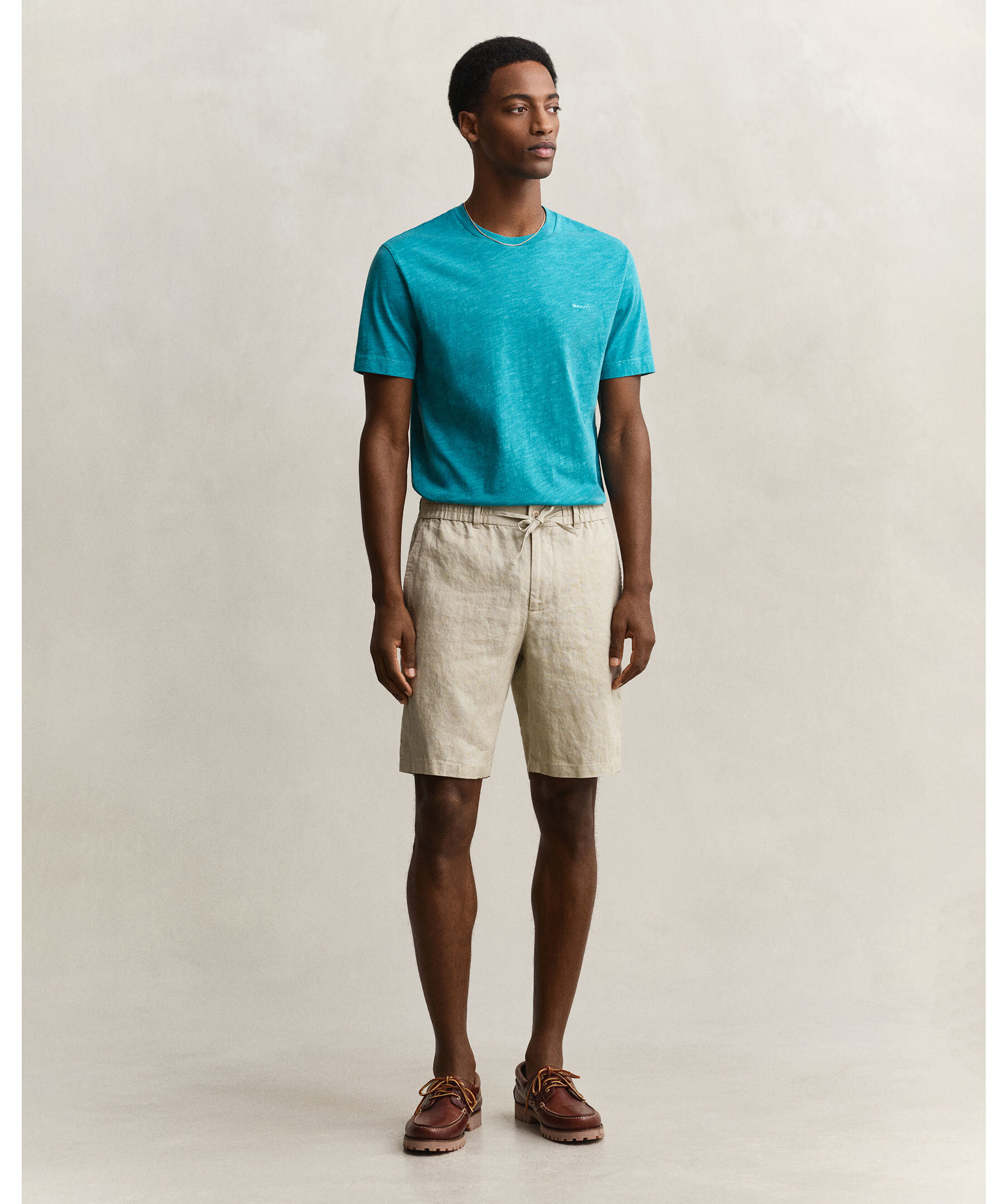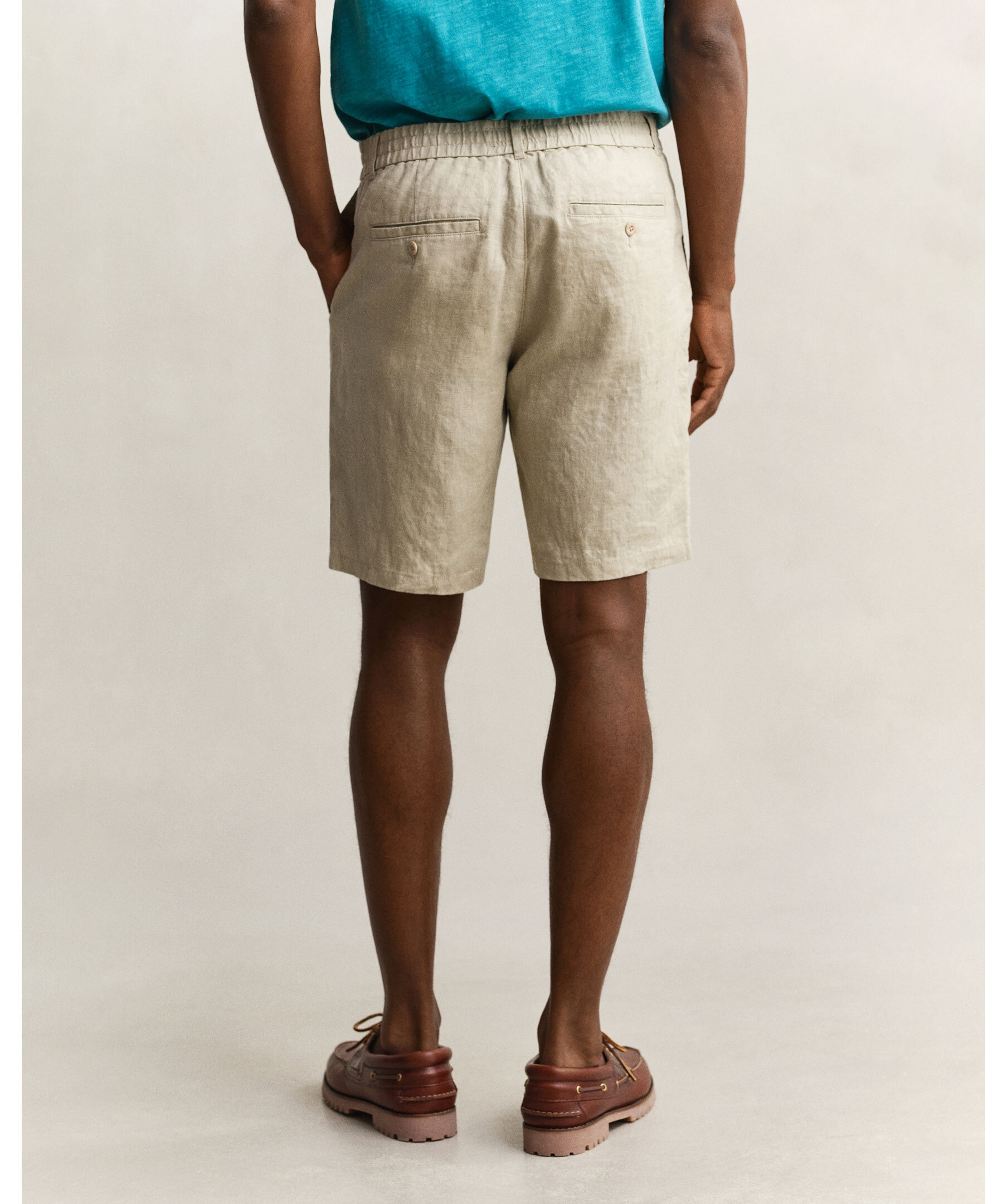 Beige linneshorts från Gant är tillverkade i premiumlinne, vilket ger en luftig och lätt känsla. De har en regular fit med medelhög midja och slutar strax ovanför knäna. Med fokus på både komfort och stil är de designade med elastisk midja, bälteshällor, snedställda framfickor, passpoalfickor bak, knappar i corozo samt en ton-i-ton-broderad Gant-logotyp på bakfickan.