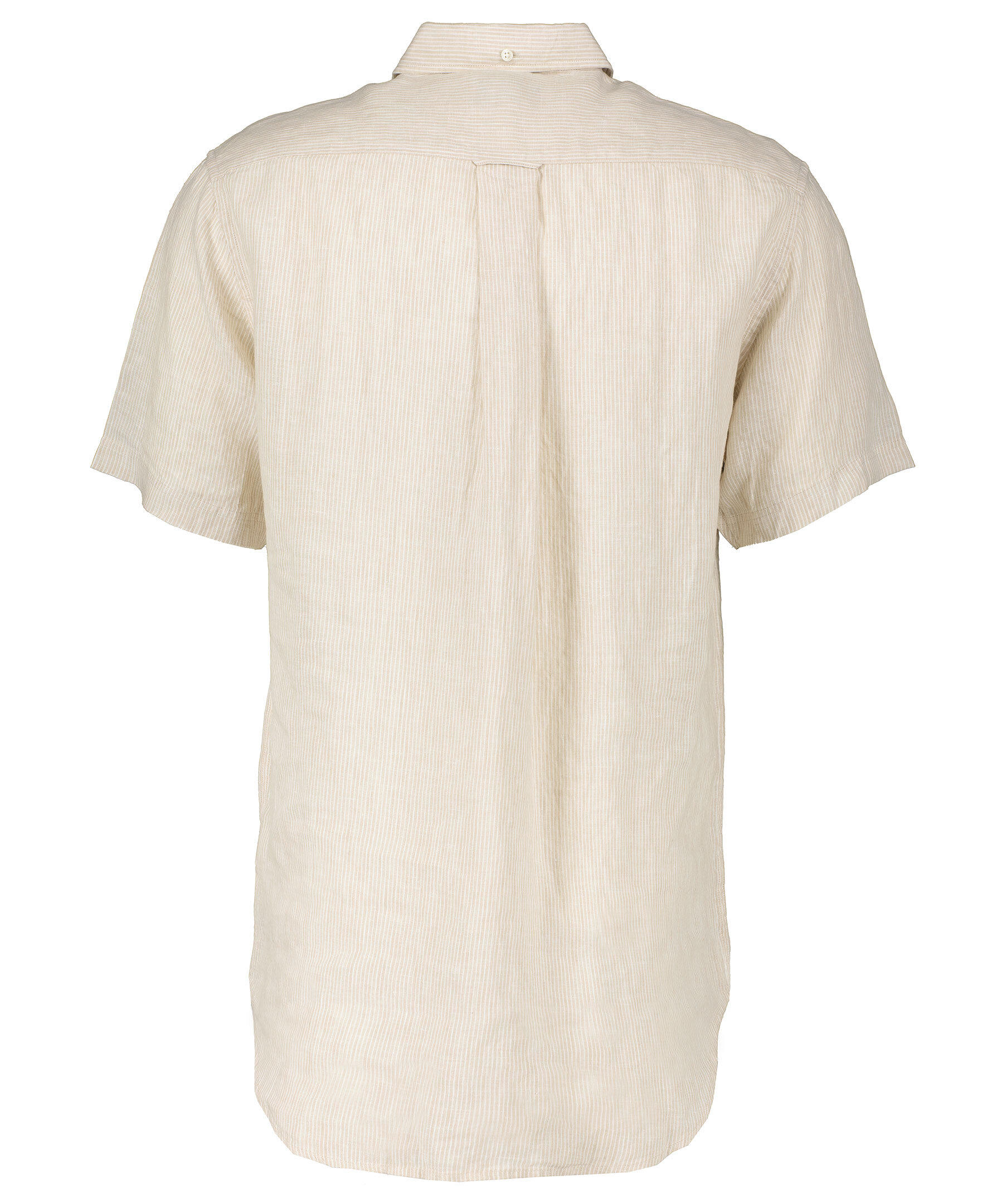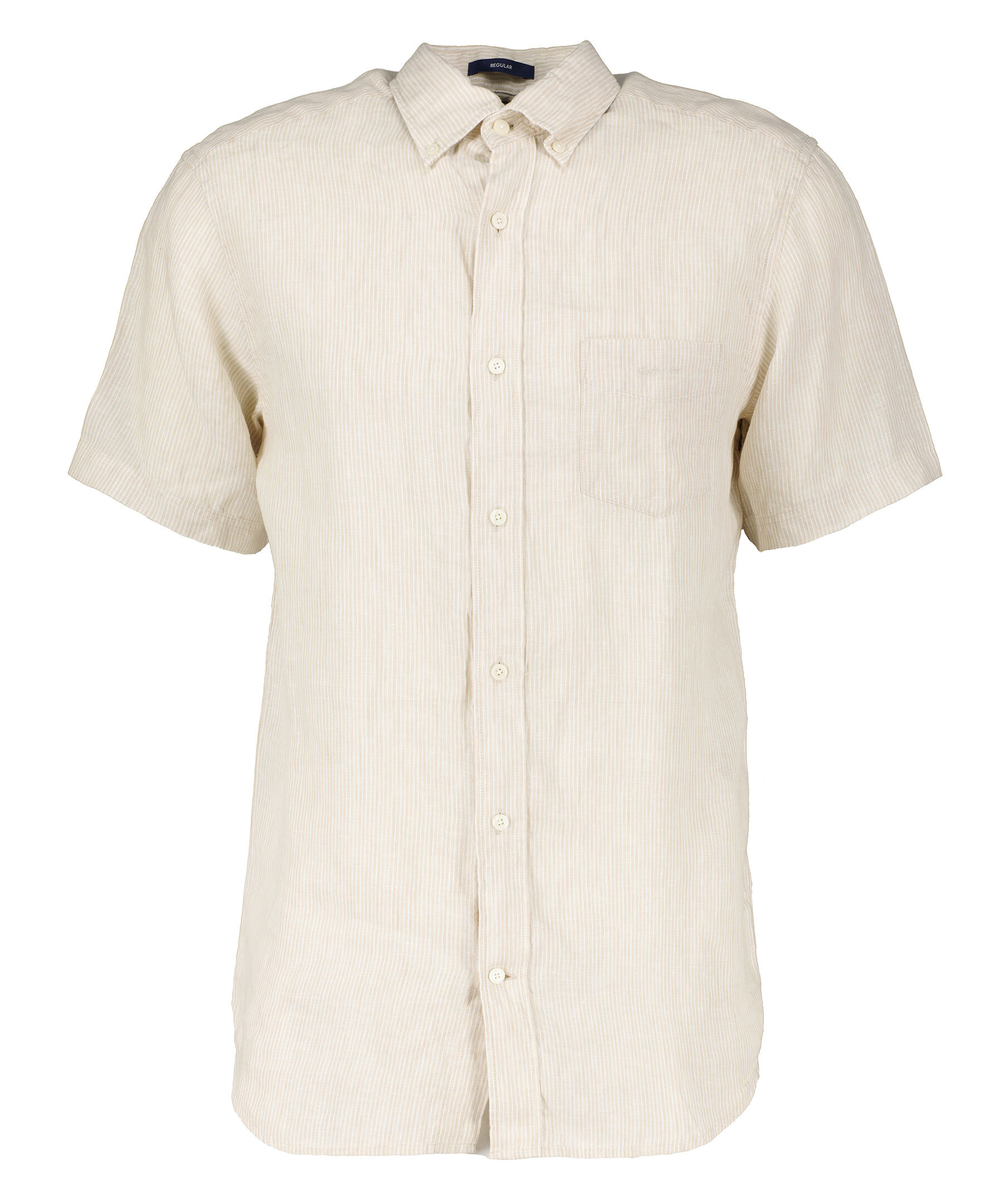 Beige och vit randig, kortärmad skjorta i en normal passform från Gant. Tillverkad i 100% linne. Bröstficka med liten logotyp. Button down krage.
