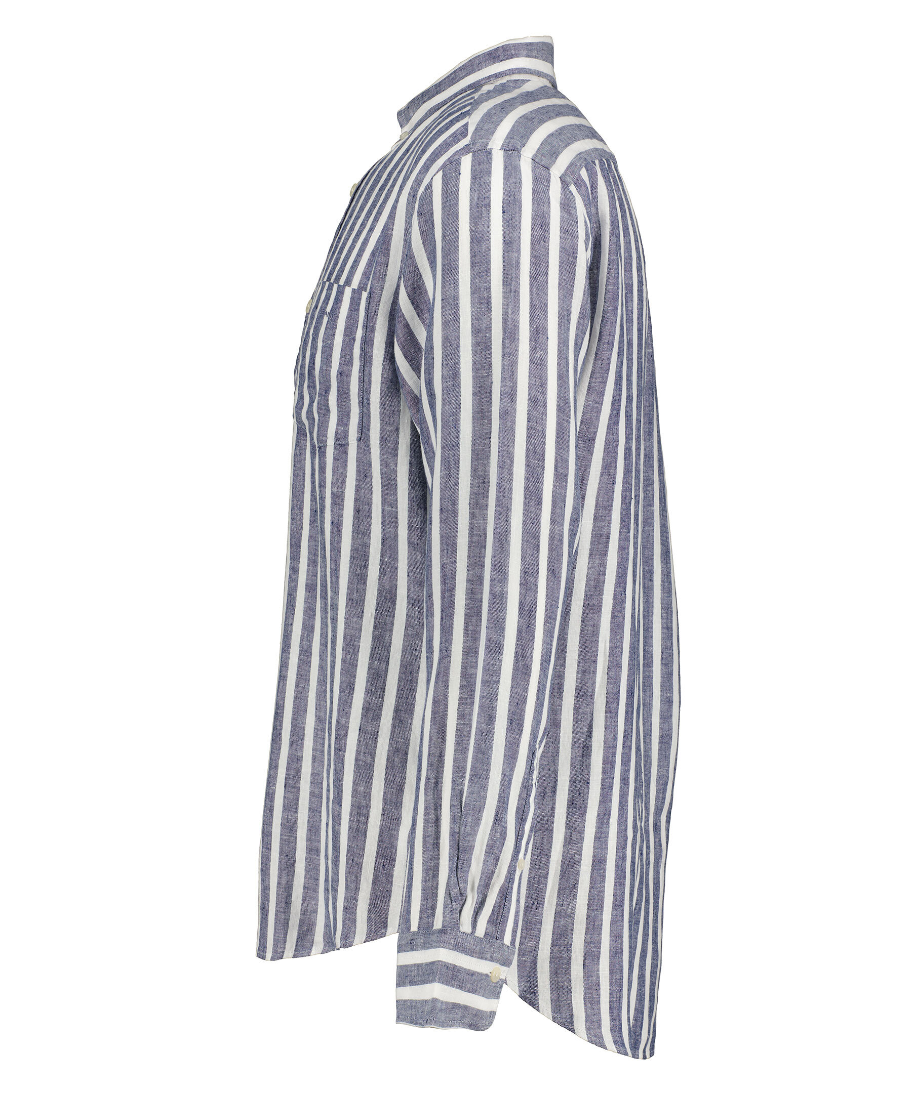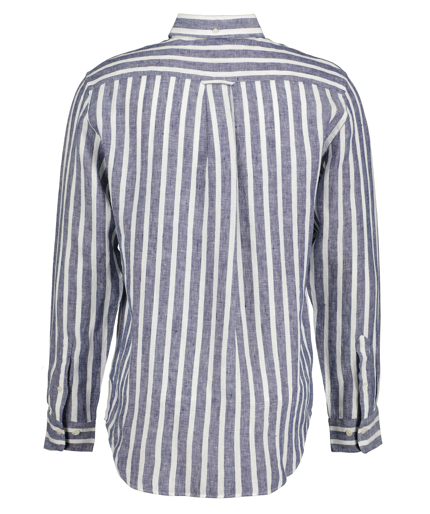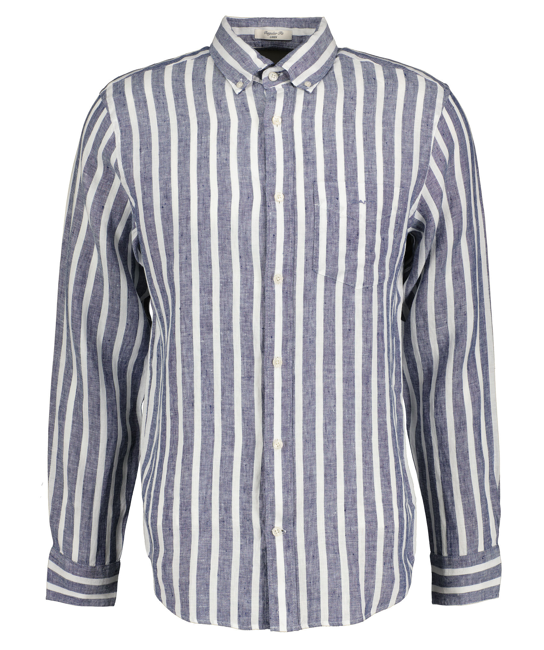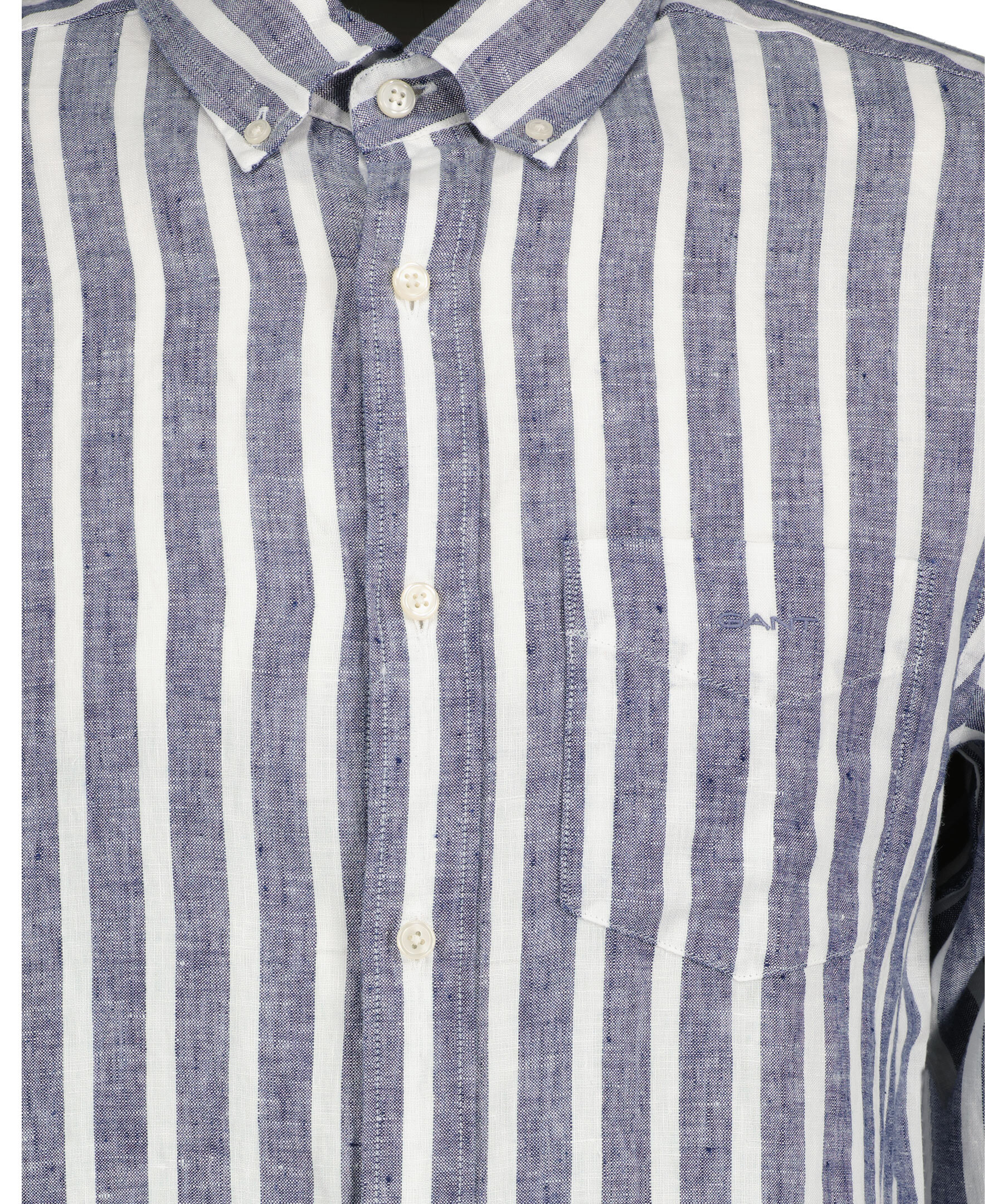 Mörkblå och vit randig linneskjorta i ett perfekt sommarmaterial med yarn-dyed tvätt från Gant. Tillverkad i 100% lin. Broderad GANT-logotyp på bröstfickan. Skjortan har en rundad fåll och normal passform. Boxpleat med locker loop i ryggen.