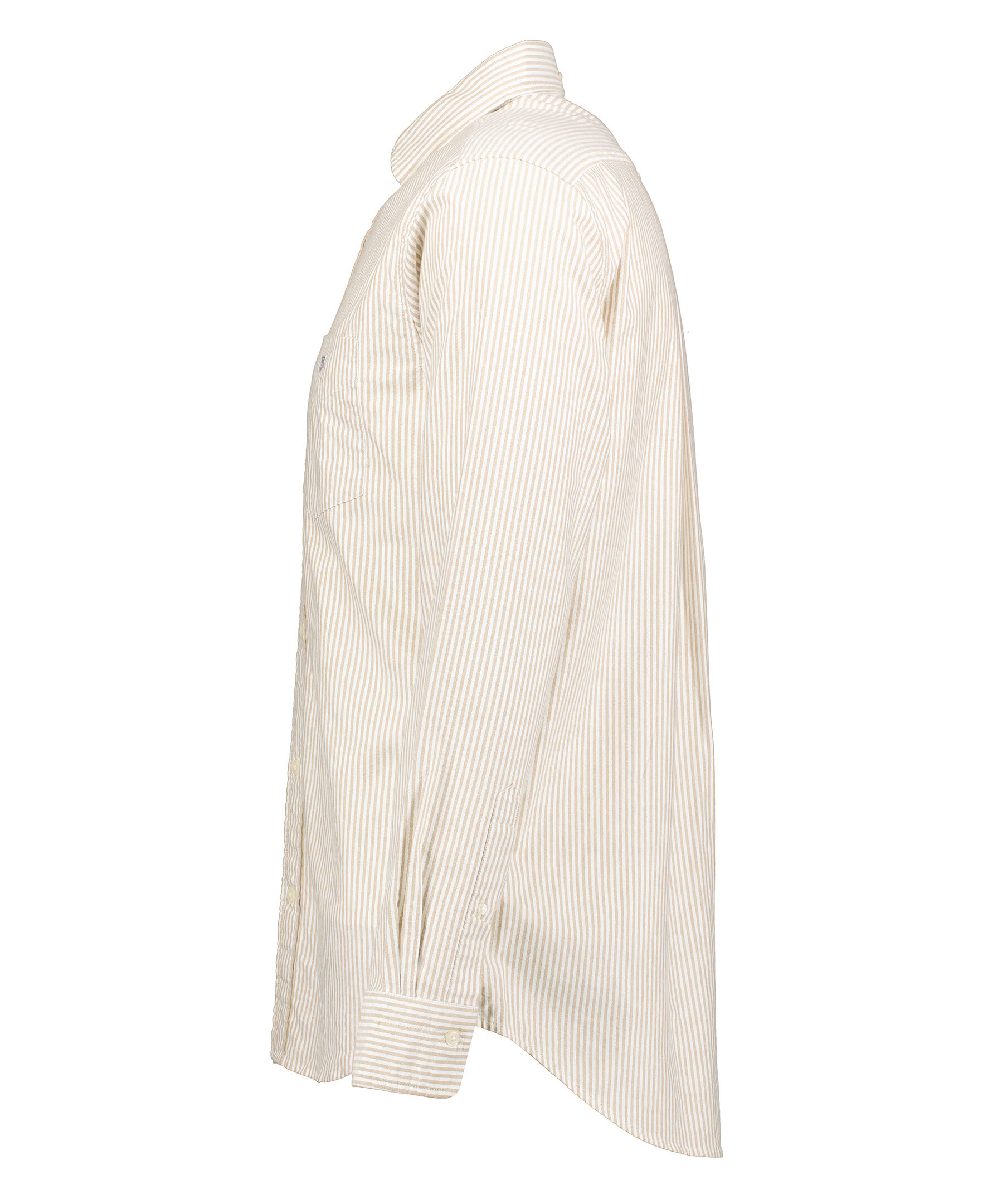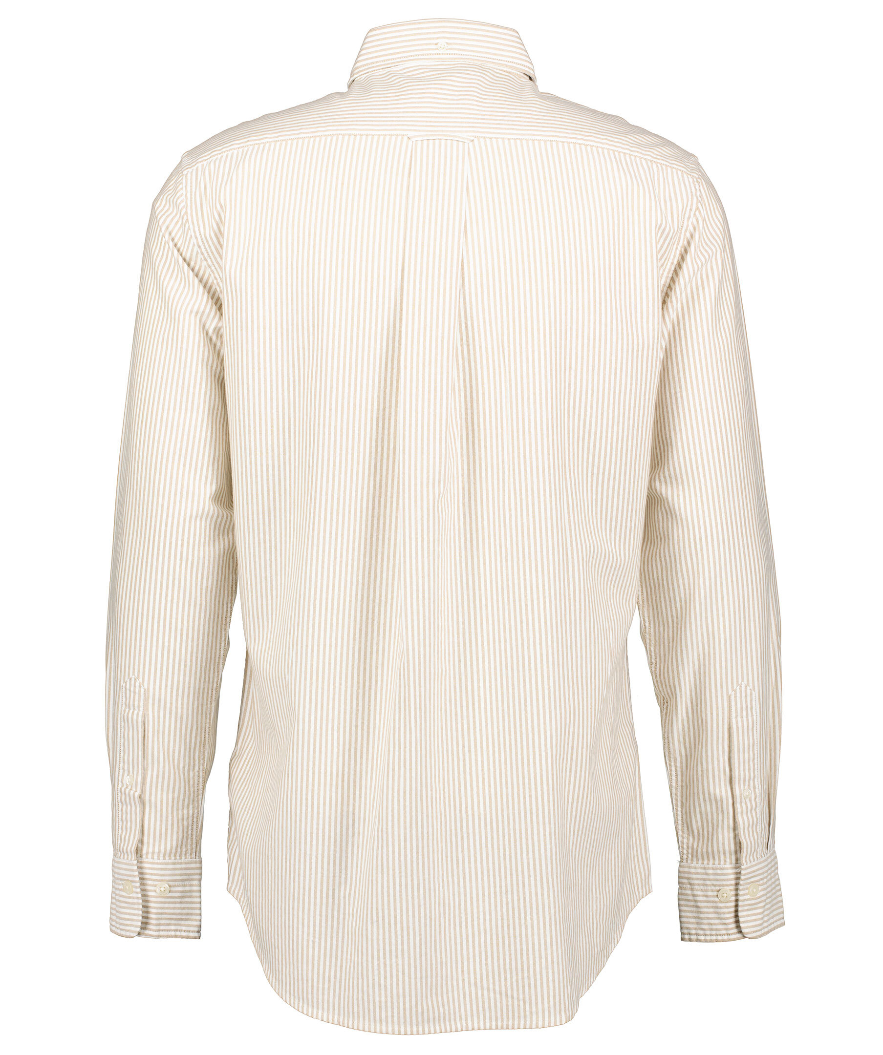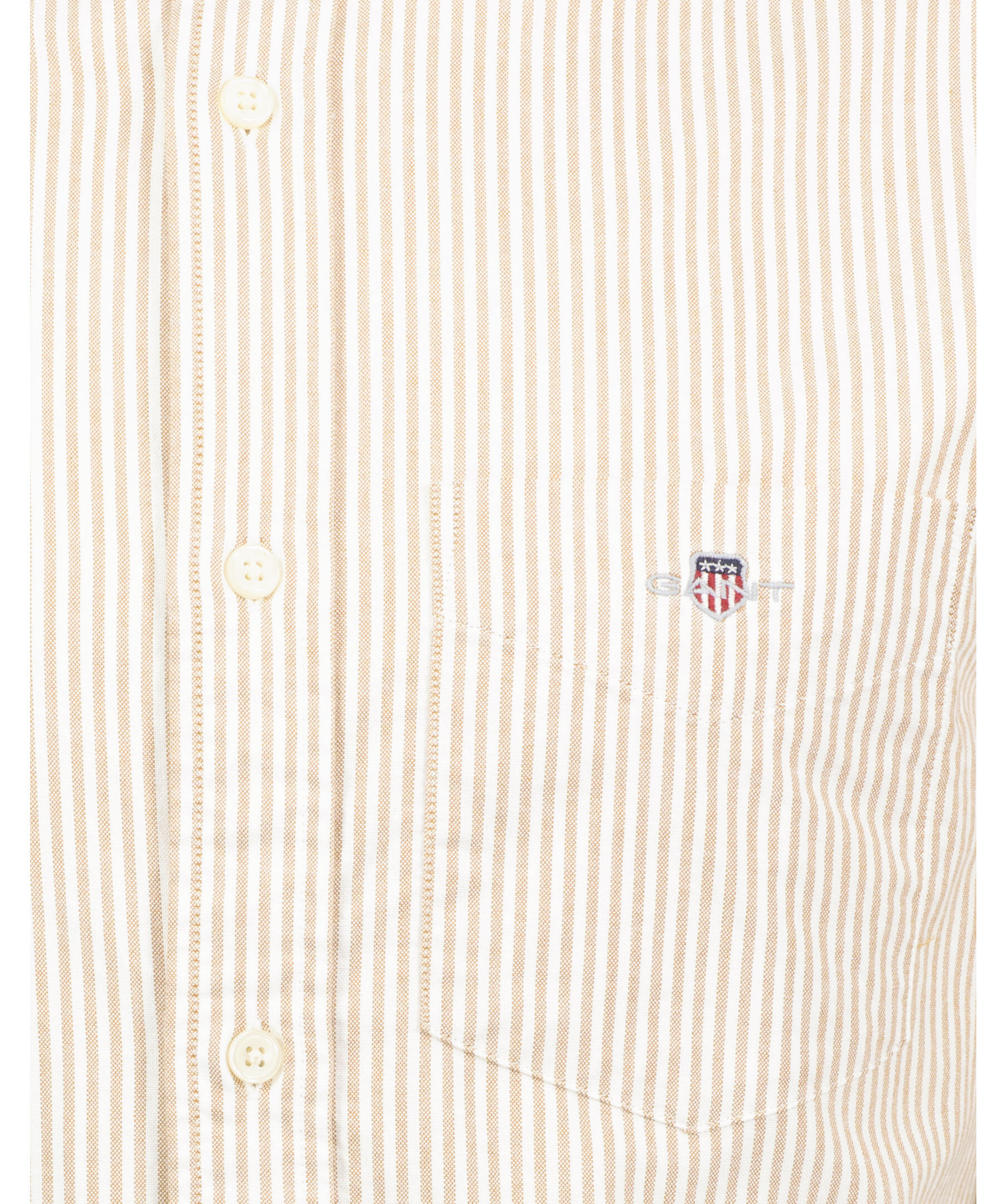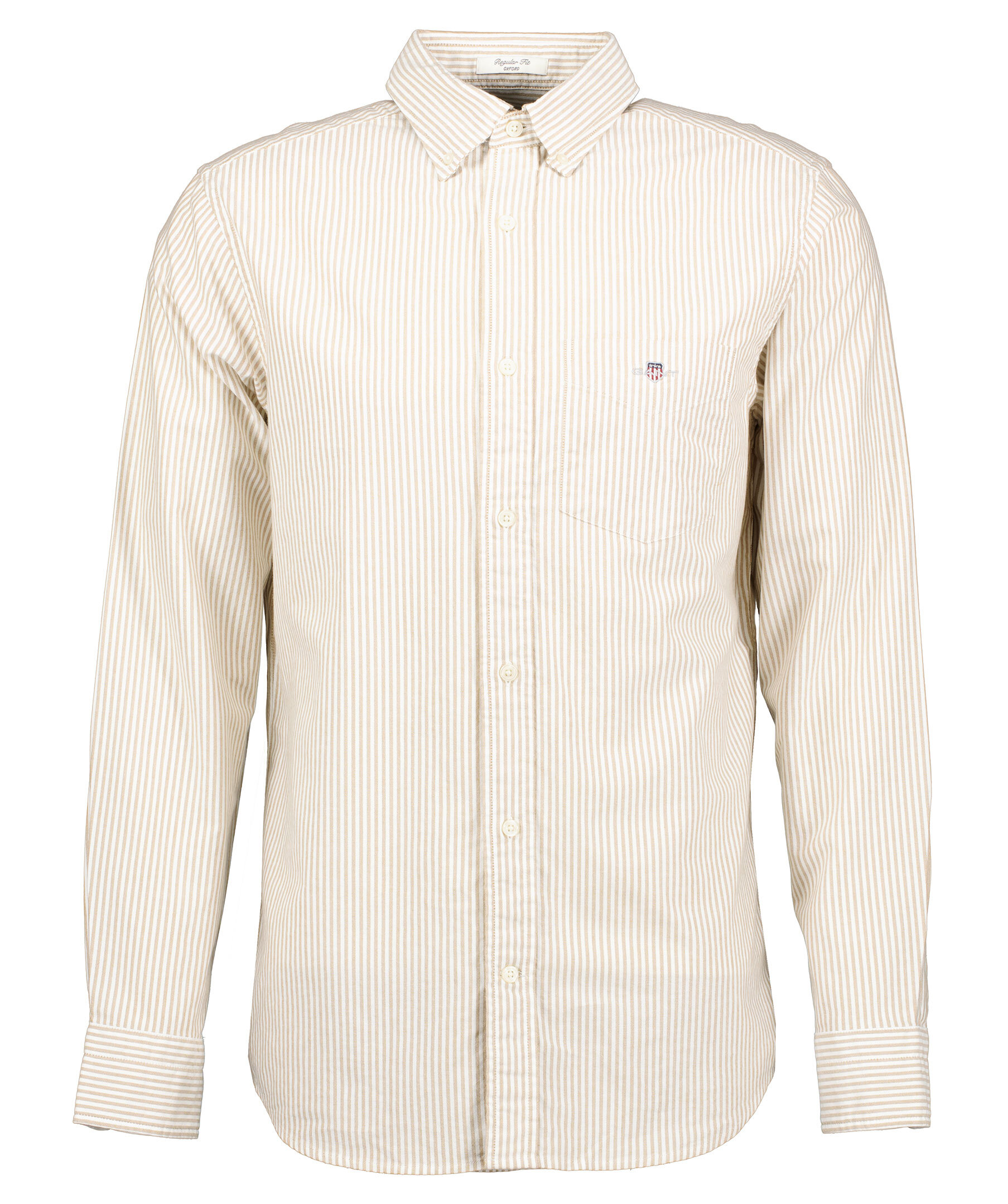 Randig oxfordskjorta från Gant i färgerna vitt och sandfärgat. Button down krage, rundad fåll och en bröstficka med broderad sköldlogotyp. Boxpleat med locker loop i ryggen. Tillverkad i 100% bomull. Normal passform.