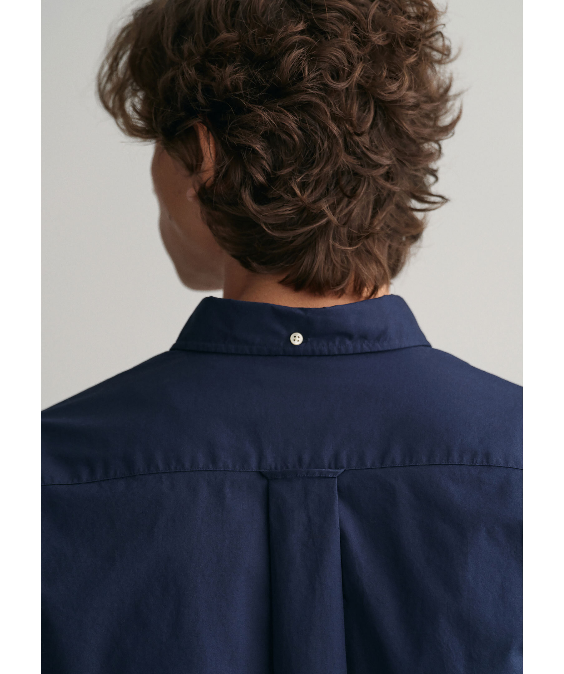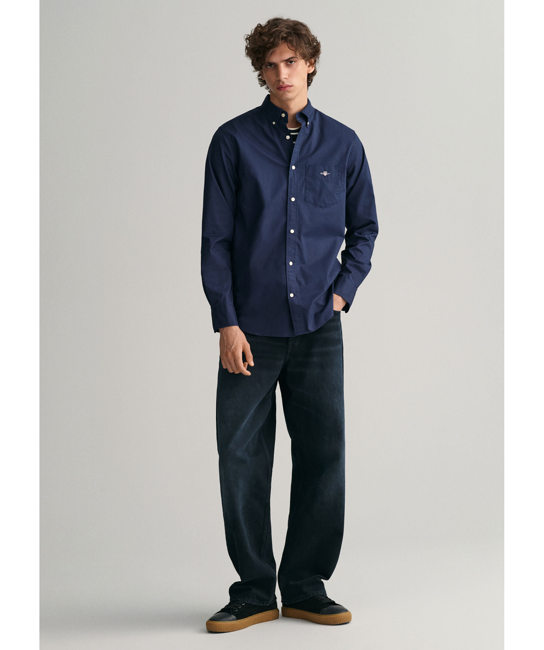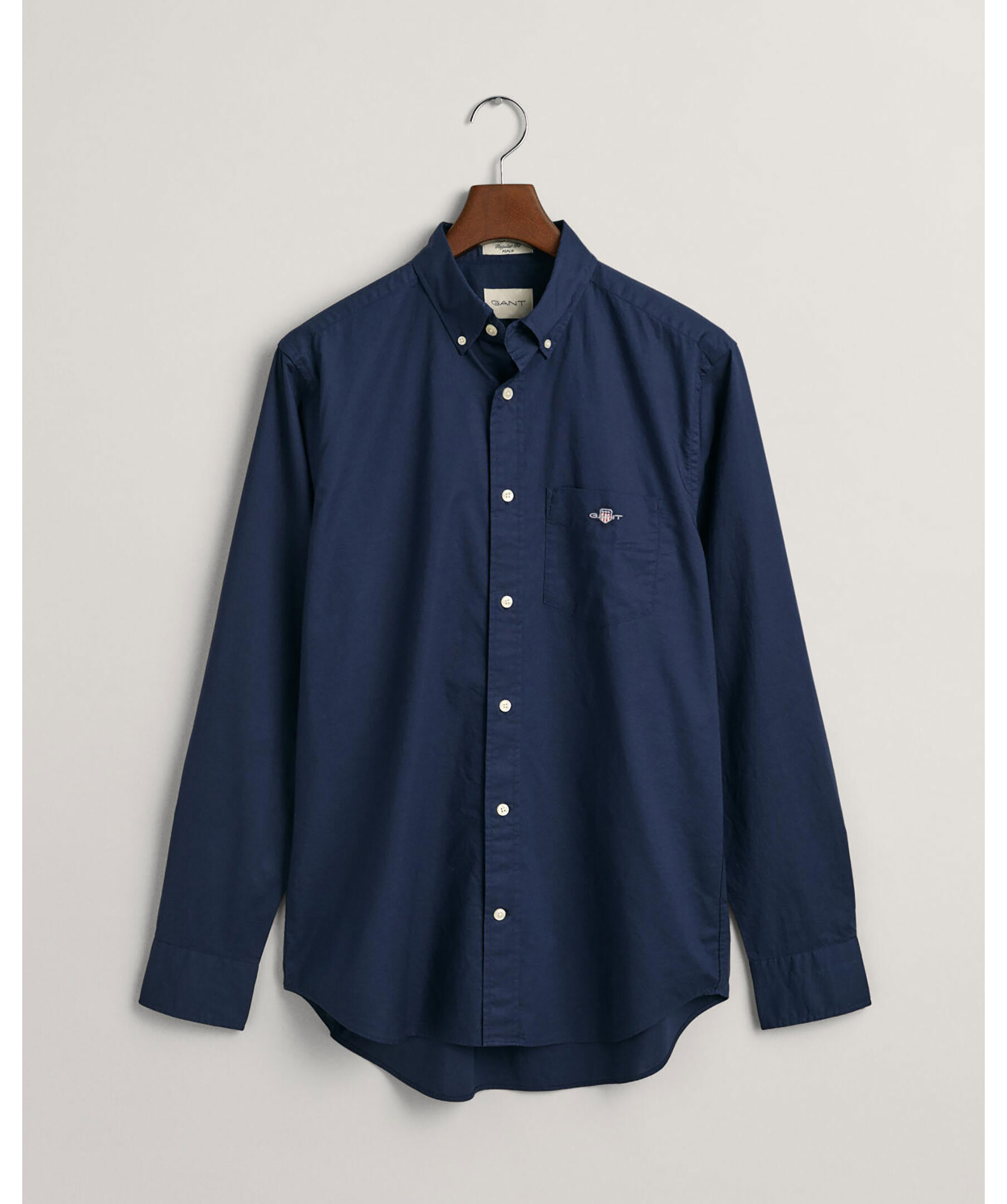 Mörkblå skjorta från Gant. Skjortan har button down krage, boxpleat med locker loop i ryggen, en bröstficka med broderad Gant-logotyp. Tillverkad i en slitstark poplinväv.