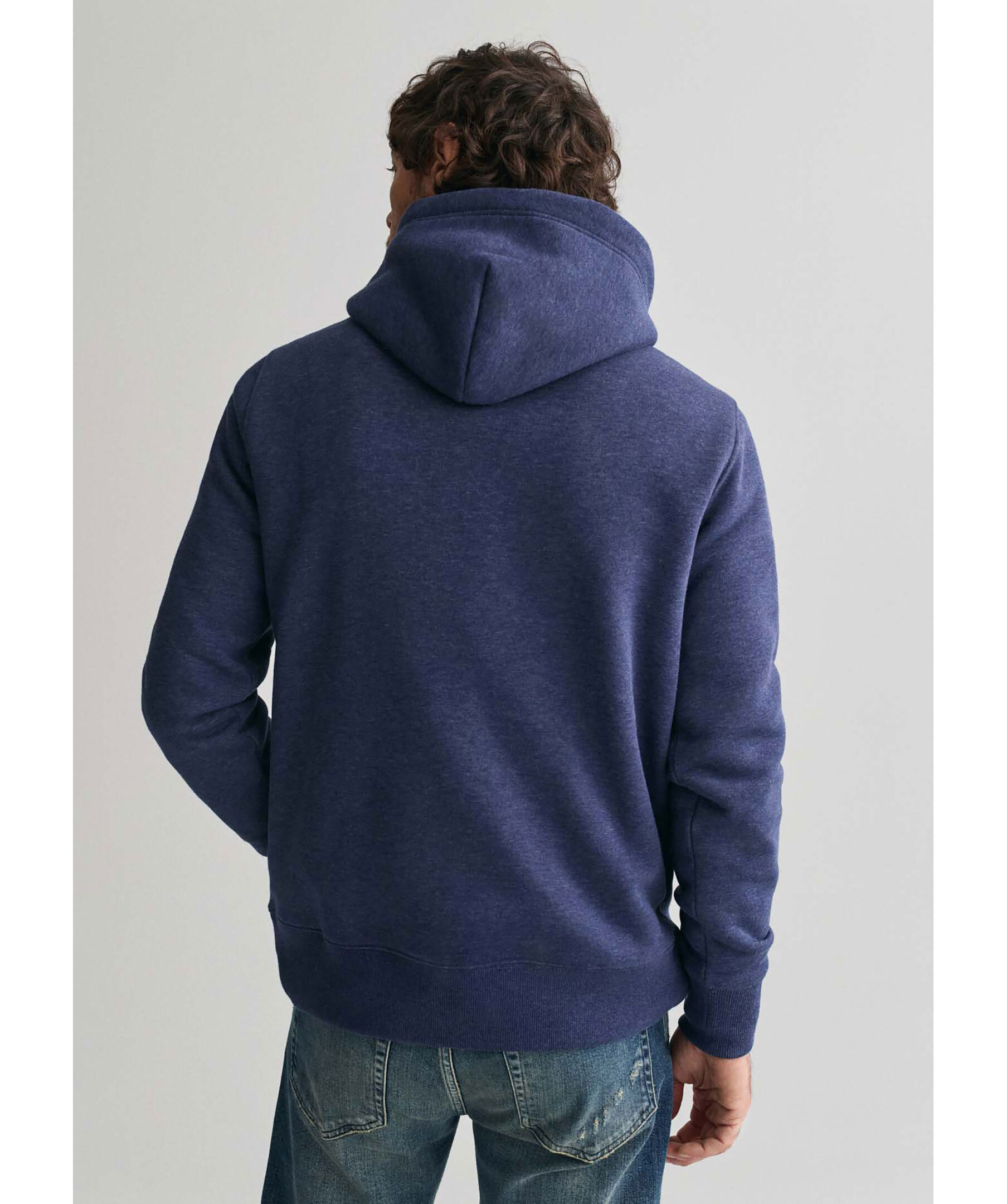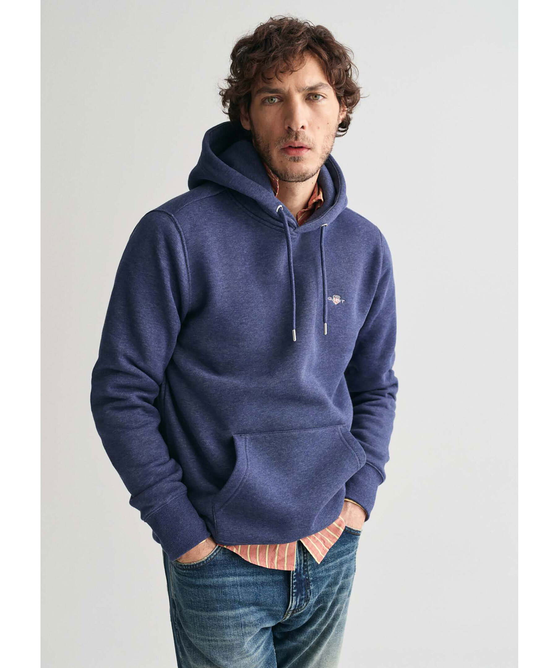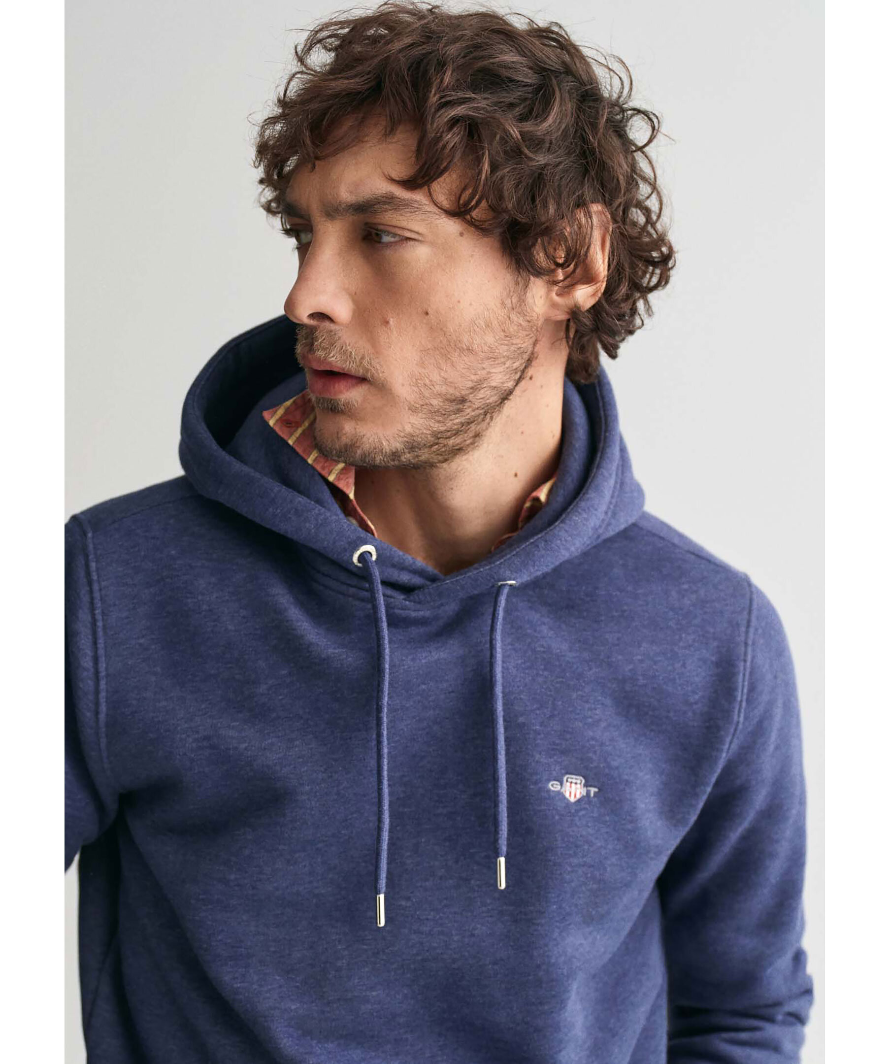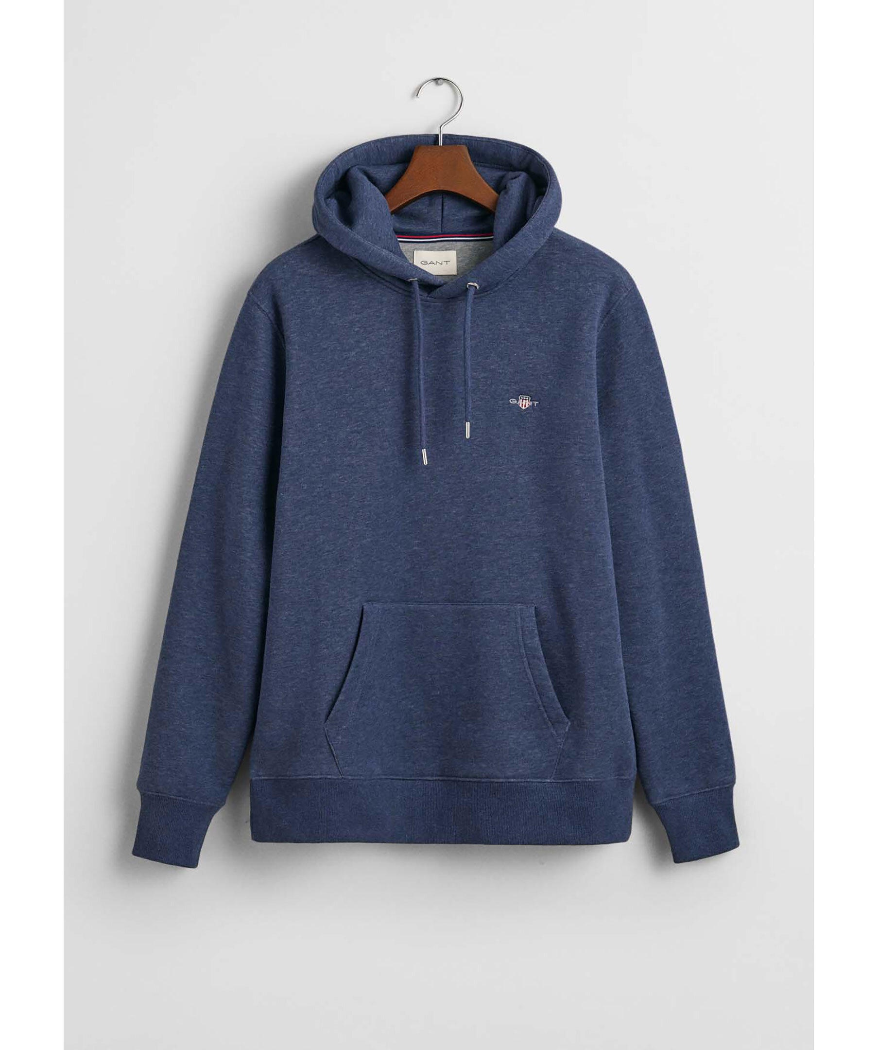 Blå hoodie från Gant. Hoodien har huva, känguruficka på magen, ribbstickade muddar vid ärm- och plaggslut samt broderad Gant-logotyp på bröstet. Tillverkad i en bomullsblandning.