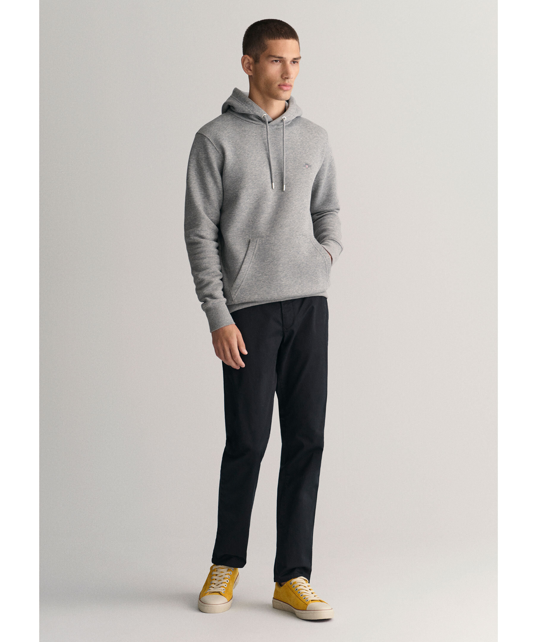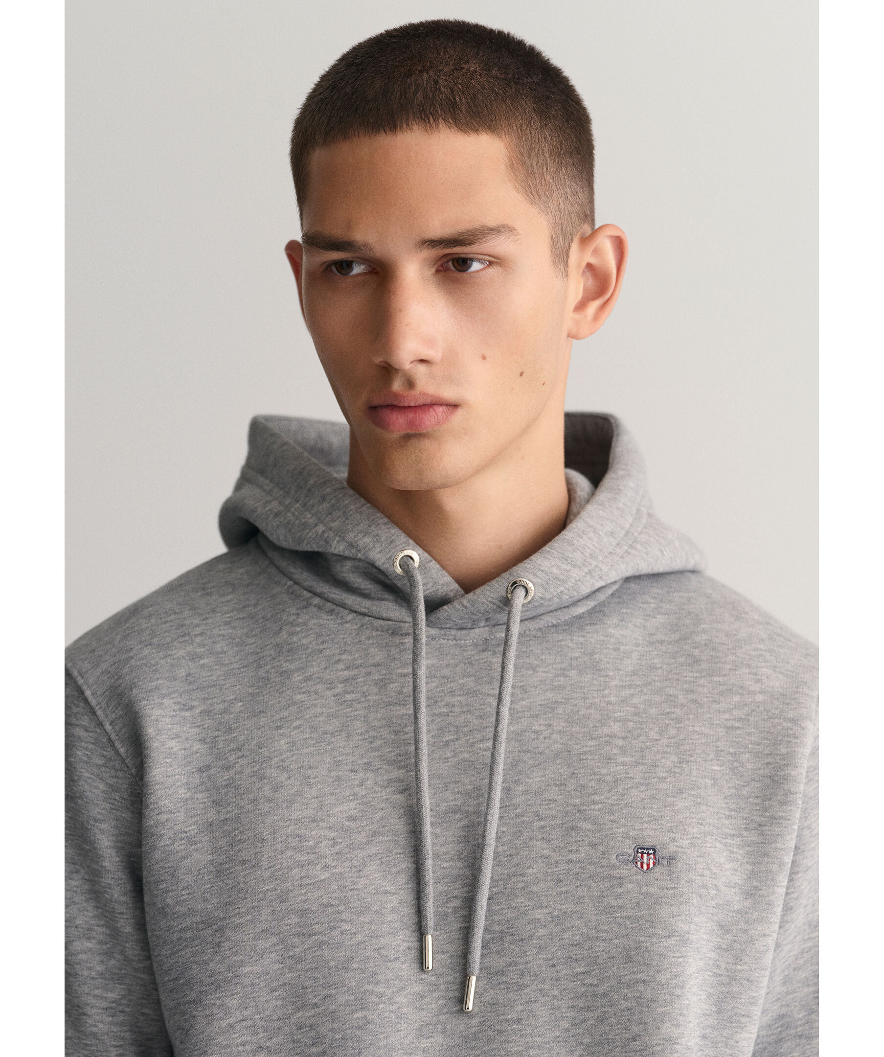 Gråmelerad hoodie från Gant. Hoodien har huva, känguruficka på magen, ribbstickade muddar vid ärm- och plaggslut samt broderad Gant-logotyp på bröstet. Tillverkad i en bomullsblandning.