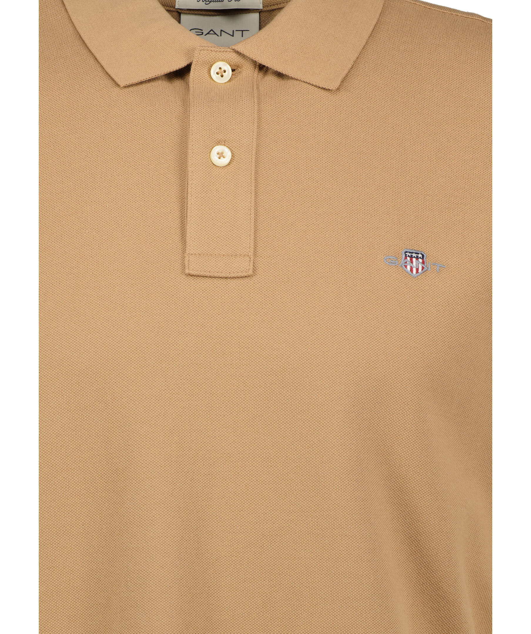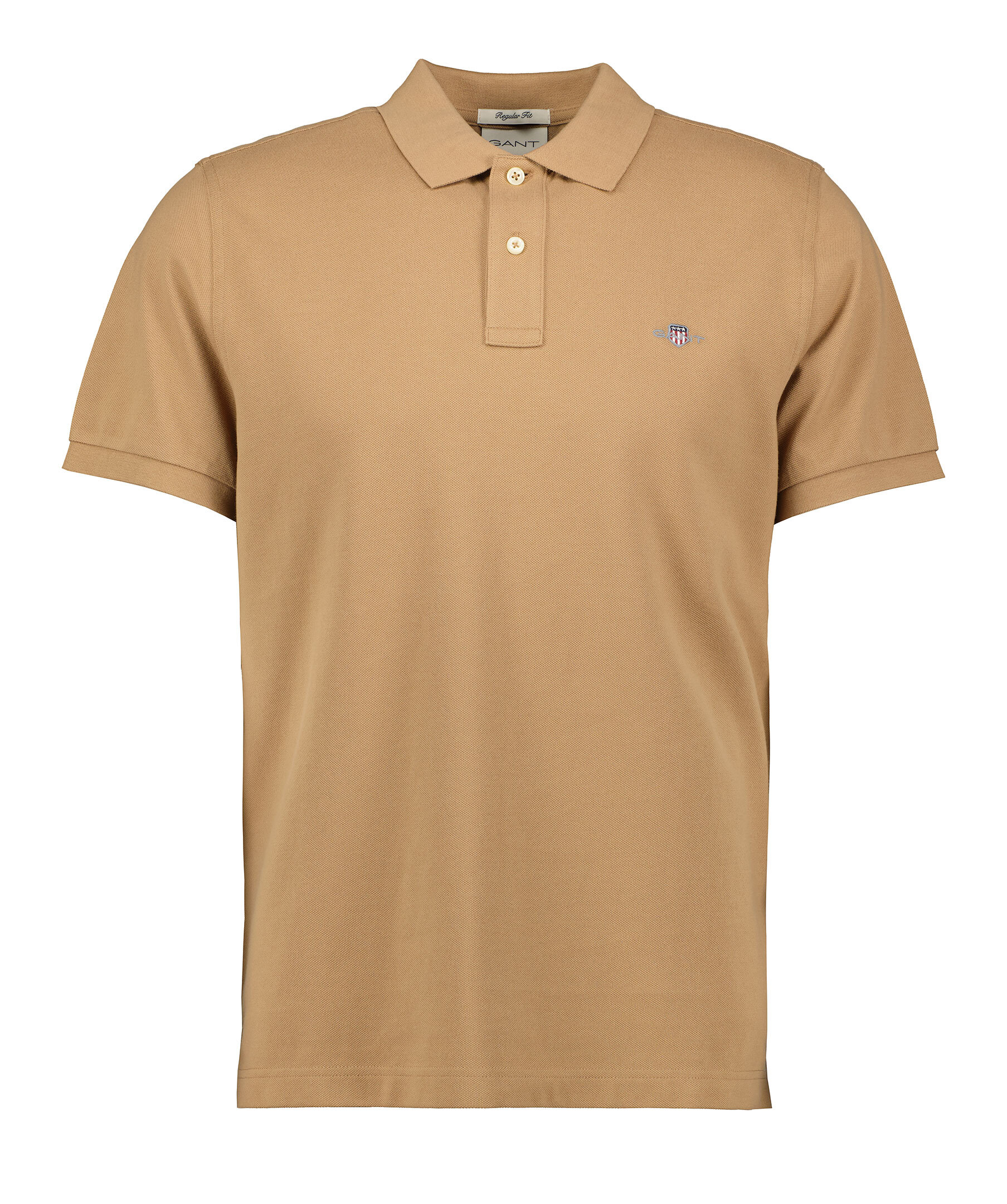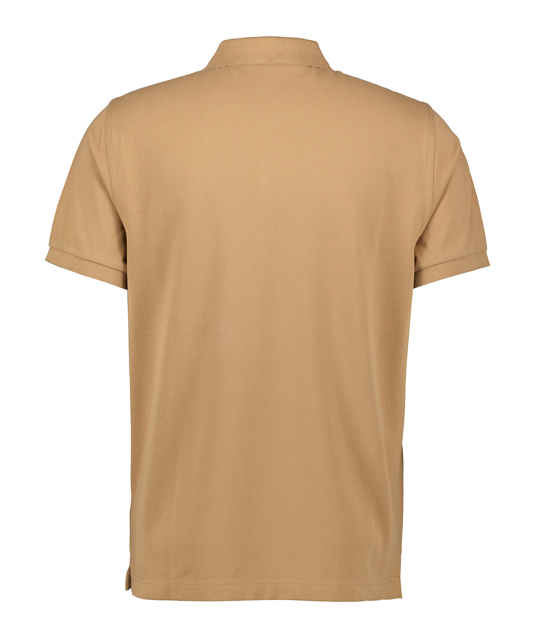 Khakifärgad pikétröja från Gant. Pikén har en klassisk slätstickad krage, knappslå med två knappar, korta sidosprund och broderad Gant-logotyp på bröstet. Tillverkad i bomull.