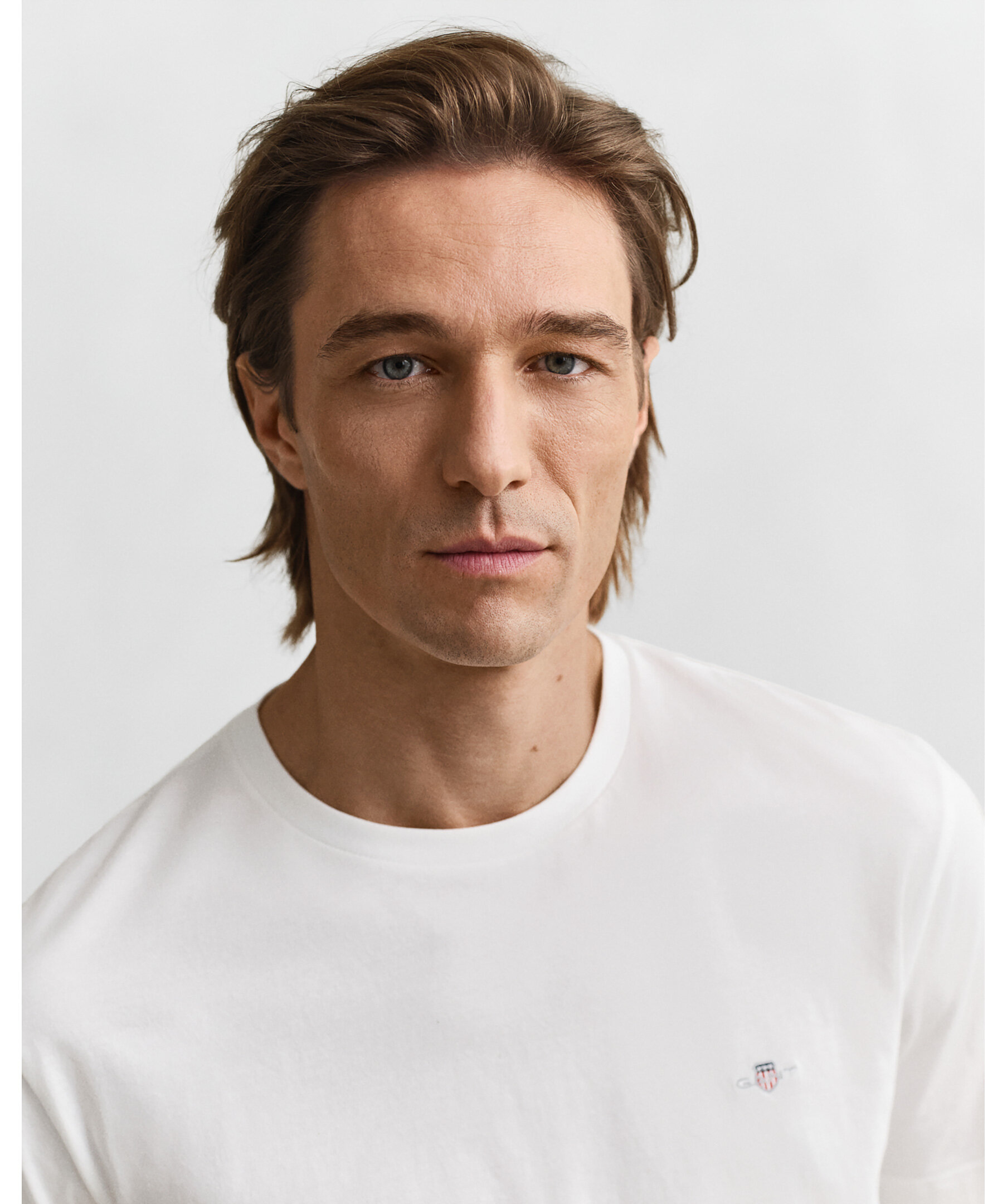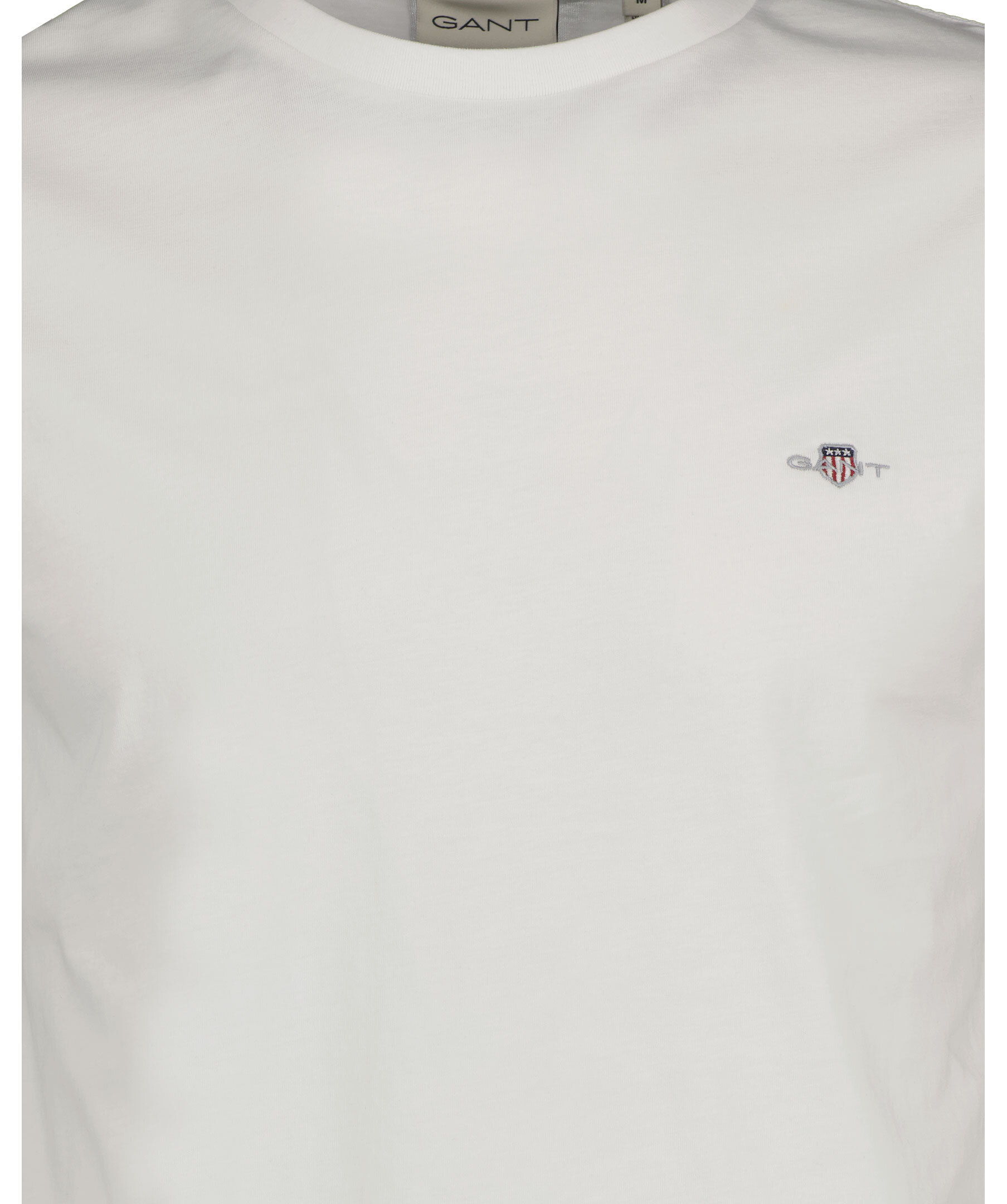 Vit t-shirt med en liten sköldlogotyp broderad på bröstet från Gant. Tillverkad i bomull med en fin ribbstickning i halsringningen för ultimat komfort. Ett fantastiskt basplagg du kan använda separat eller under en stickad tröja, jacka eller matcha med jeans, chinos eller shorts.