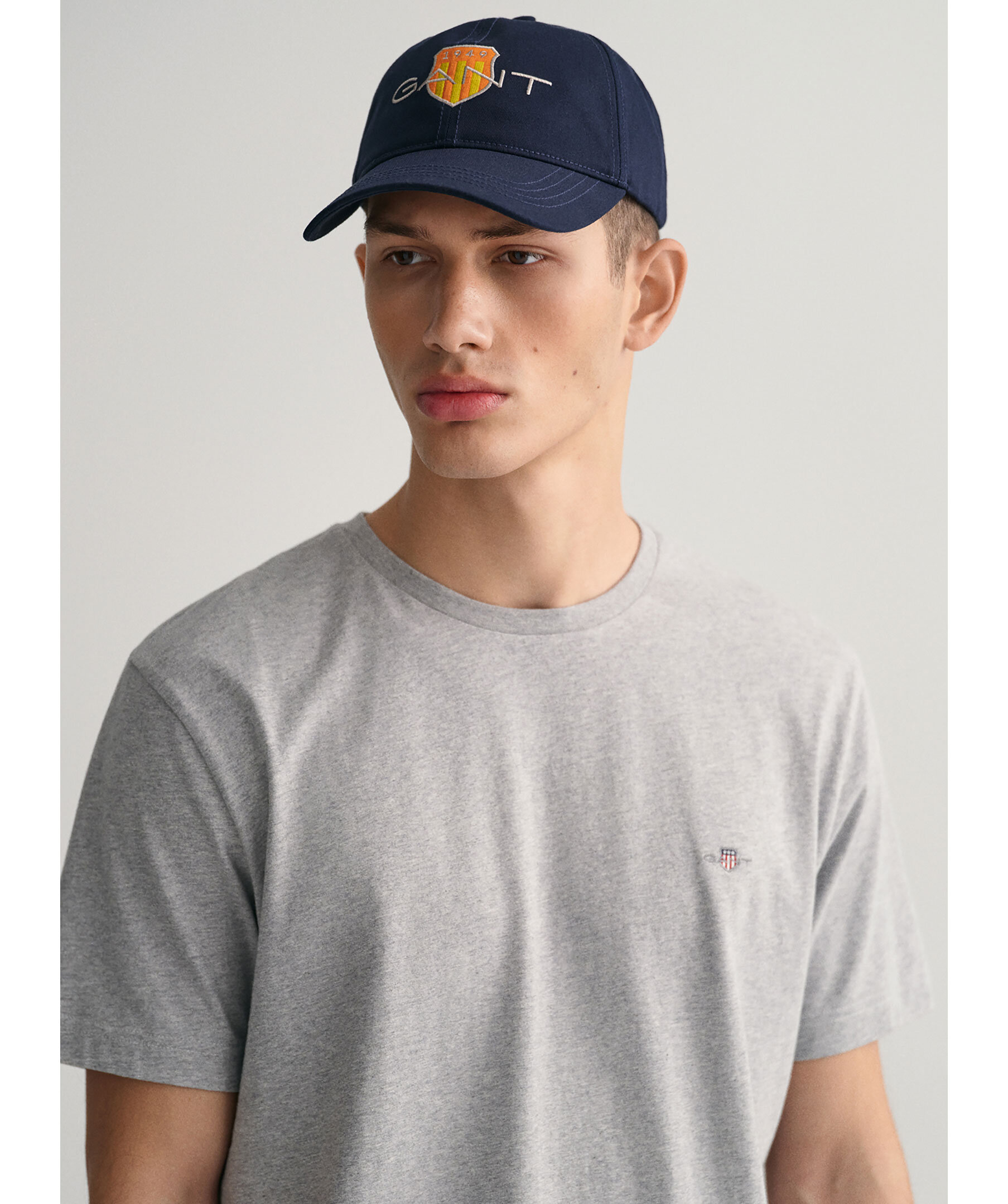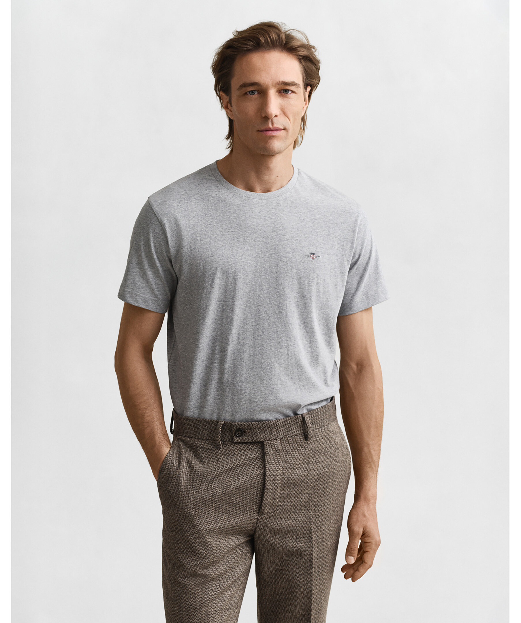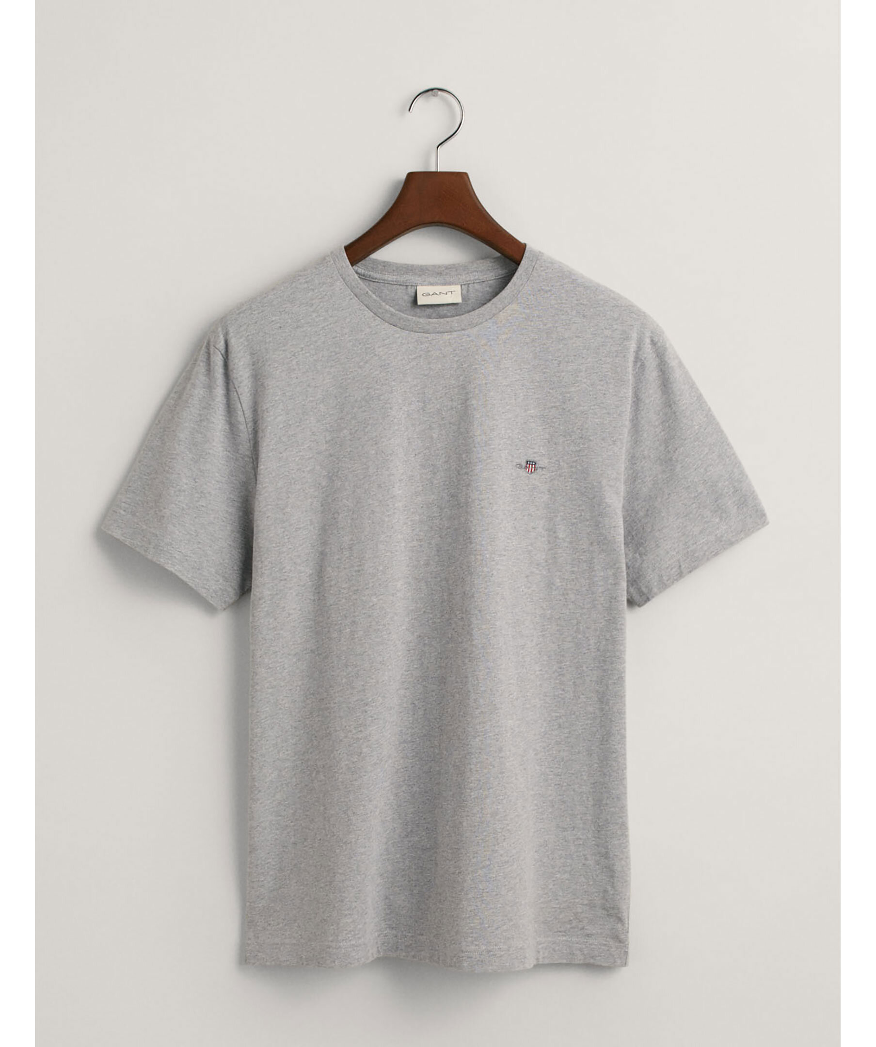 Gråmelerad t-shirt med en liten sköldlogotyp broderad på bröstet från Gant. Tillverkad i bomull med en fin ribbstickning i halsringningen för ultimat komfort. Ett fantastiskt basplagg du kan använda separat eller under en stickad tröja, jacka eller matcha med jeans, chinos eller shorts.