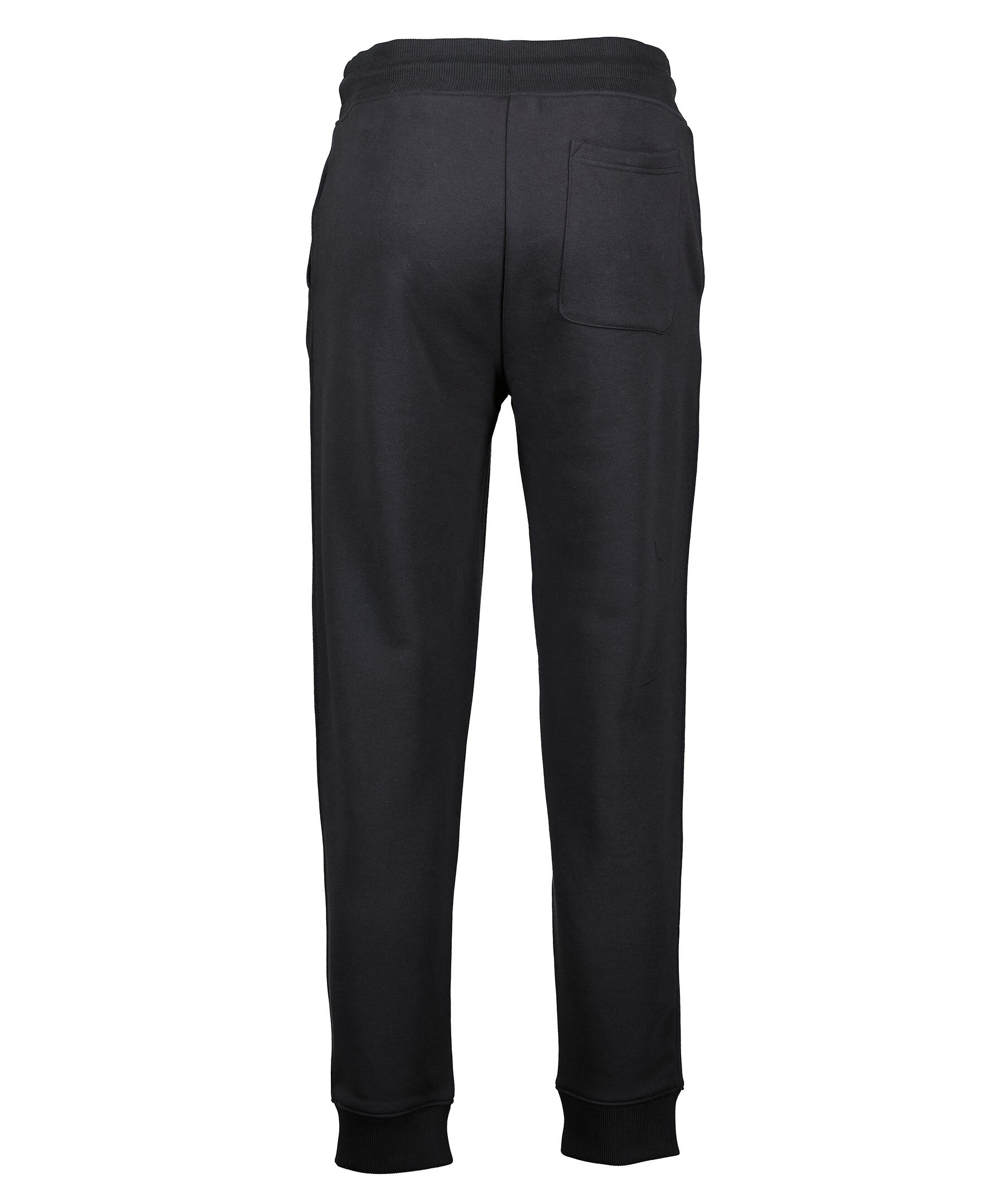 Svarta sweatpants i mjuk bomullspolyester från Gant. Detaljer som ribbstickning vid linning och muddar för en välskuren silhuett. Byxorna har två framfickor och en bakficka på höger sida, och blir snabbt en storfavorit i garderoben. Broderad sköldlogotyp vid vänster ficka.