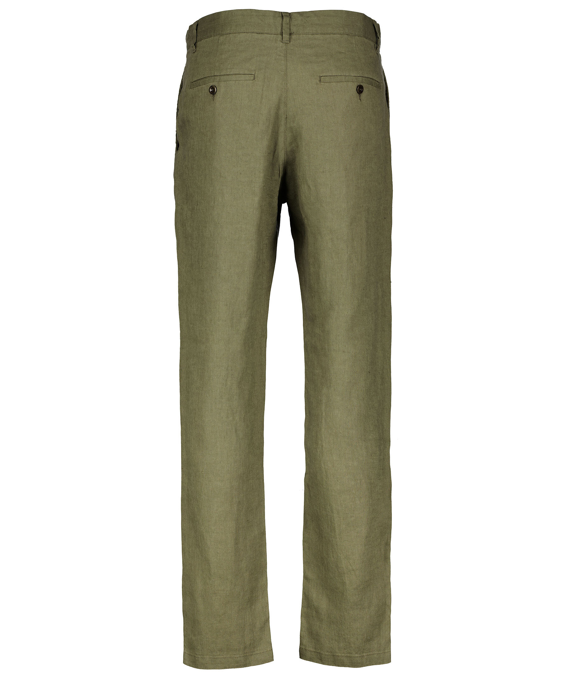 Militärgröna byxor i linne från Gant. Dragsko i midjan, hällor för skärp. Gylf med dragkedja och knapp. Två fickor framtill, två fickor bak som stängs med knapp. Mellanhög midja, relaxed fit i benen.