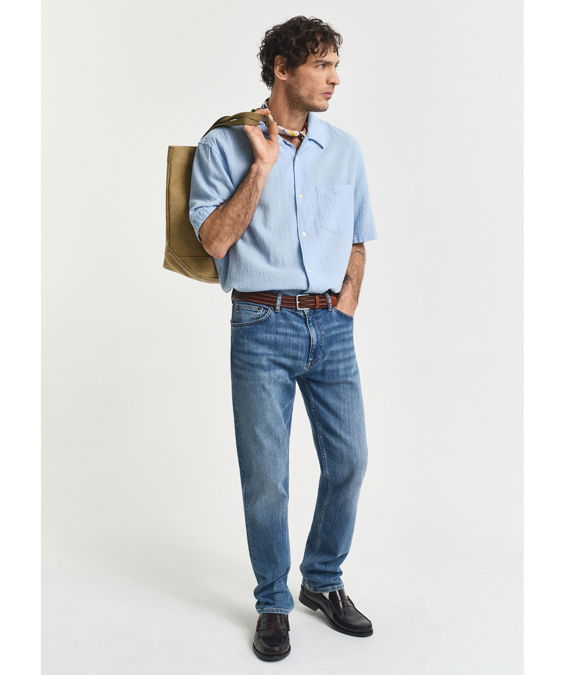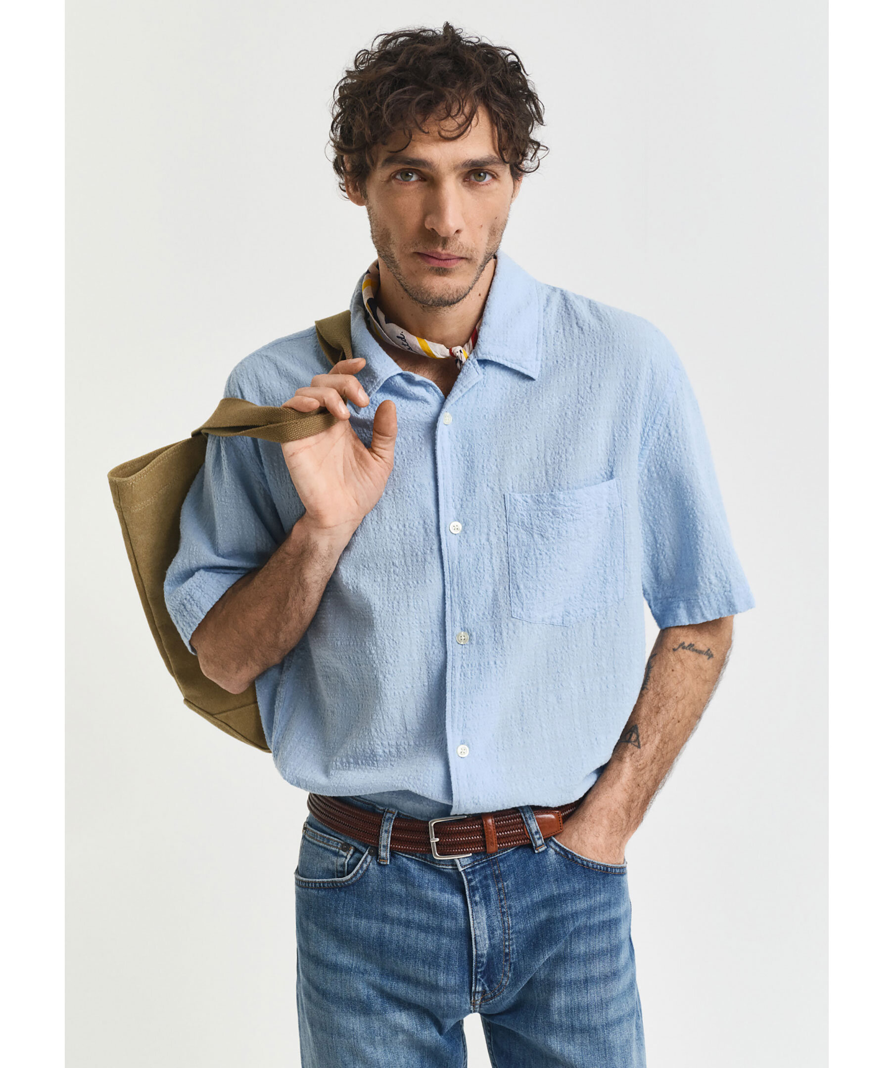 Ljusblå, kortärmad skjorta med textur från Gant. Skjortan stängs med knappar och har en bowlingkrage samt en bröstficka med diskret logotyp. Tillverkad i en bomullsblandning.
