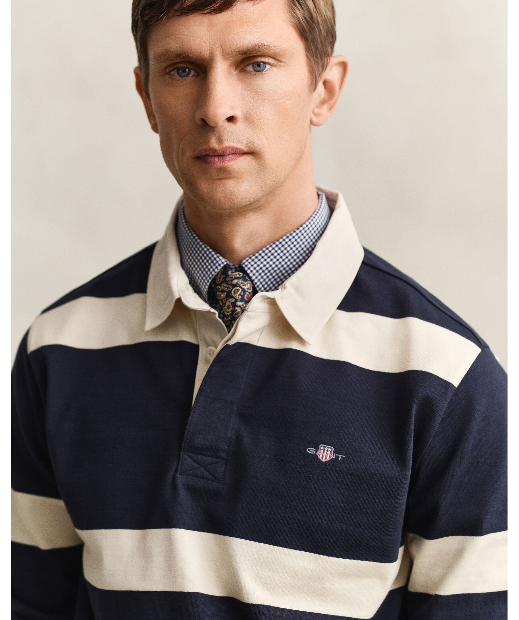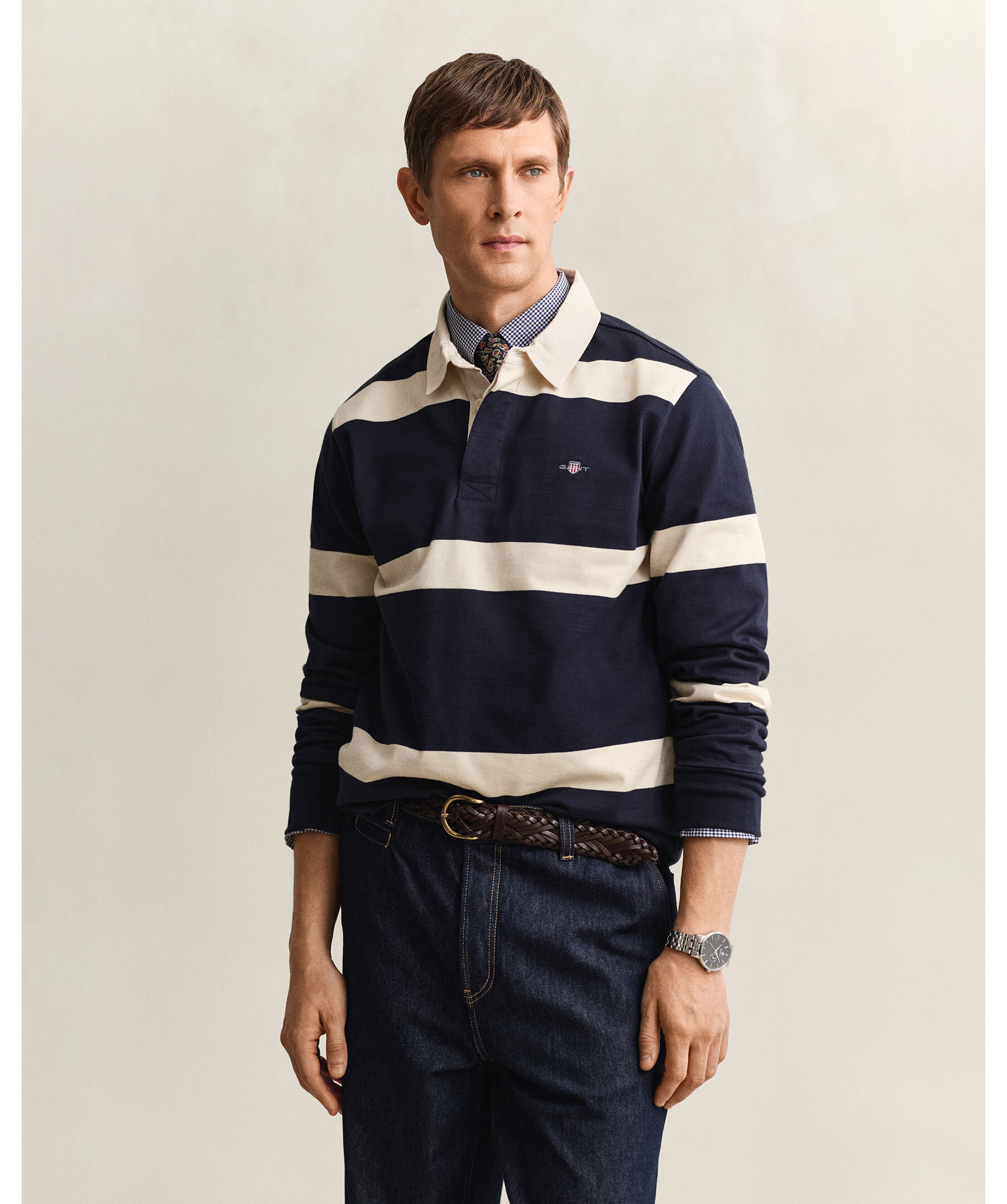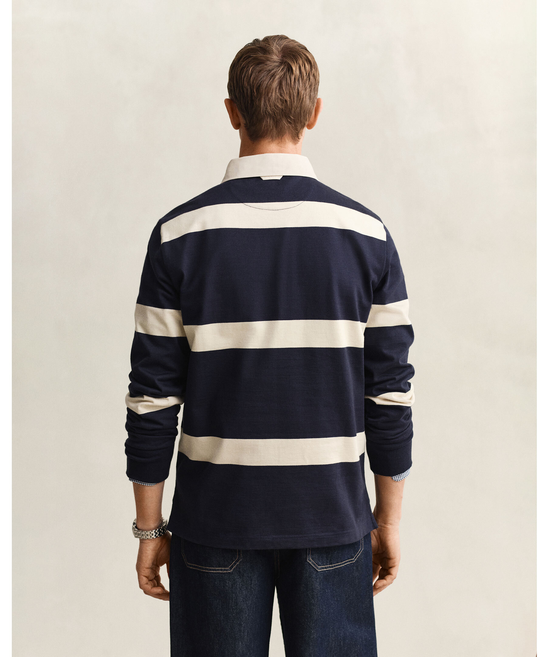 Randig rugbytröja från Gant. Tillverkad i 100 % bomull med garnfärgade ränder och normal passform. Den har klassisk twillkrage, ribbade muddar, knappslå och sidslitsar. Bröstet pryds av sköldbroderi och baktill finns märkets karakteristiska hängögla.