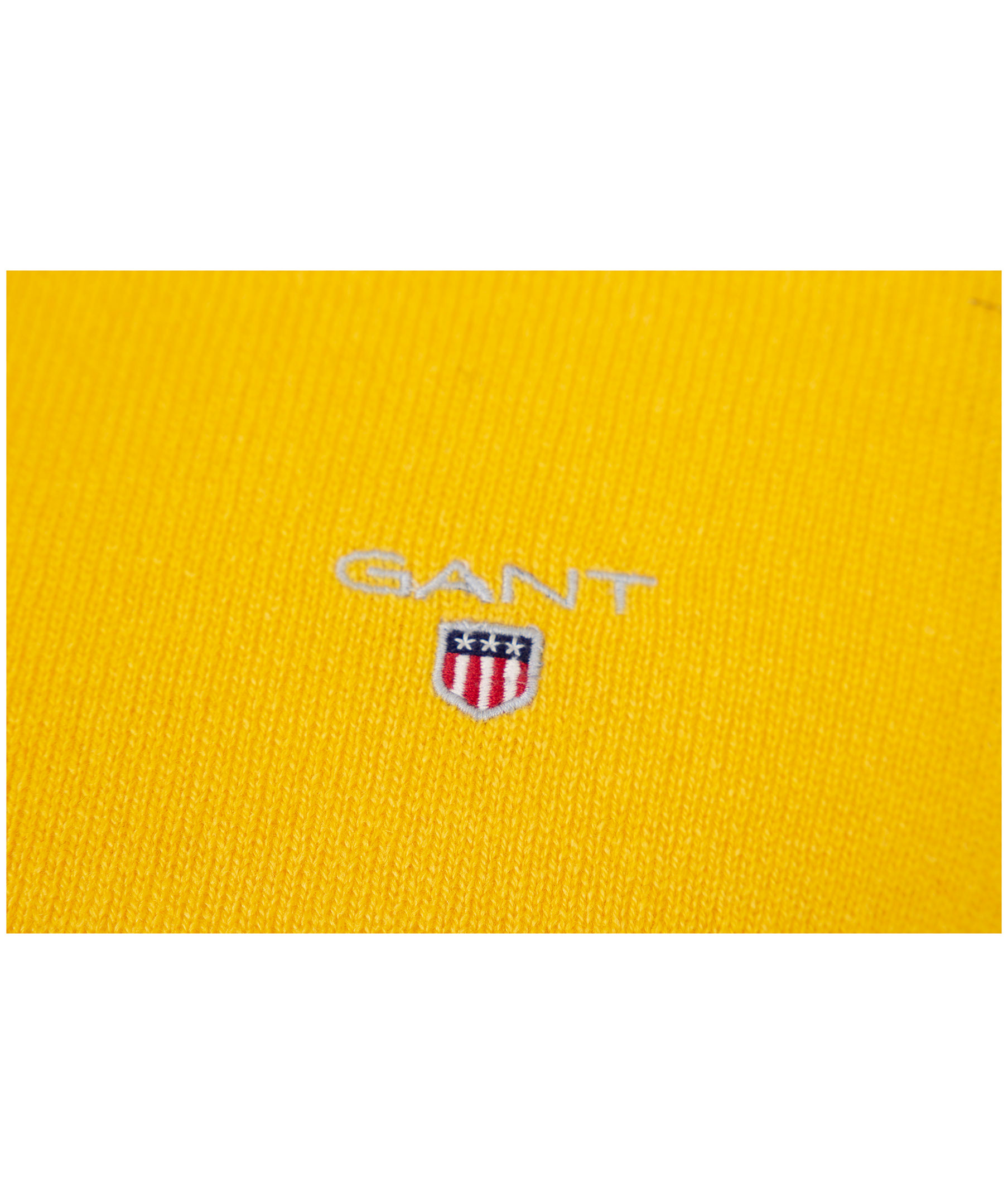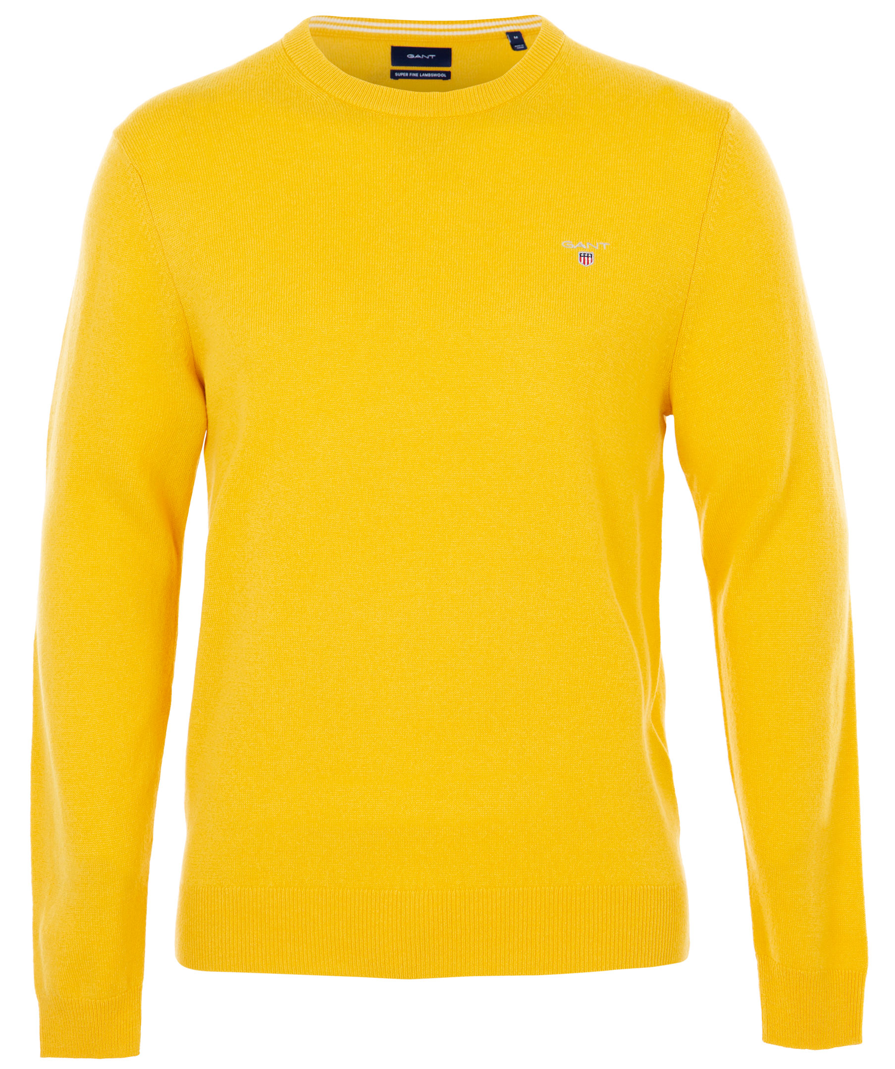 Gul, finstickad tröja från Gant med rundhals och broderad logga på bröstet. Gjord i 100% ull.