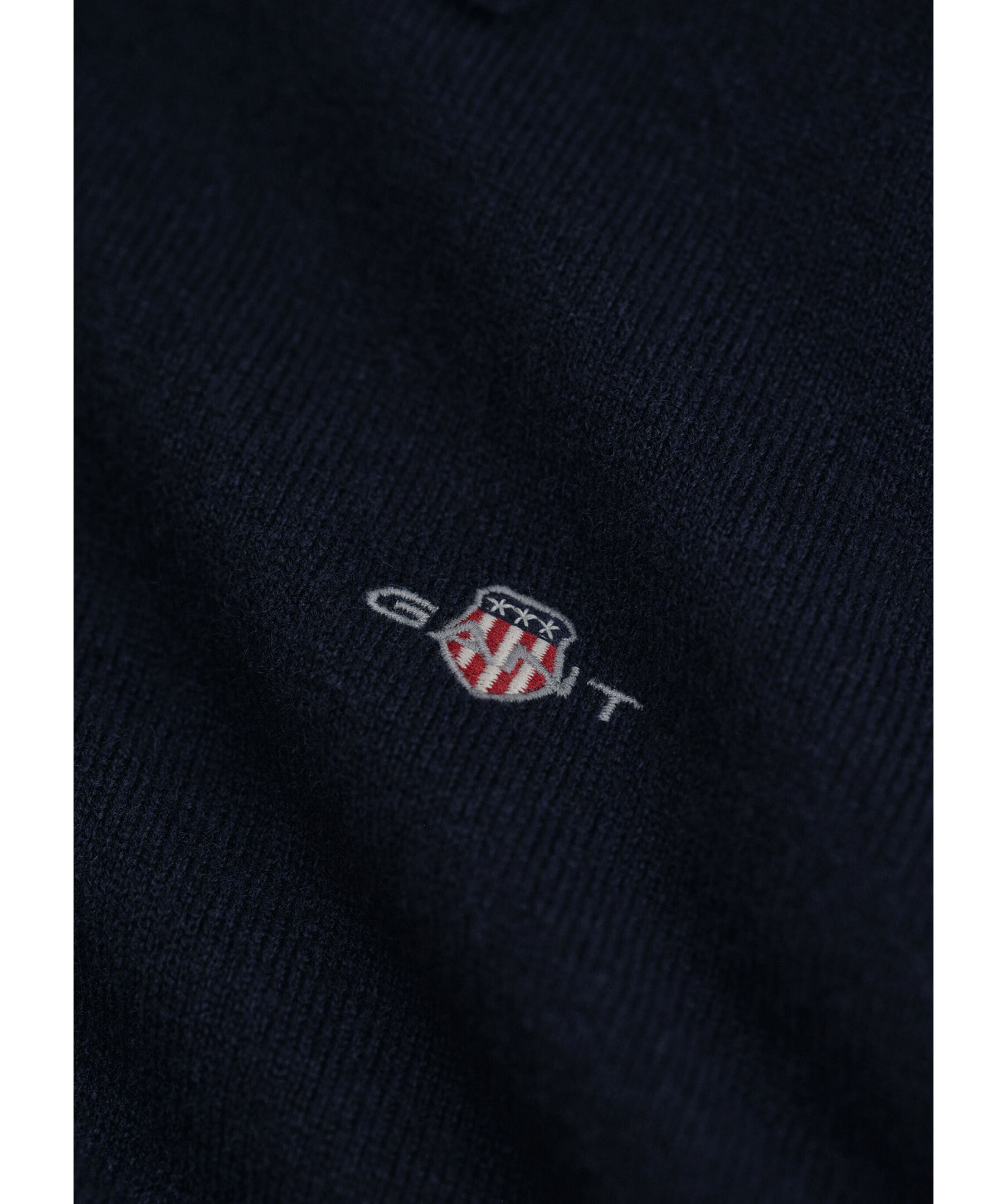 Marinblå, långärmad pikétröja från Gant. Pikén har tre knappar framtill, ribbstickade muddar och broderad logotyp på bröstet. Tillverkad i lammull.