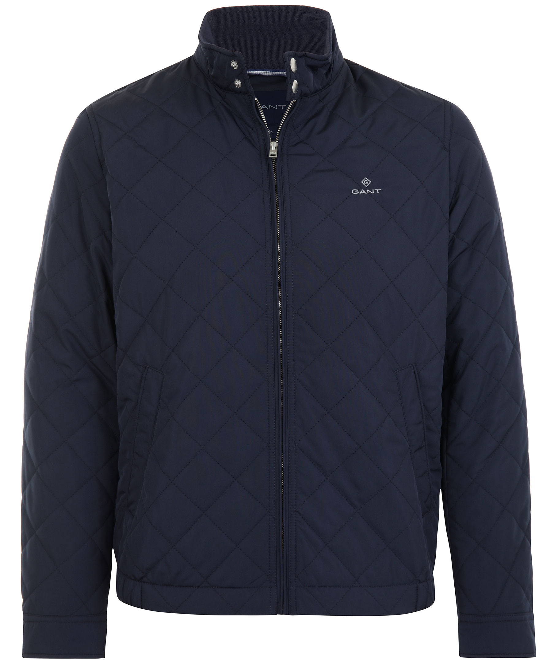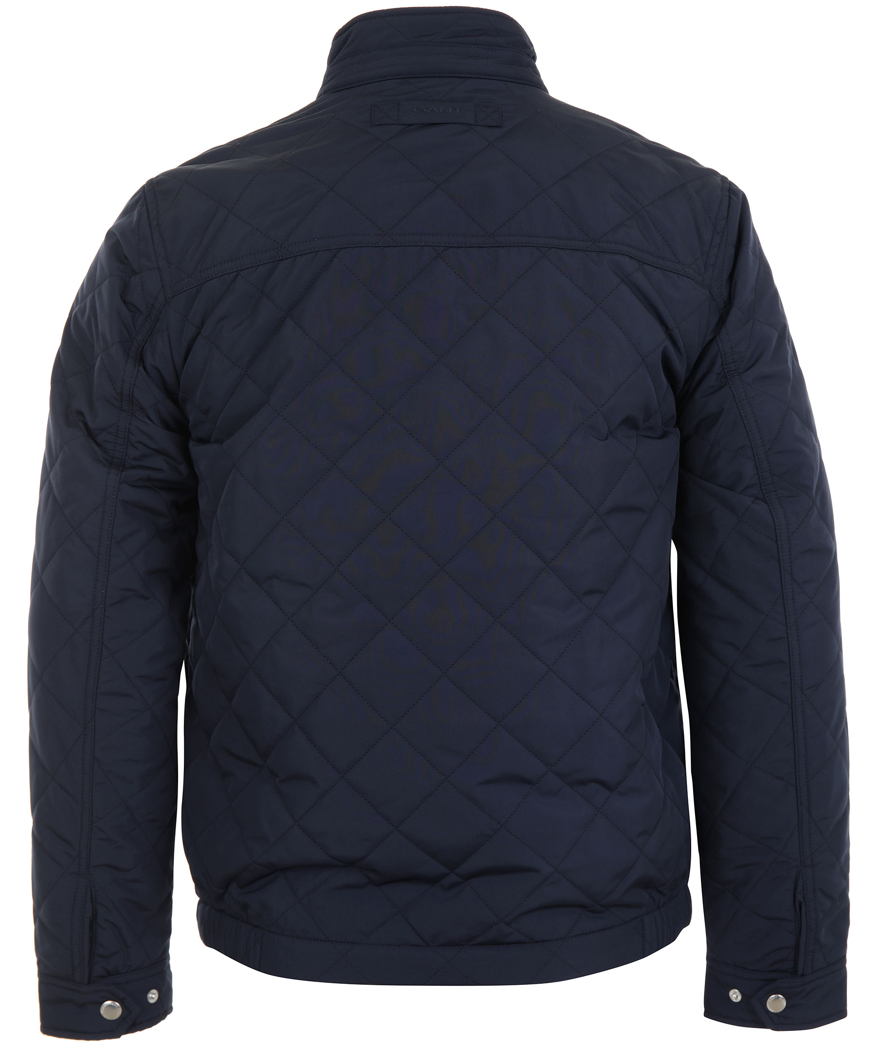 Marinblå, quiltad jacka från Gant. Jackan har hög krage, dragkedja framtill, två innerfickor, två snedställda framfickor med knapp samt brodyr på vänster bröst. Två knappar fram på kragen och två knappar på ärmslut som kan justera ärmslutet.