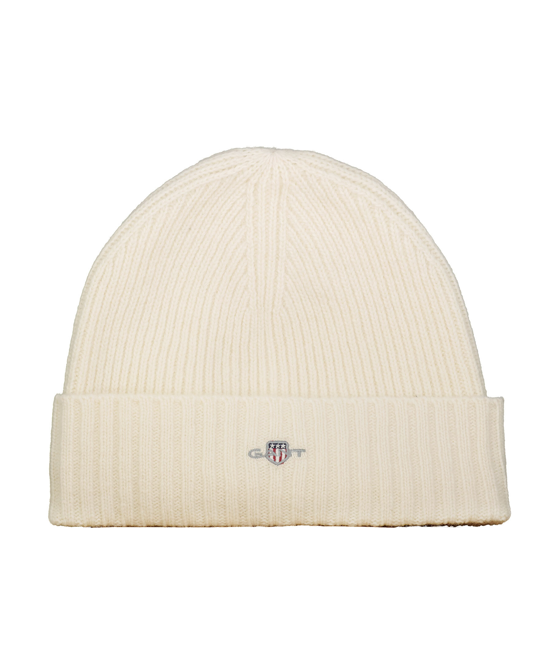 Krämvit klassisk ribbstickad mössa som passar till det mesta från Gant. Den är gjord i en mjuk och skön ullblandning med en normal passform och en liten sköldlogotyp broderad på mitten av uppvikningen.