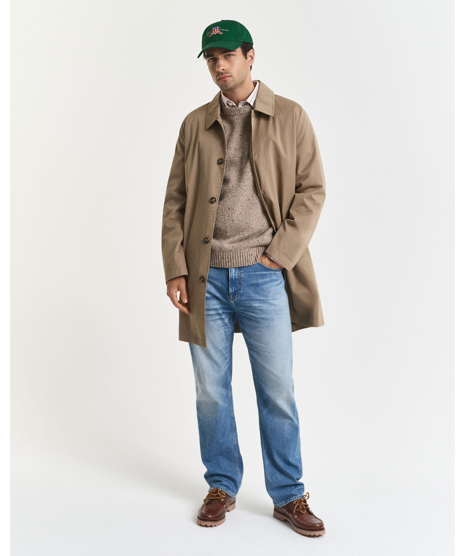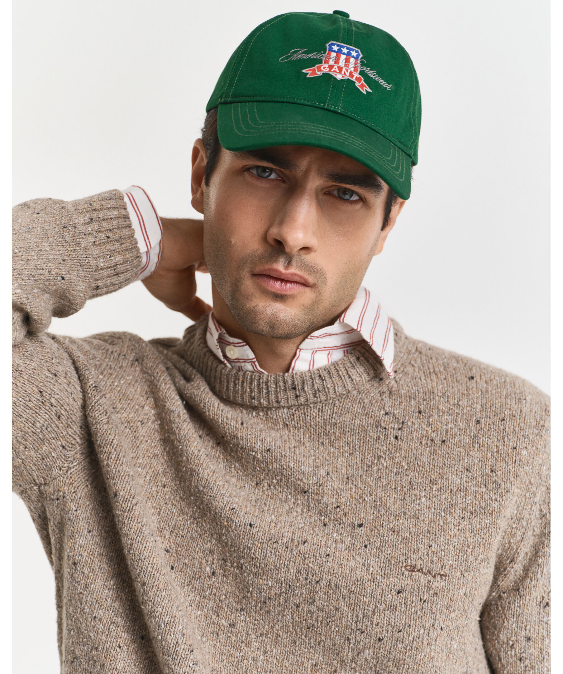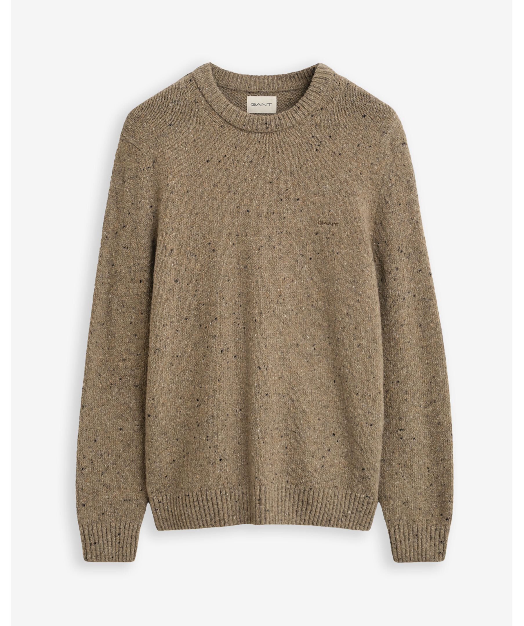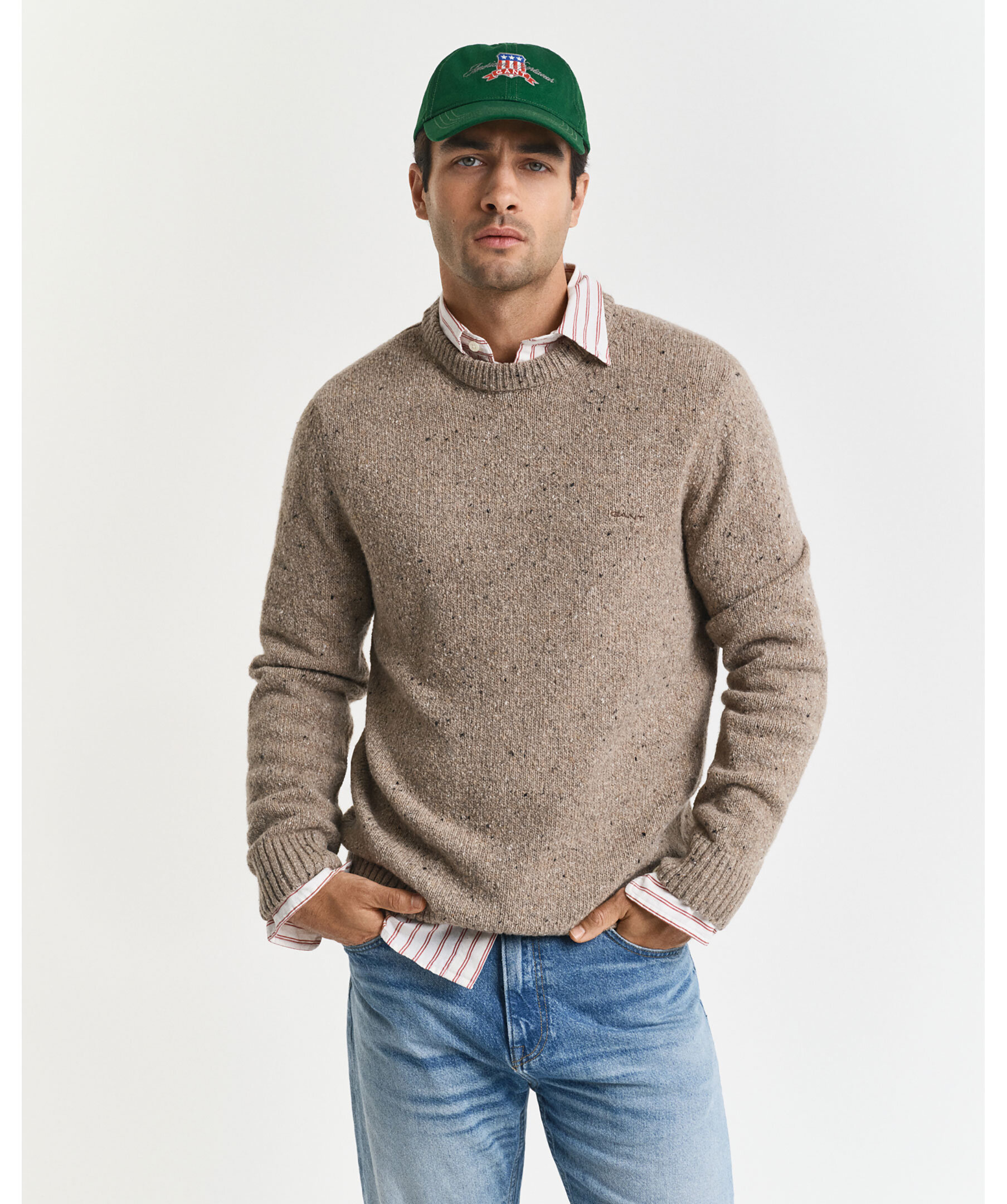Beige, stickad tröja från Gant i nepsgarn. Nepsgarnet i den mjuka italienska ullblandningen skapar en vacker spräcklig effekt. Tröjan har klassisk rund halsringning, ribbstickade muddar och diskret GANT-logo broderad på bröstet.