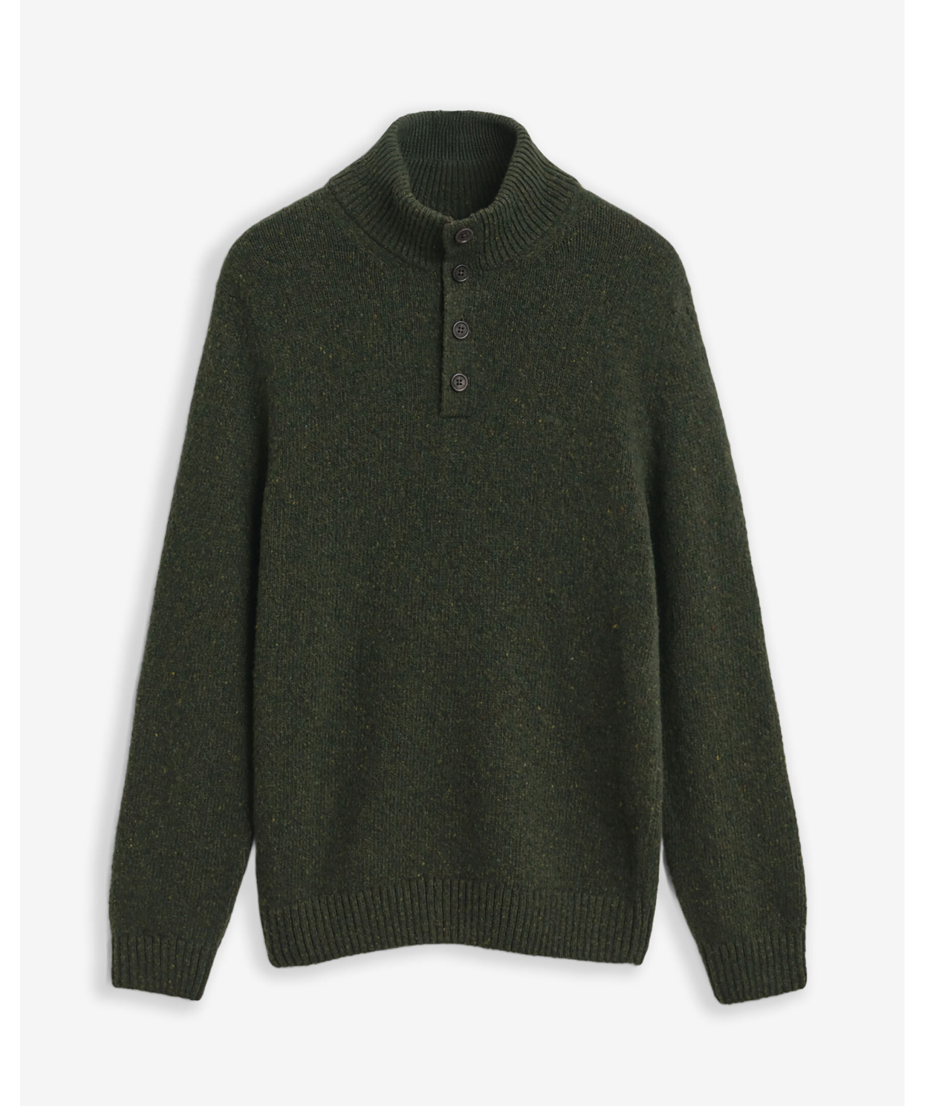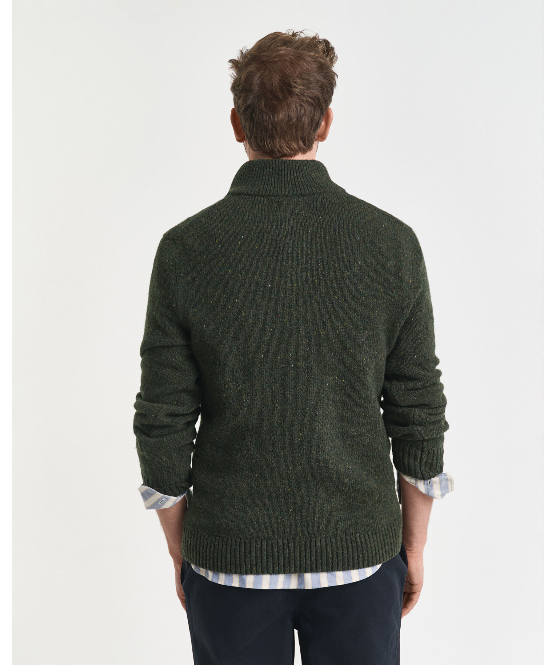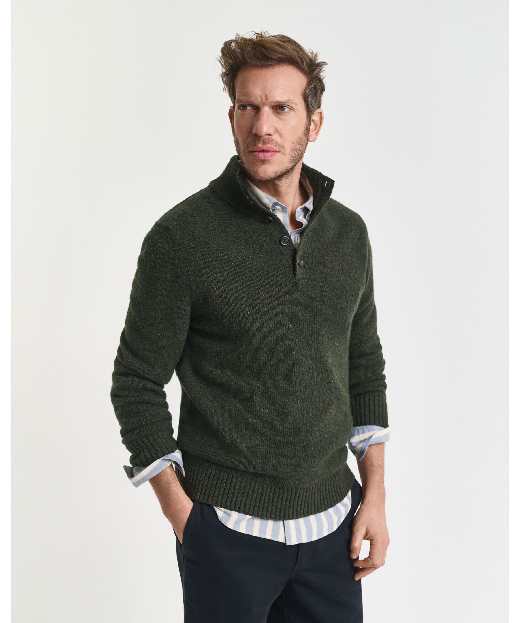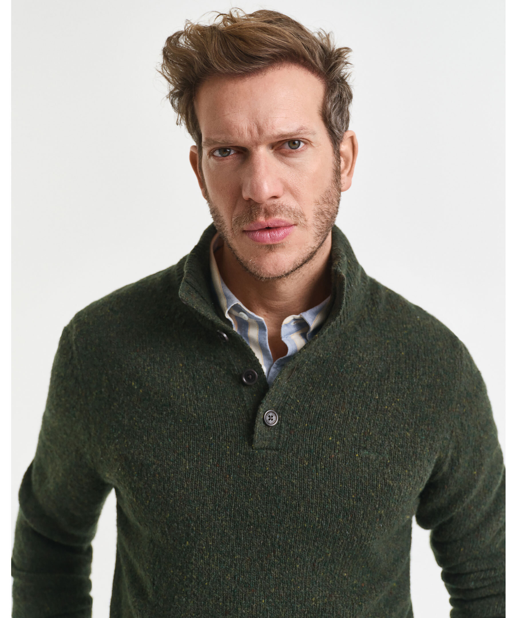 Mörkgrön, stickad tröja från Gant. Tröjan har en halvknäppt krage med corozo-knappar, ribbade muddar i nederkant och ärmslut, och en subtil GANT-logotyp broderad på bröstet. Tillverkad av en mjuk italiensk ullblandning med Nepps-garn, skapar en charmig spräcklig effekt.
