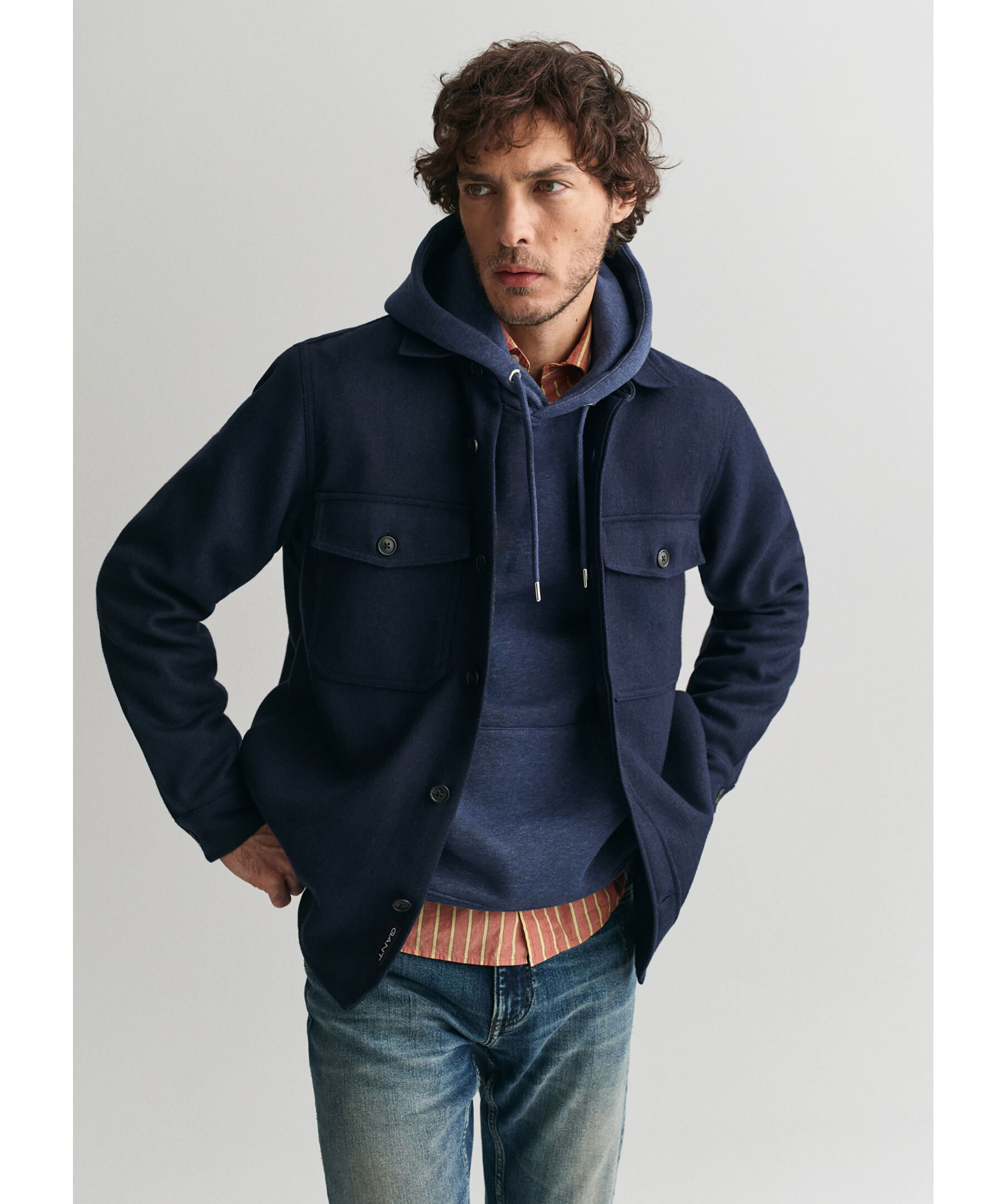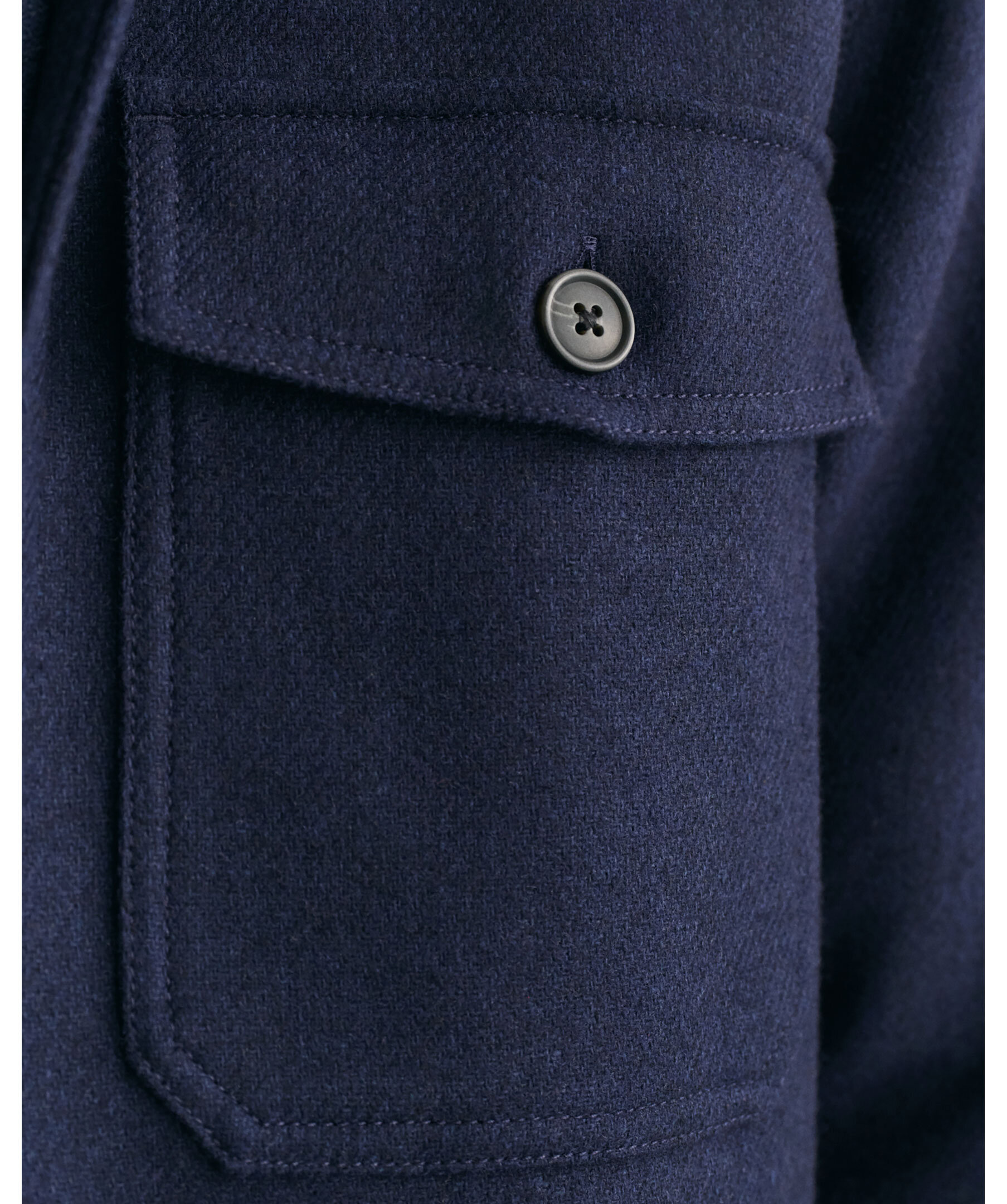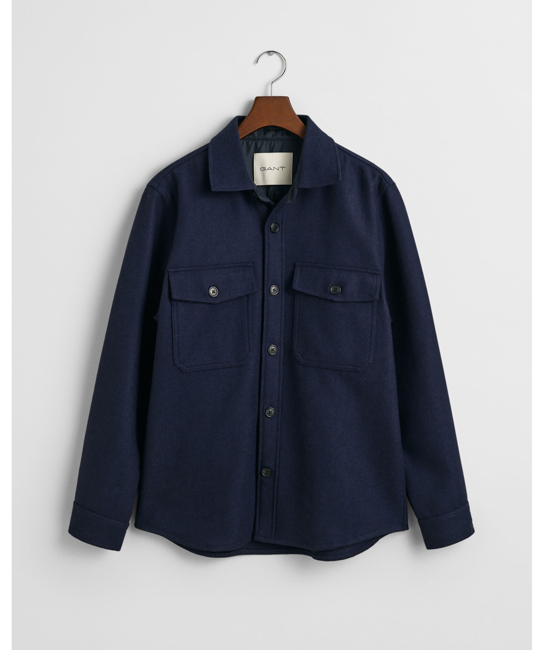 Mörkblå overshirt från Gant. Overshirten har justerbara ärmar, två stycken bröstfickor och stängs med knappar. Tillverkad av en ullblandning.