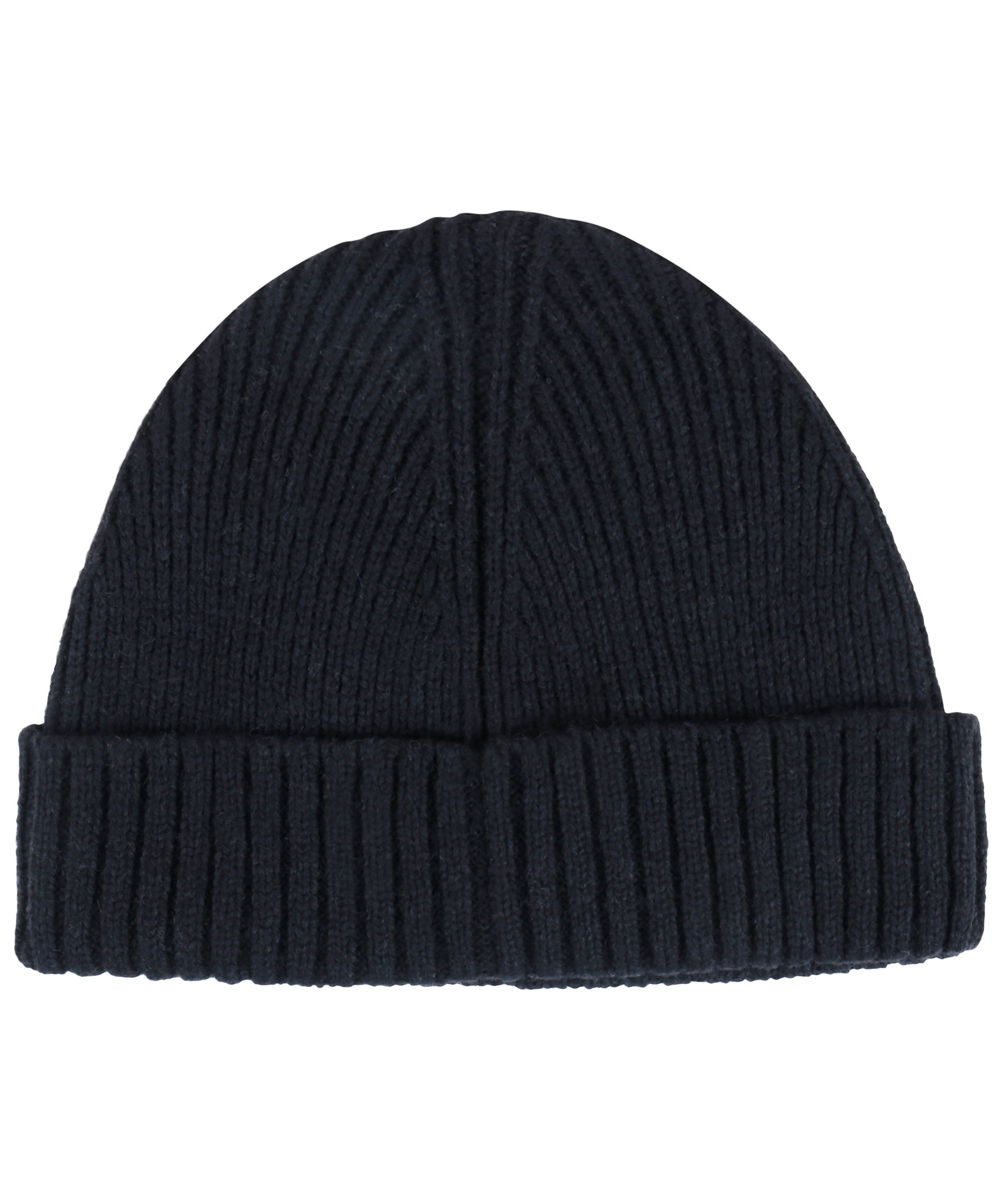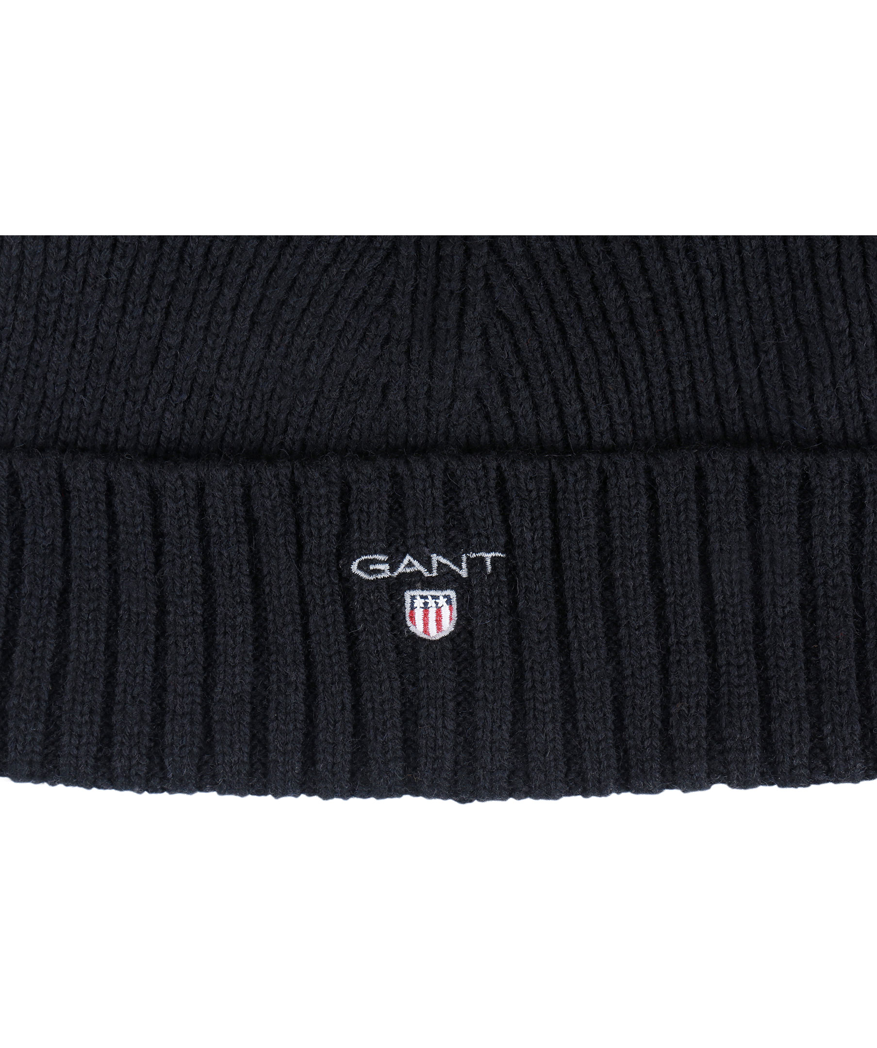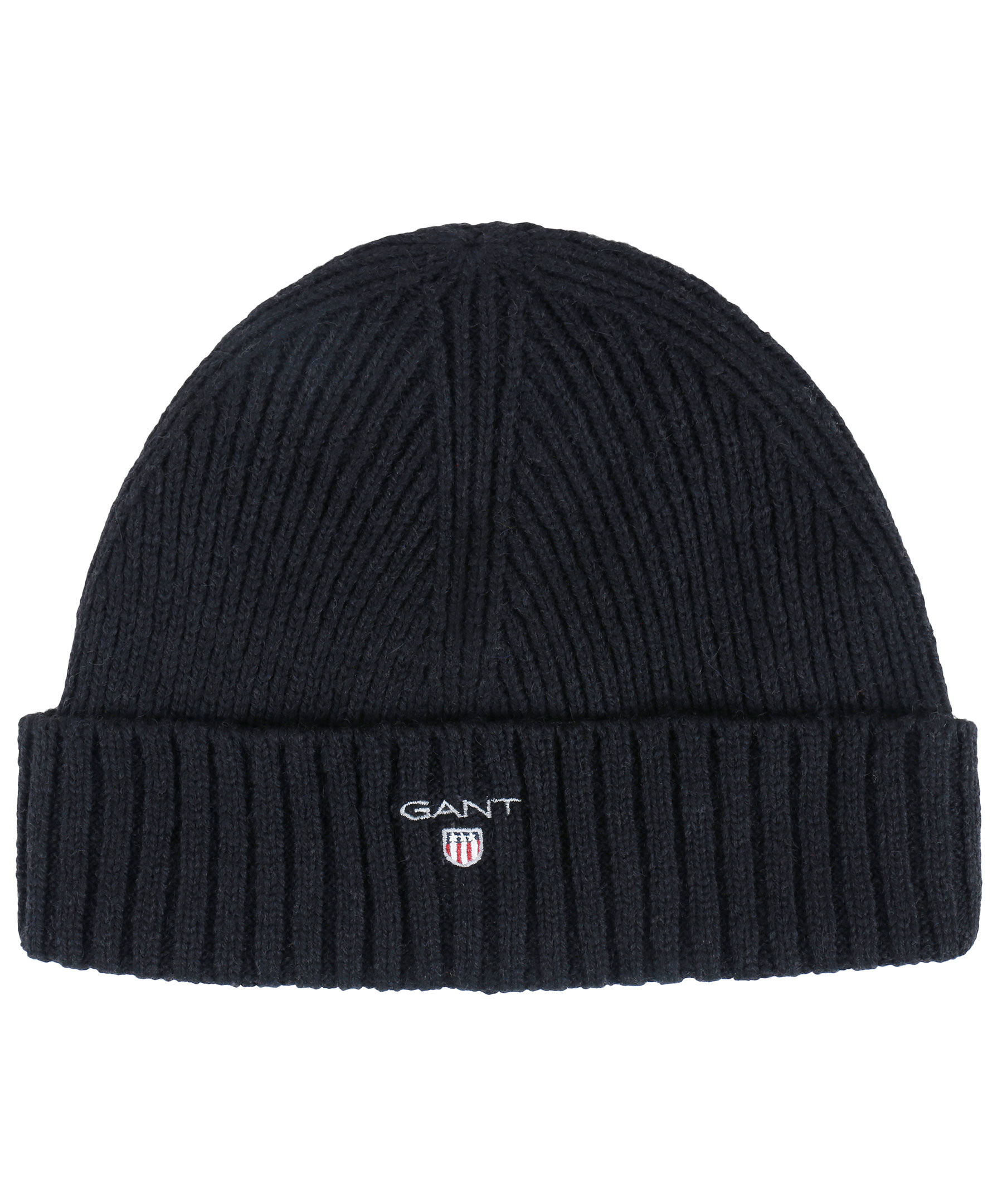 Svart, mellantjock ribbstickad mössa med uppvikt kant från Gant. Broderad logotyp fram. Gjord i ullblandning med grått foder i bomullsblandning.