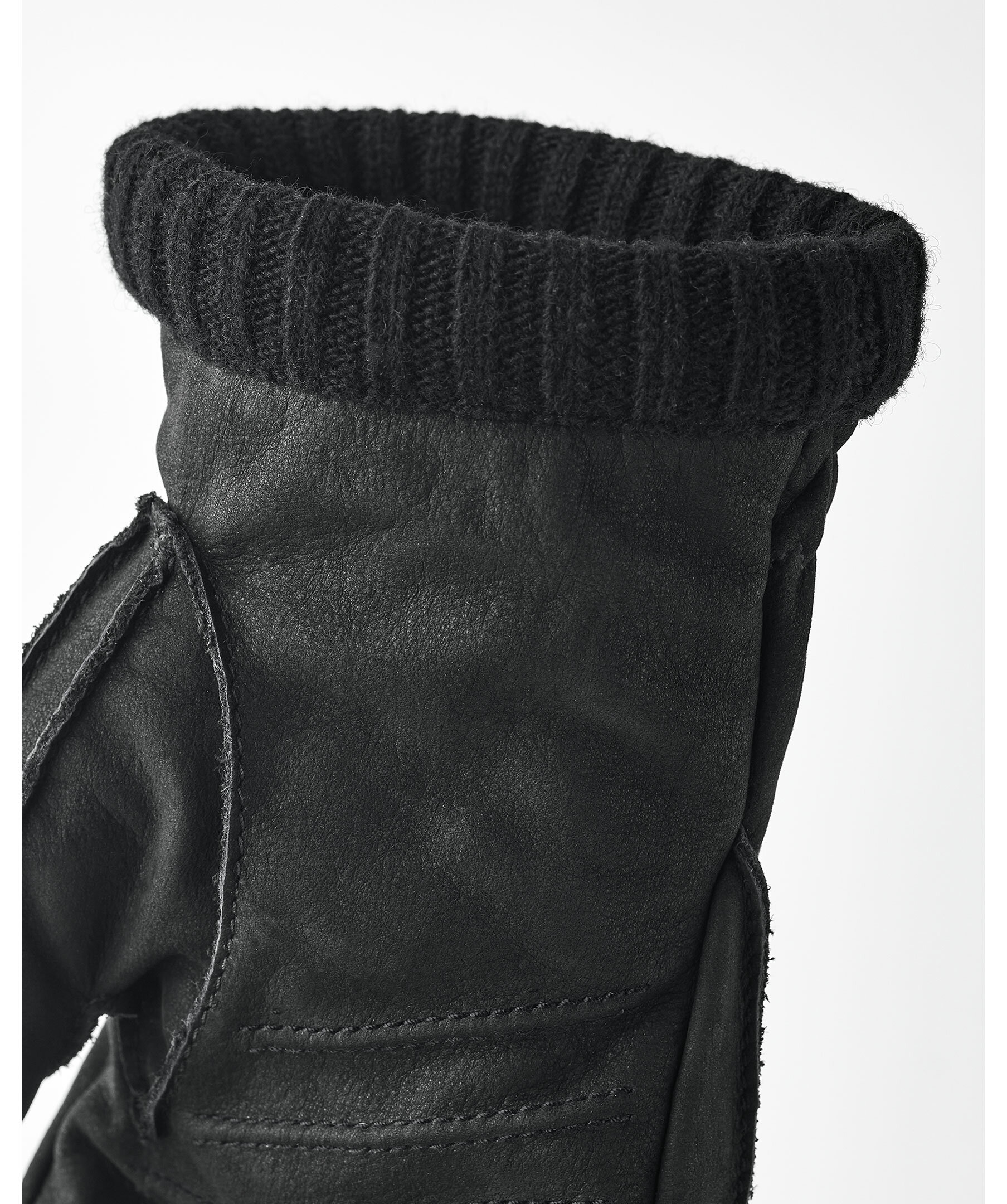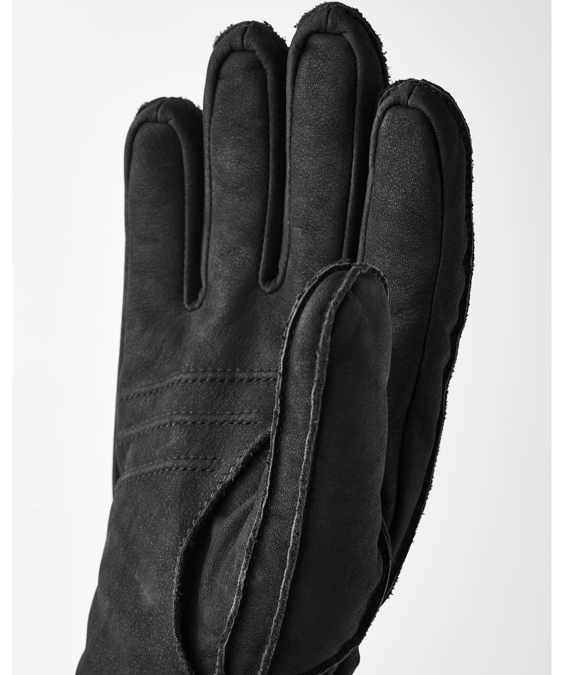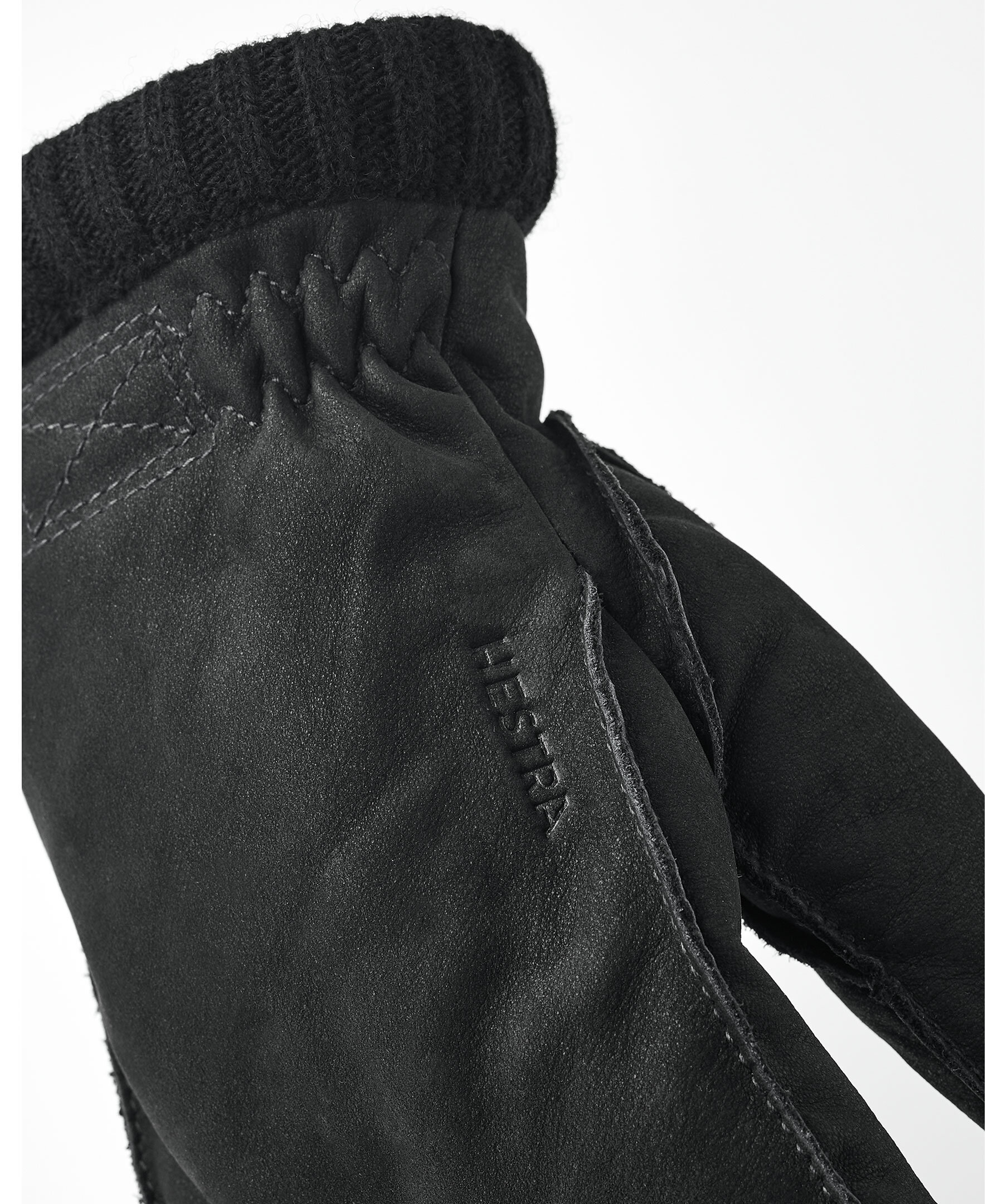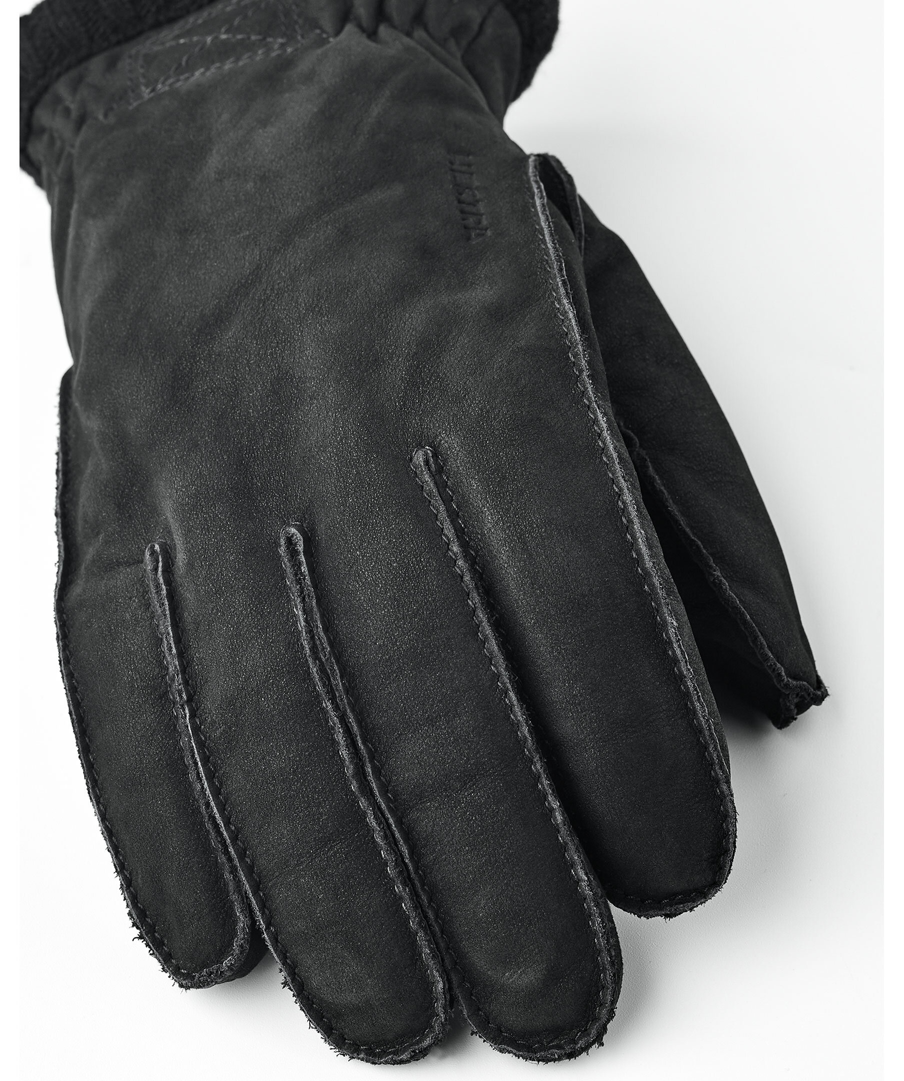 Svarta läderhandskar med robust mockakänsla från Hestra. Handskarna har fleecefoder inuti och Primaloft Gold isolerar under kyliga vinterdagar, ribbstickad mudd och logotyp på handskens ovansida.