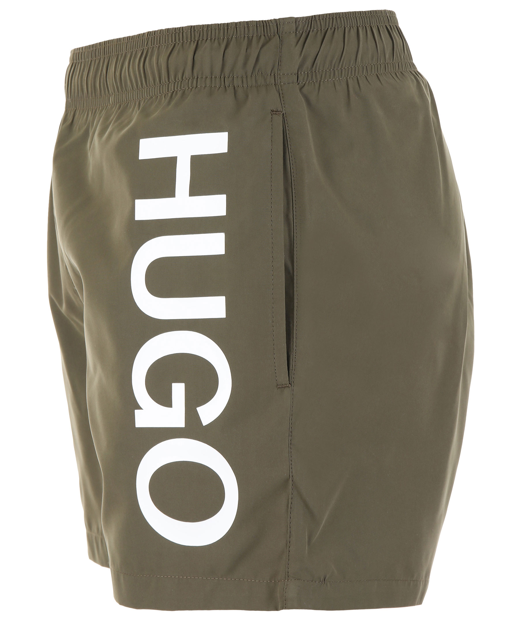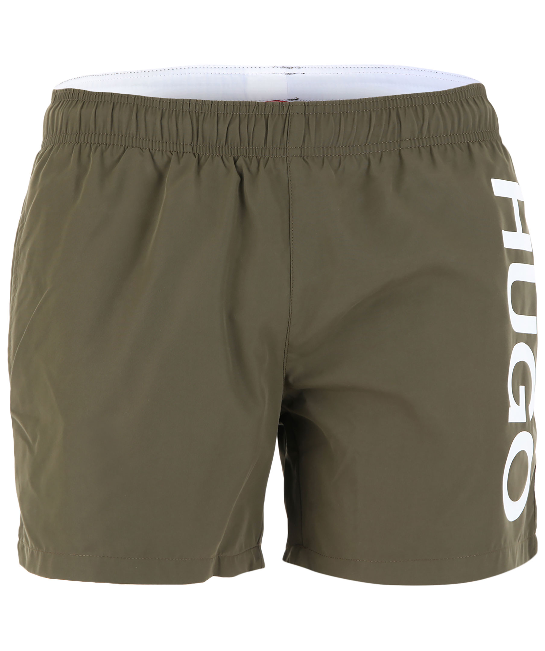 Gröna badbyxor från Hugo. Tillverkade i polyester. Vitt foder, knyt på insidan i midjan, vit logotyp på vänster byxben.