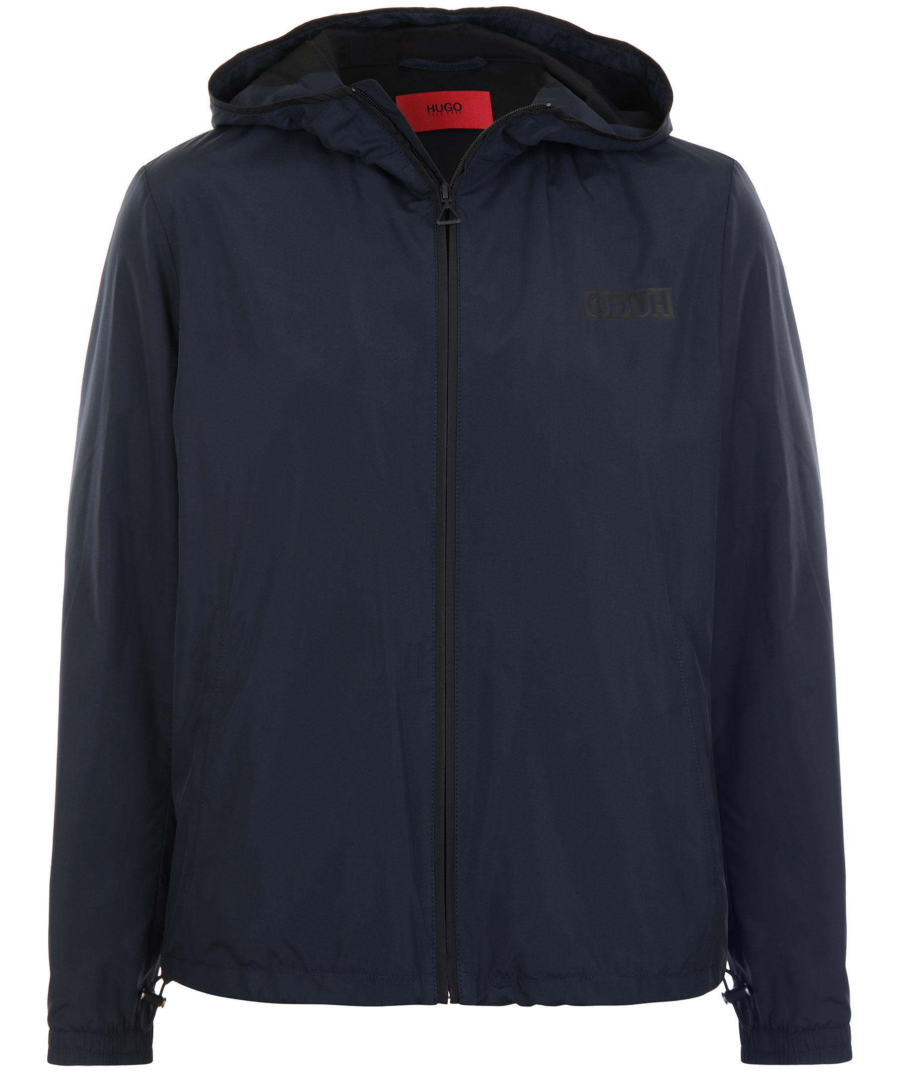 Marinblå softshelljacka med huva från Hugo. Två framfickor med tryckknappar och en innerficka med dragkedja. Tryckt logga på vänster sida av bröstet. Stängs med dragkedja fram och tunn mudd i ärmslut och dragsko nertill. Tillverkad av 80% återvunnet material.