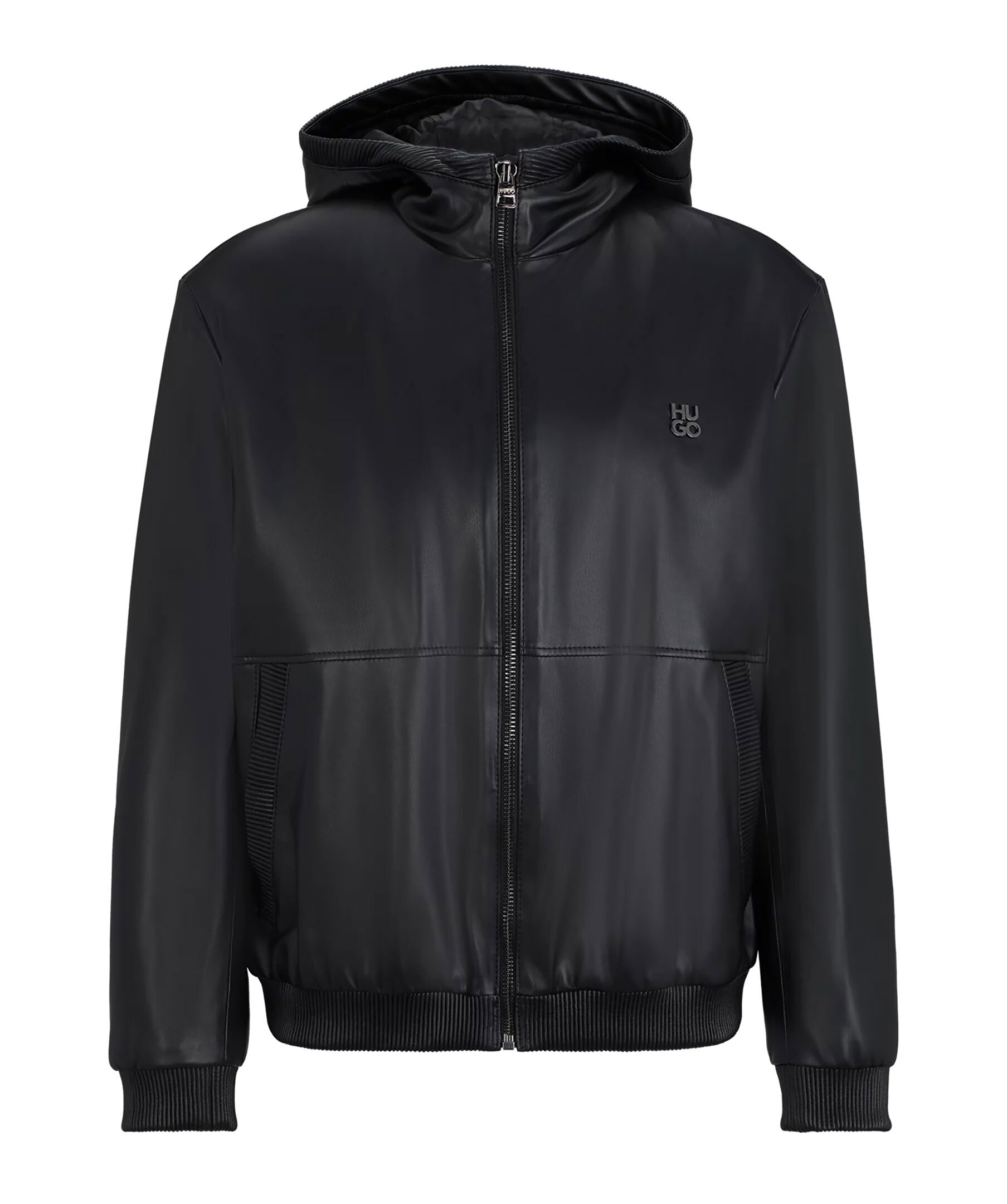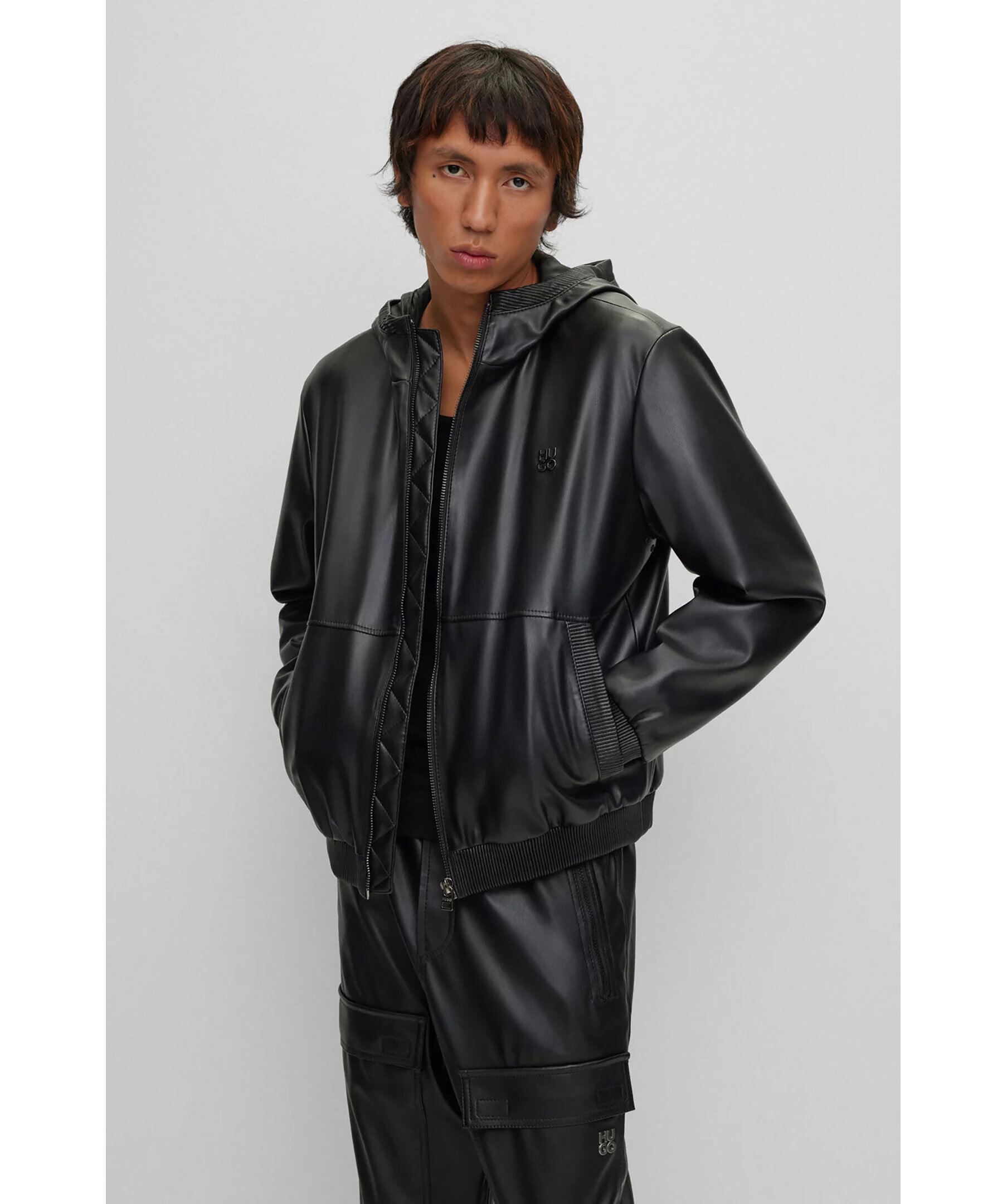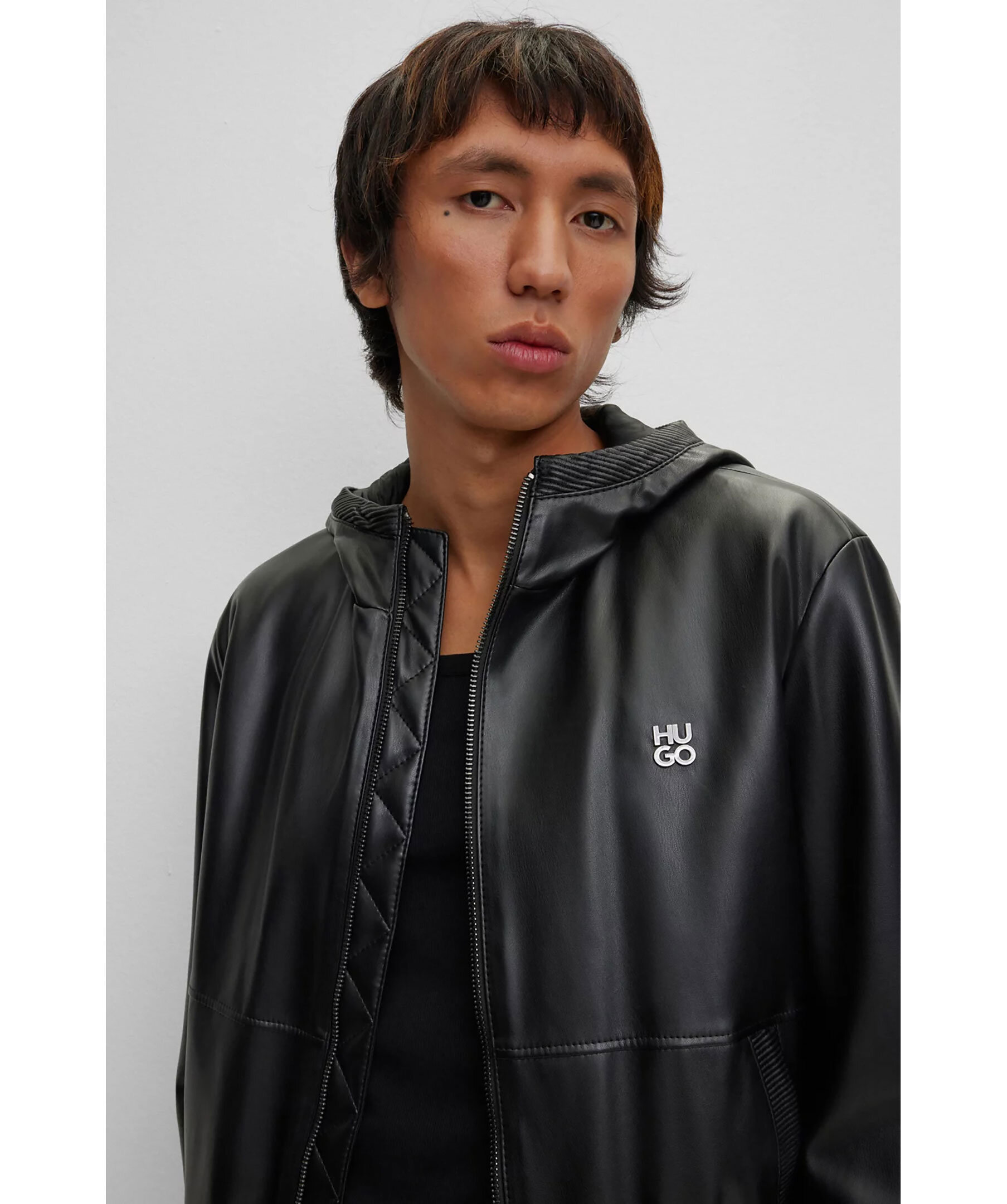En svart modern huvjacka från HUGO Herr, designad i syntetmaterial med dragkedja framtill och en staplad logga. Jackan har två sidfickor och ribbade muddar vid ärm- och plaggslut. Syntetmaterial, som ibland kallas ”läderimitation”, är ett material som är utformat för att likna äkta läder och/eller ha en matt, glansig, mjuk eller texturerad yta.